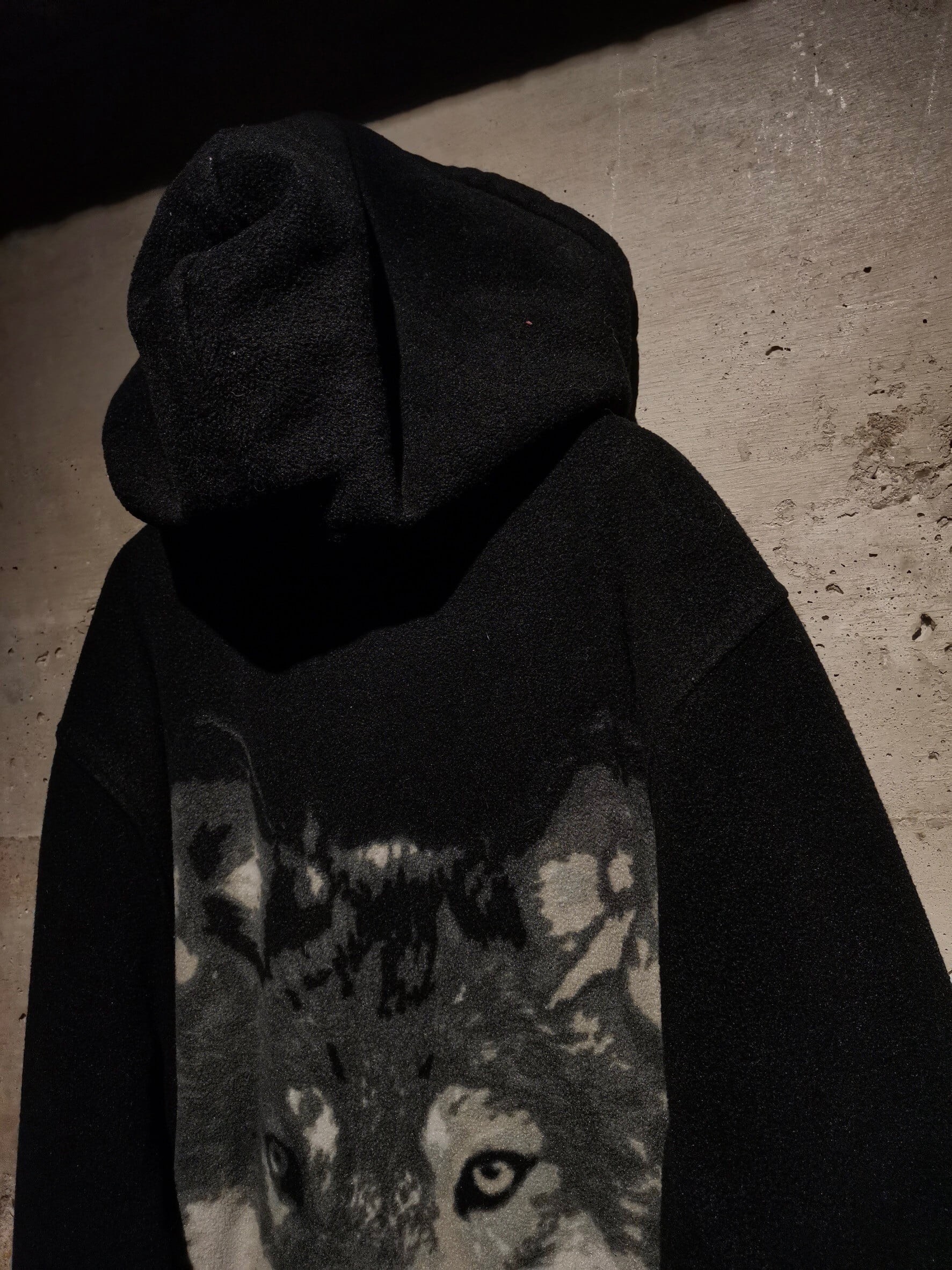 フワッと心地の良い軽く柔らかな毛足のボディに、フロント、バックにオオカミのデザインを載せ、モノトーンのカラーリングで仕上げたフリースジャケット。