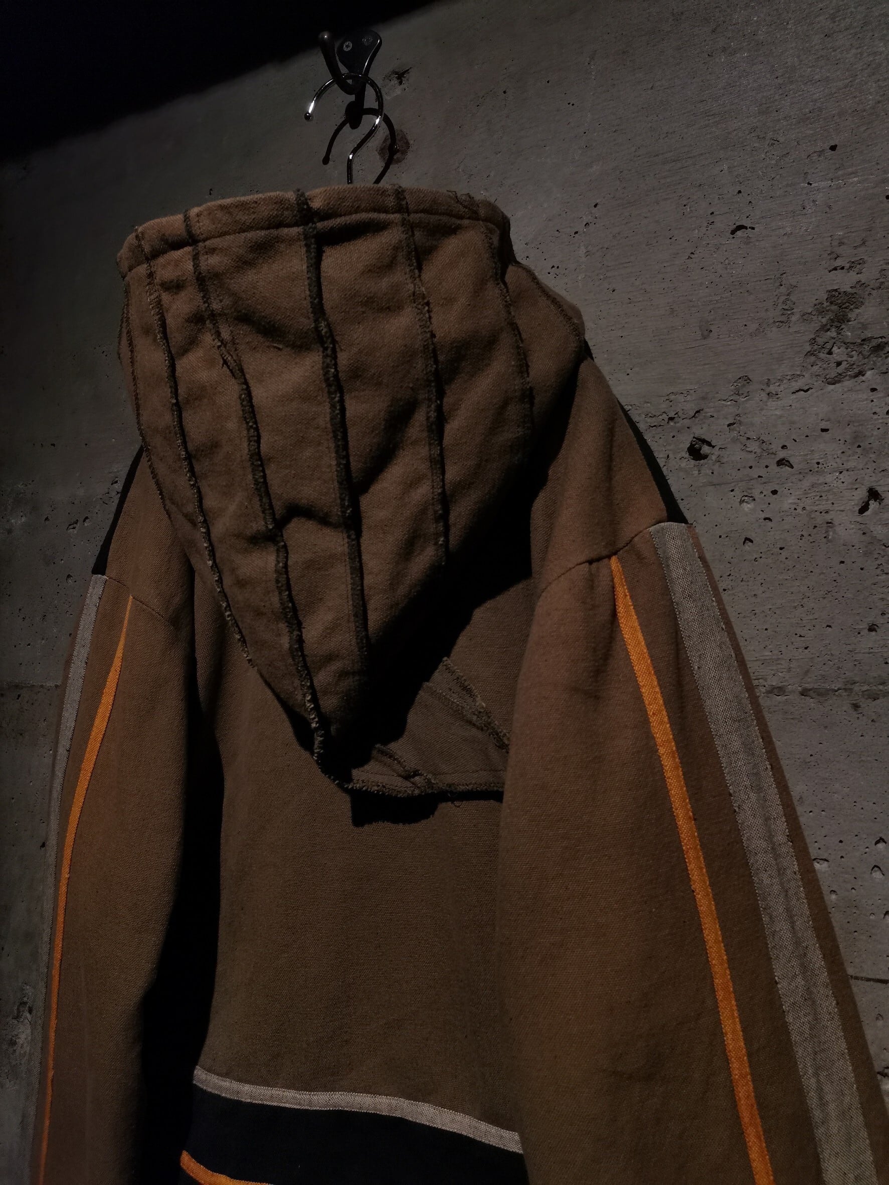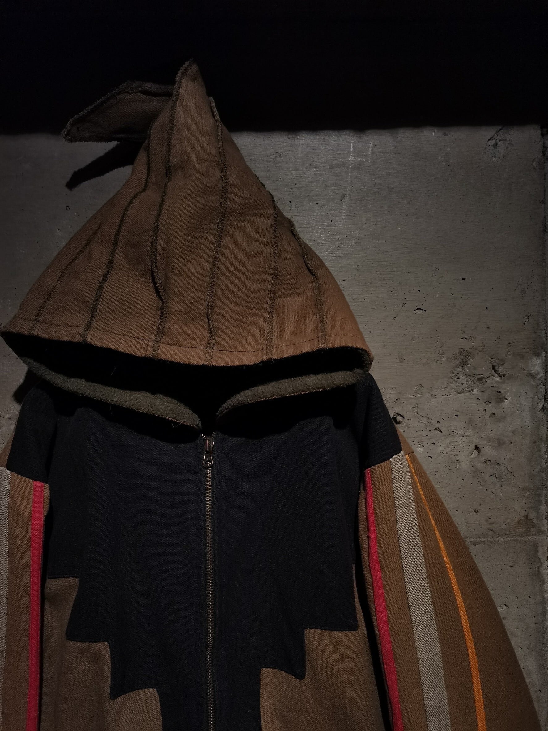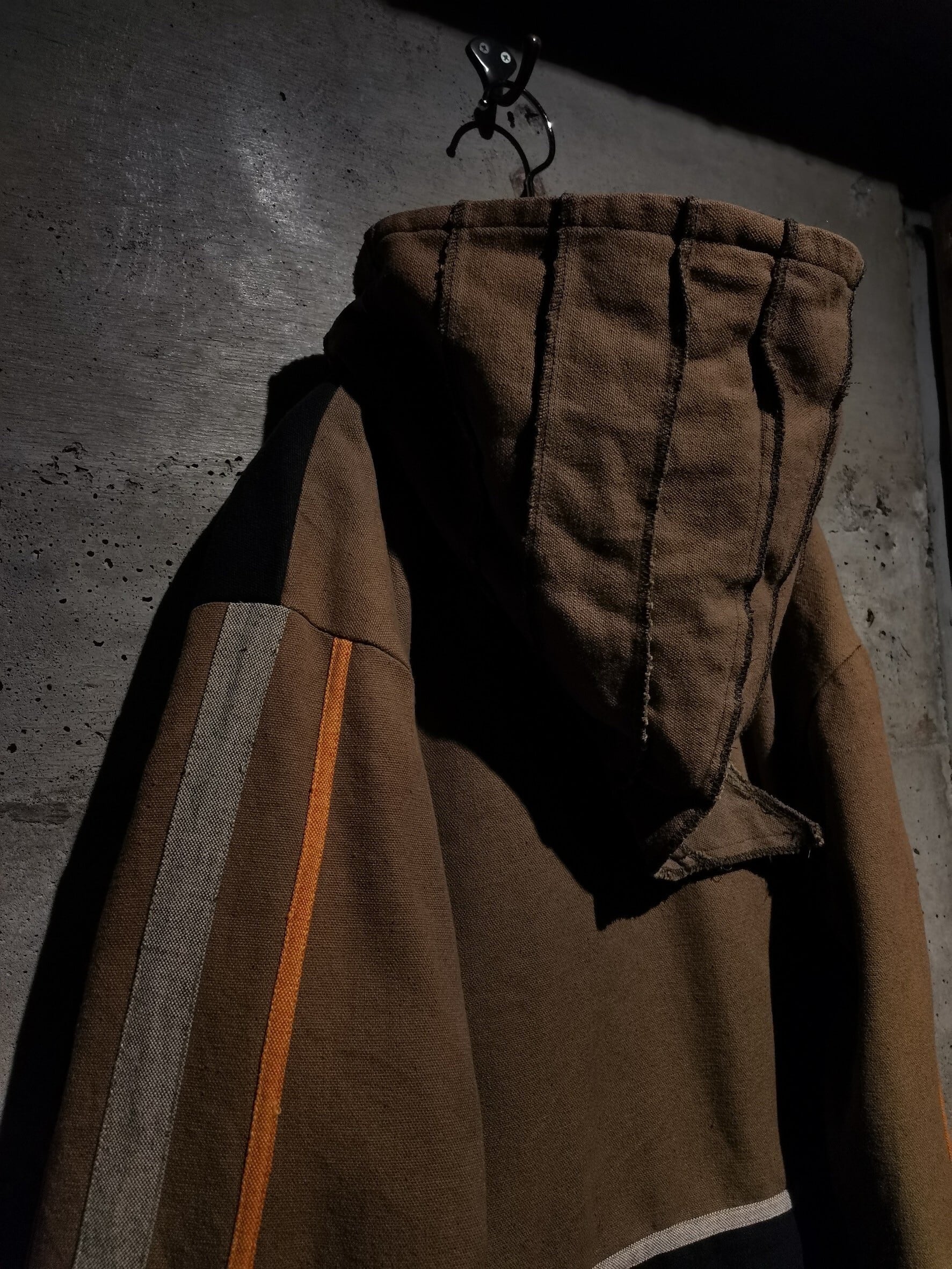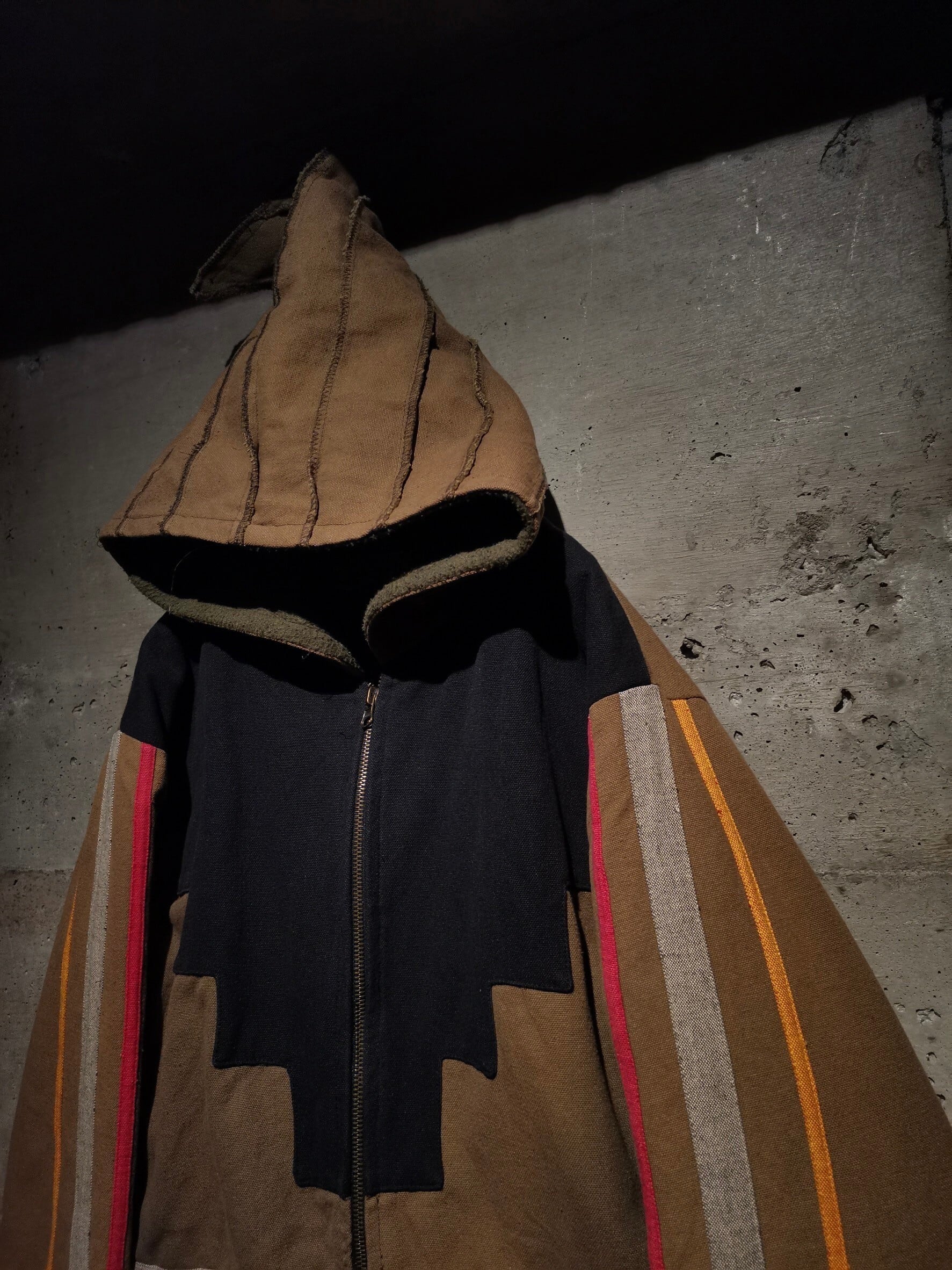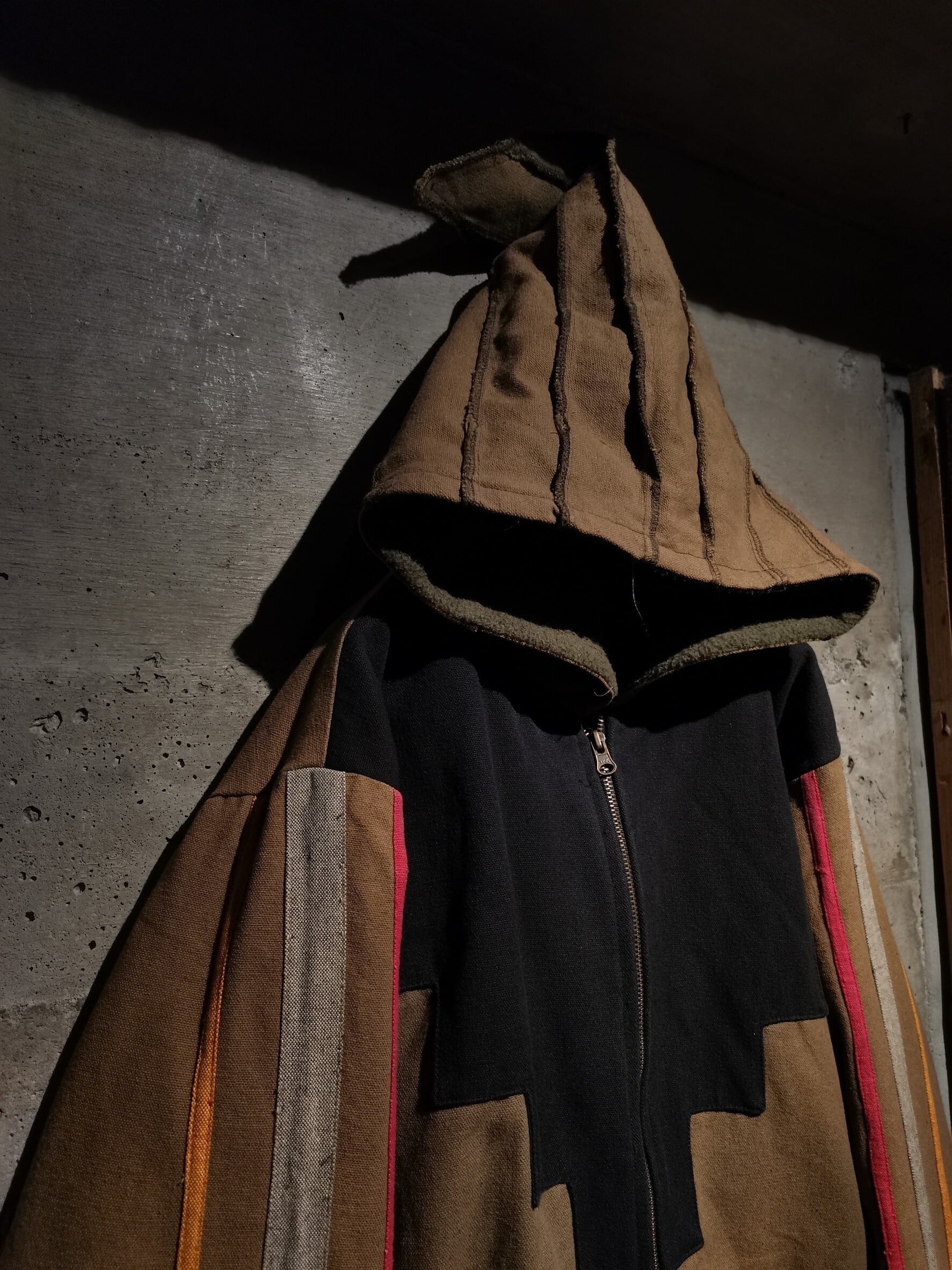 ガシッとハリのあるブラウンのボディに、ジグザグの切り替え、ラインを走らせた、エスニックな雰囲気を見せるネパール製のフーディージャケット。