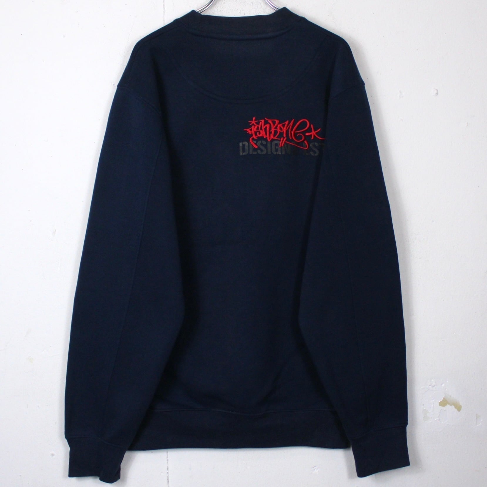 ネイビーのボディをベースに、鮮やかな赤色のプリント、その上から立体感のある刺繍でブランドネームを載せた1着。