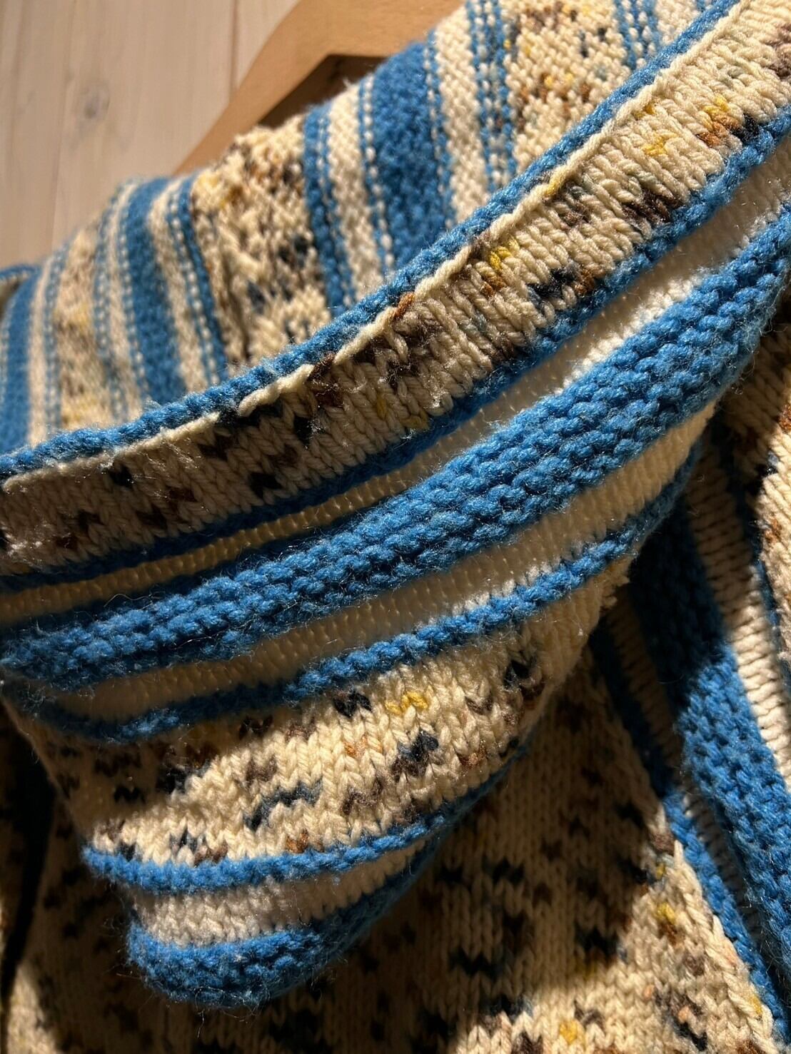 生成りをベースに多彩な色をボディに編み込んだボディに、ニッティング方法を切り替え立体感のあるラインのデザインを施したユーロヴィンテージ、イタリーメイドのジップアップニットフーディ。