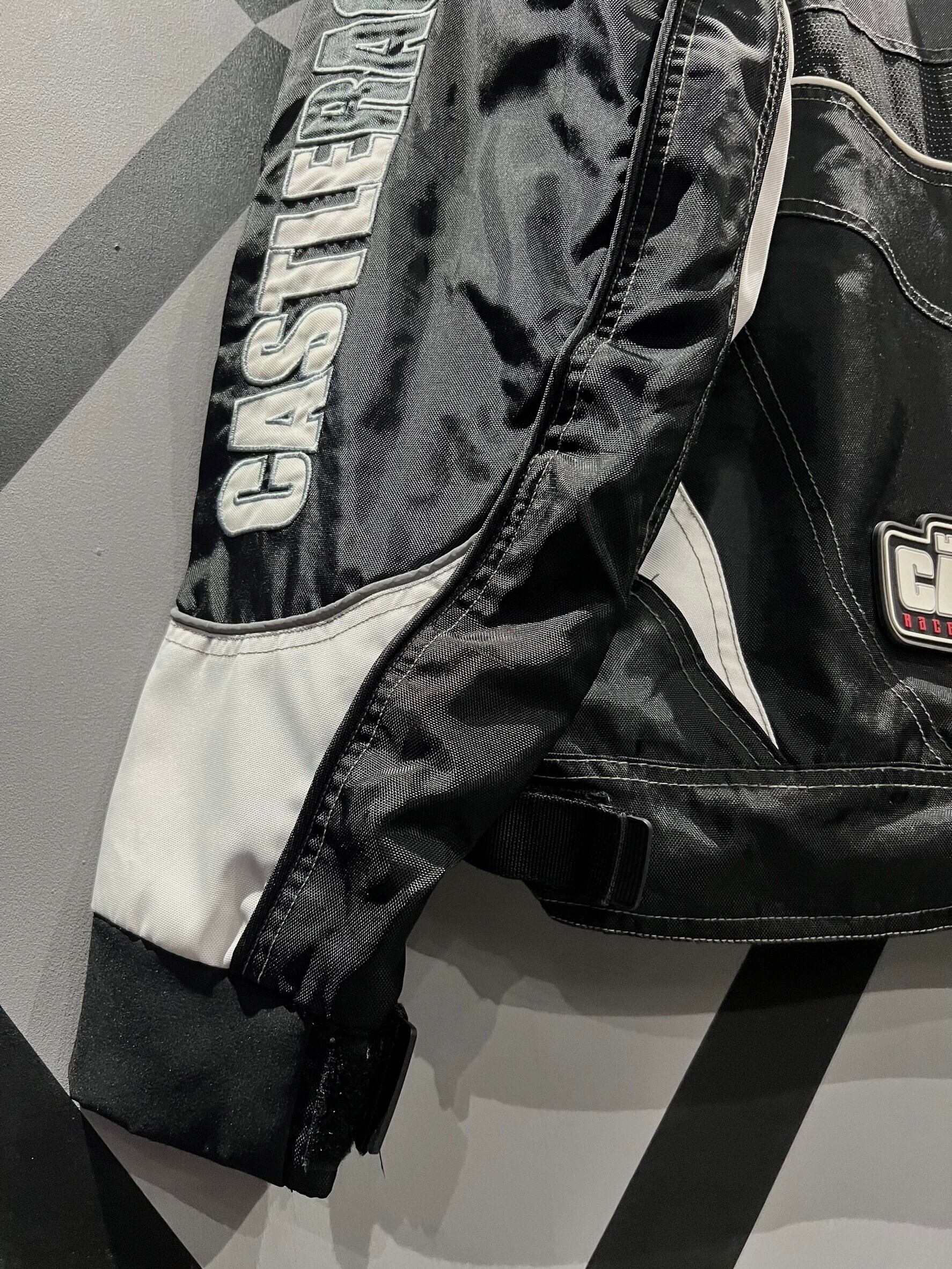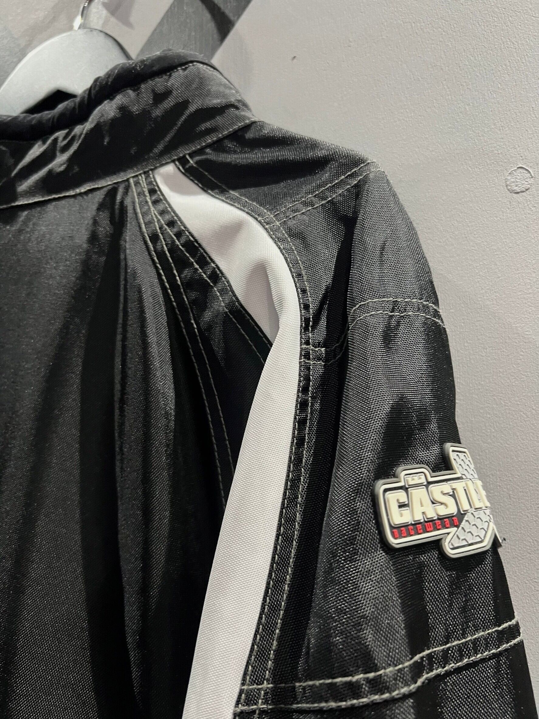 パキッとしたナイロン素材をベースに、ブラック×ホワイトで切り替えたレーシングジャケット。この手のアイテムはエッジの効いたカラーリングが多い中、モノトーンの配色は珍しいですね。