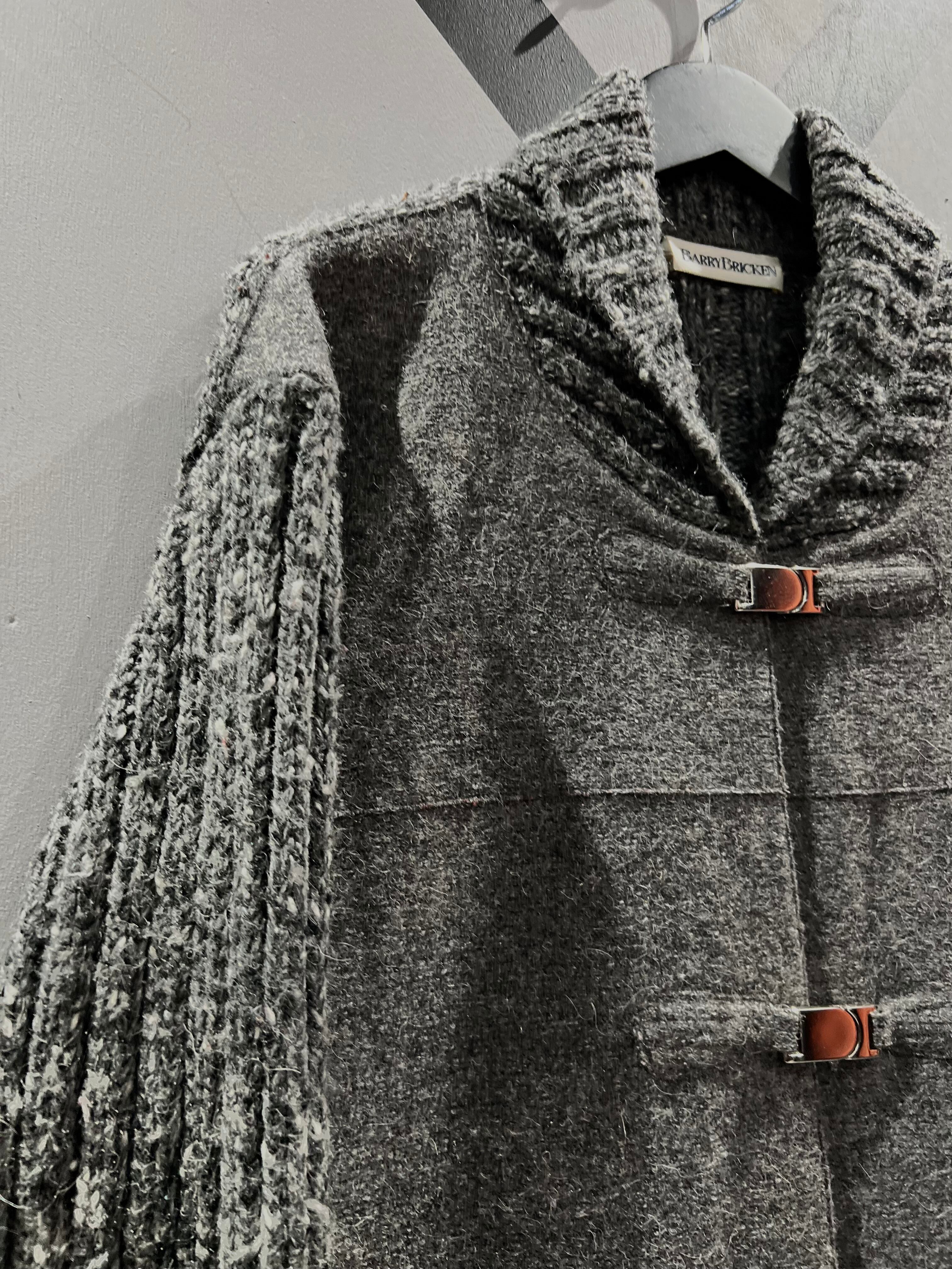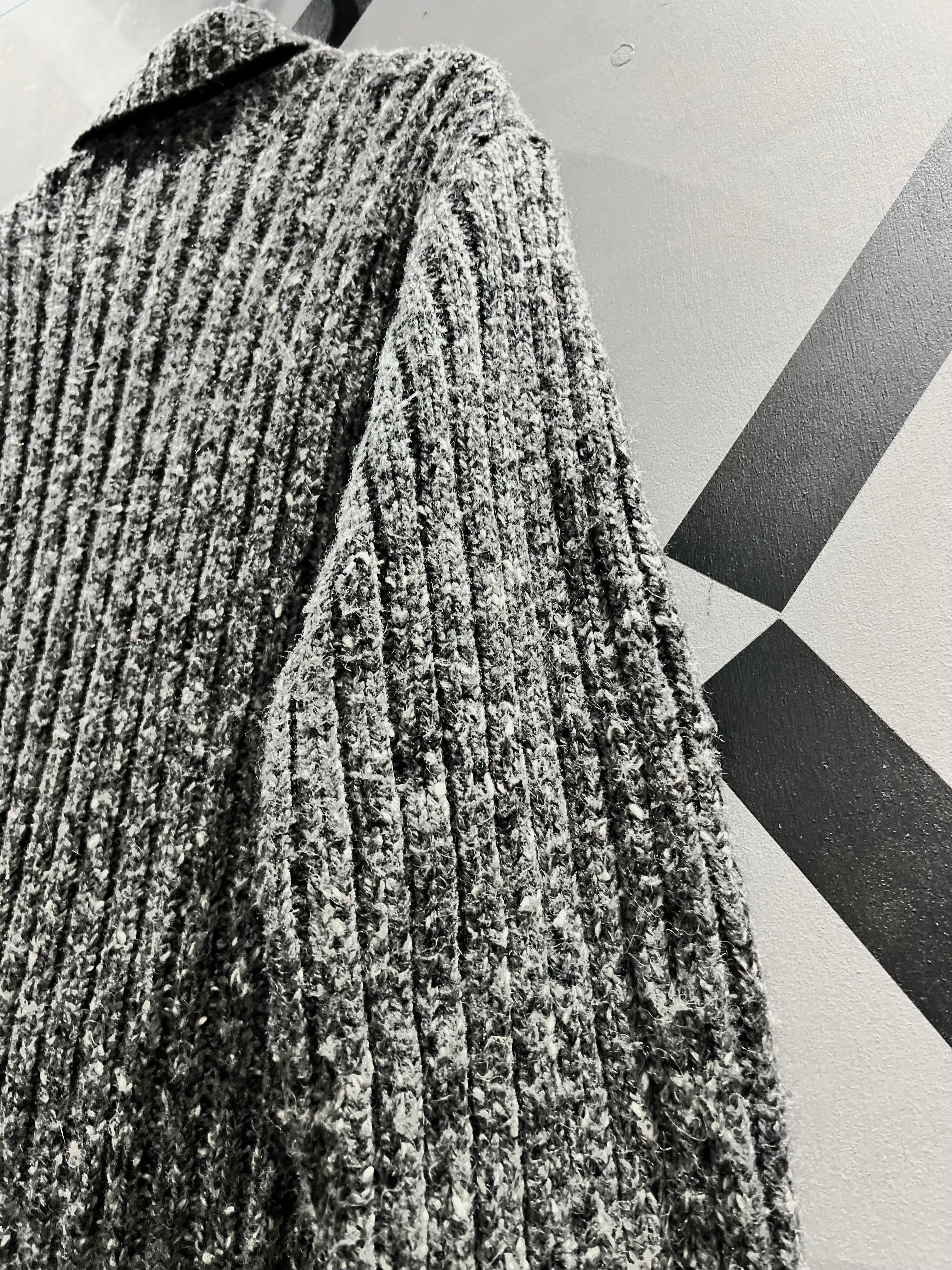 フワッと柔らかなグレーのリブニットを用いたボディに、前身頃にウール生地を切り替えたニットジャケット。