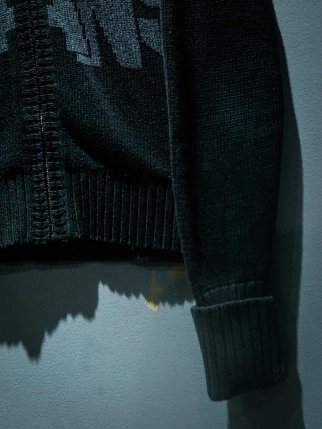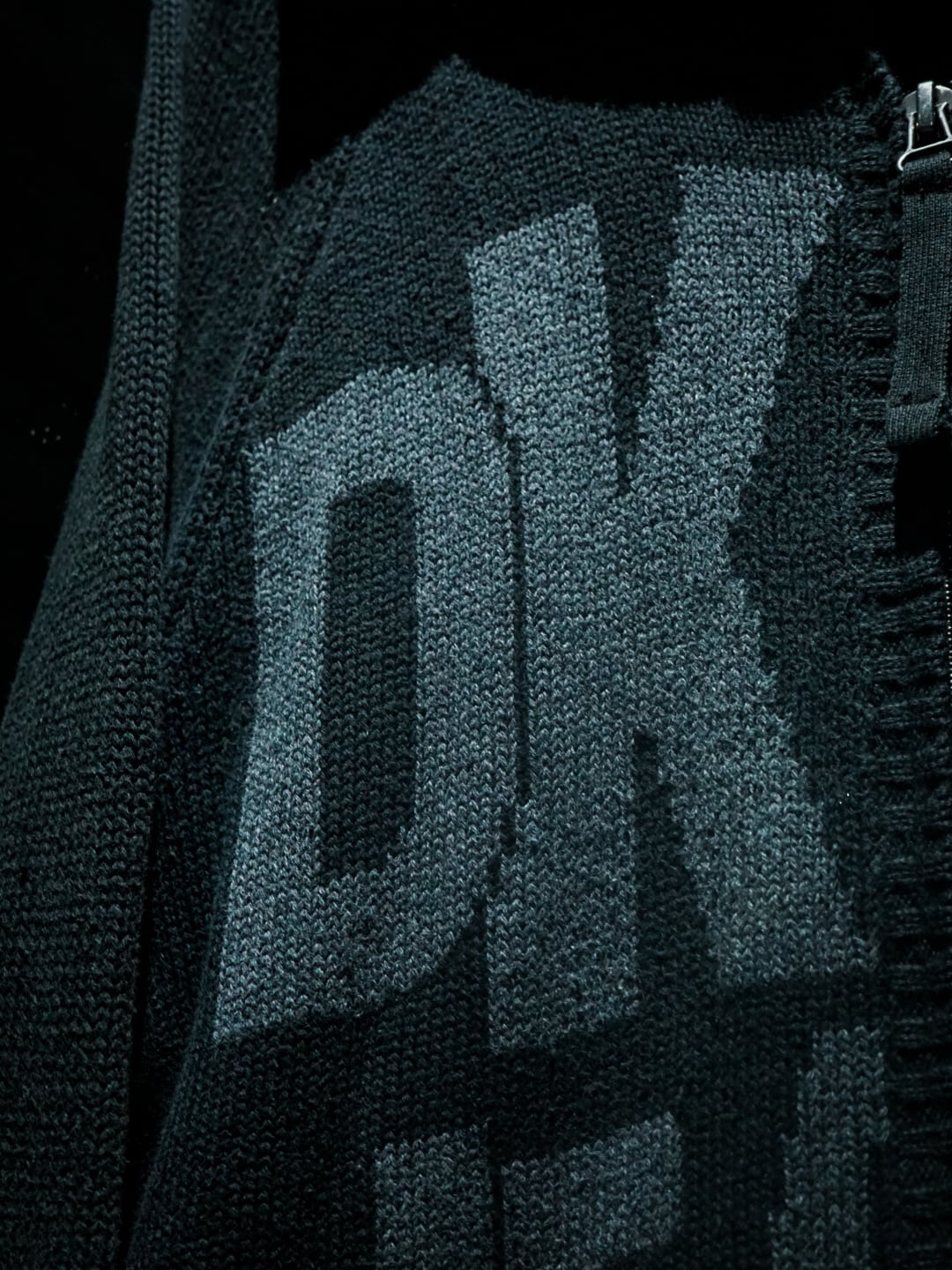 若干の肉感がある、サラリとした肌触りのコットンをベースに、フロントにはブランドロゴを大胆にニッティングで表現したジップアップニットフーディ。