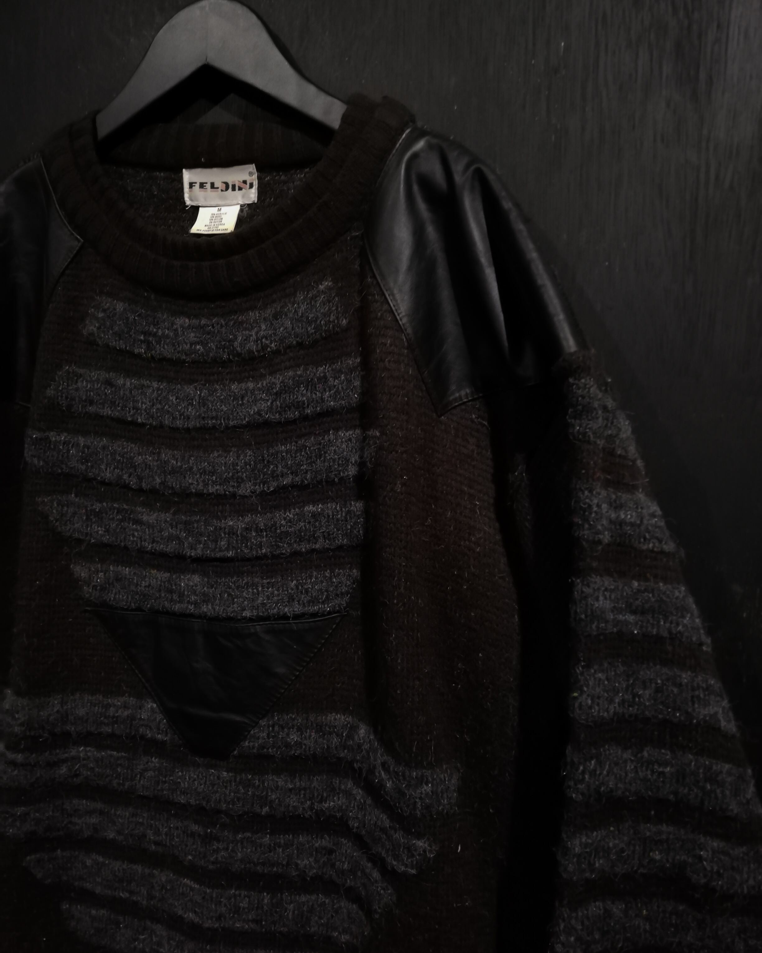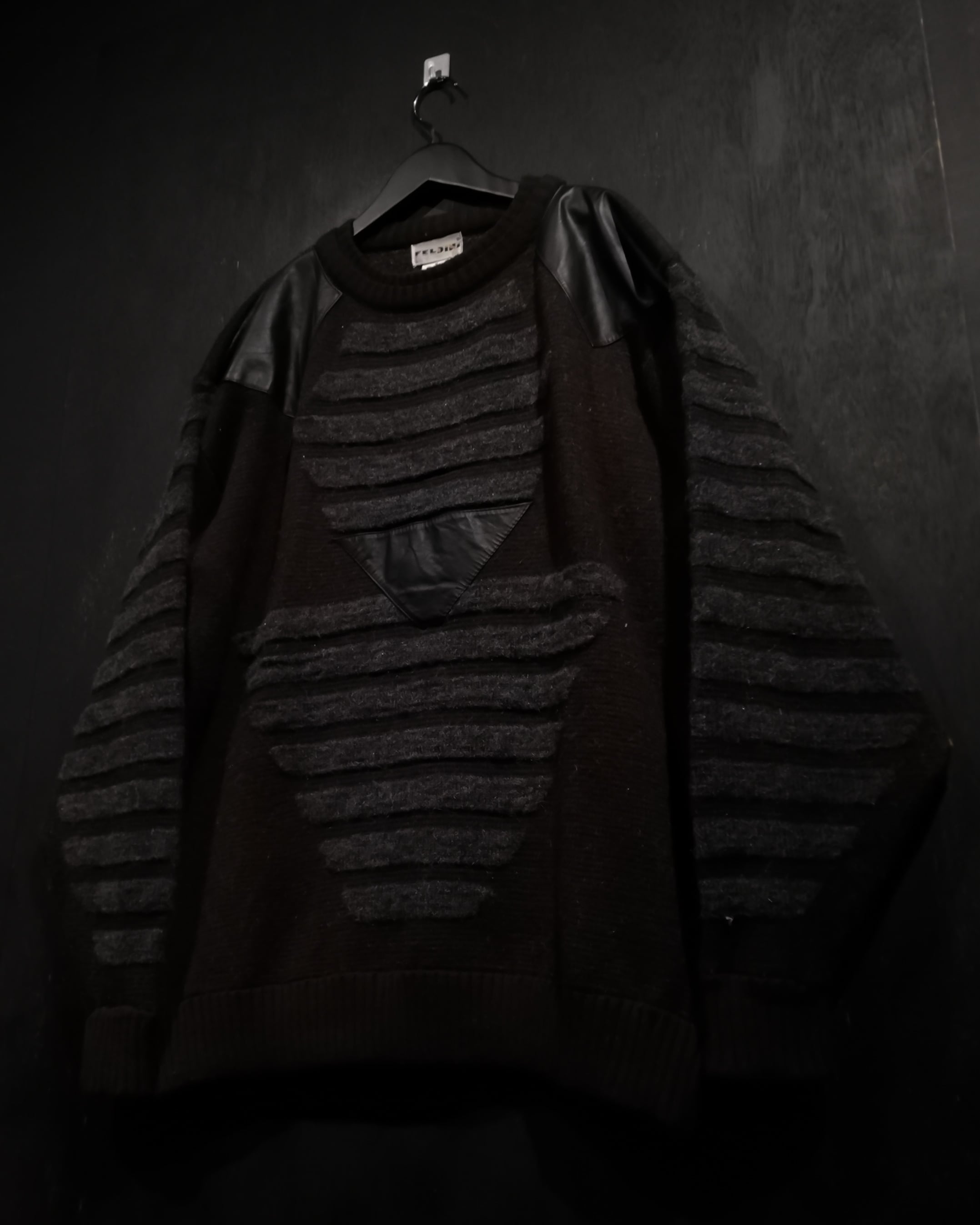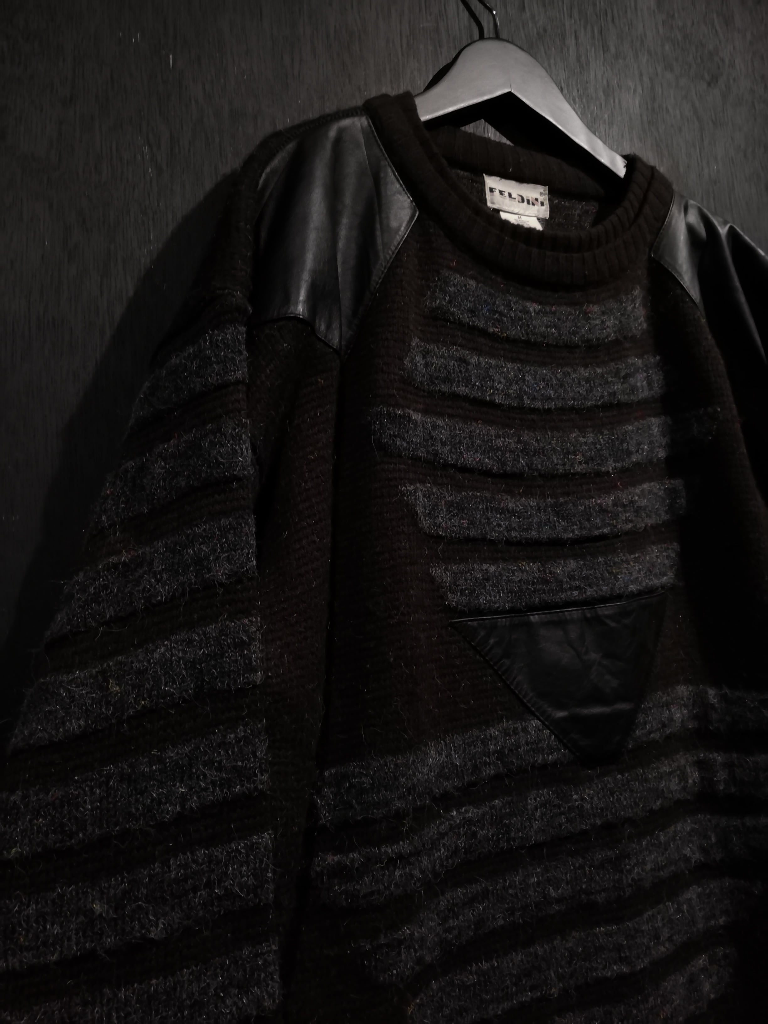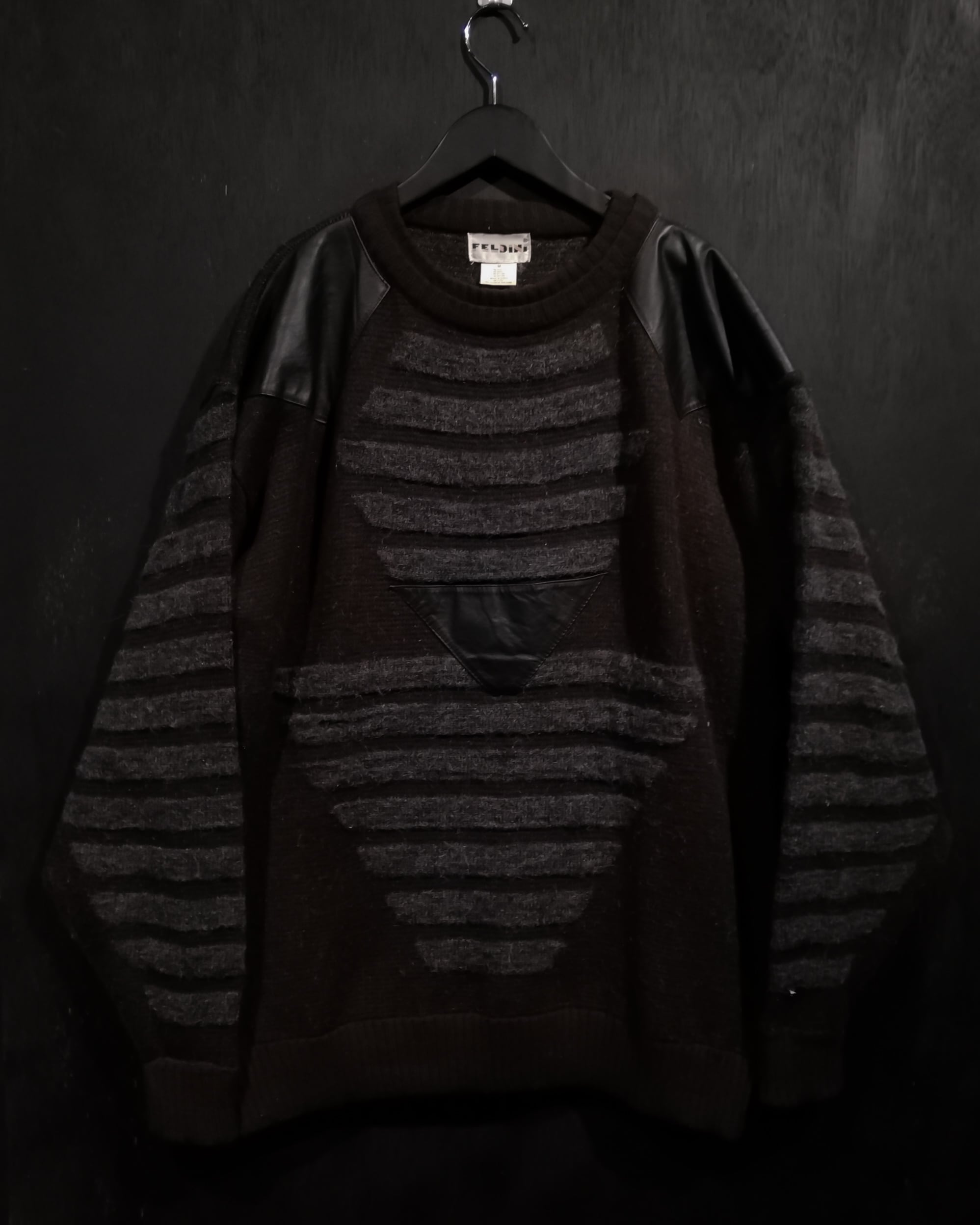 編みによってブラウンにグレーのボーダー状のデザインを立体的に編み込んだボディに、肩、フロント中央にレザーを切り替えた稀有なプルオーバーニット。