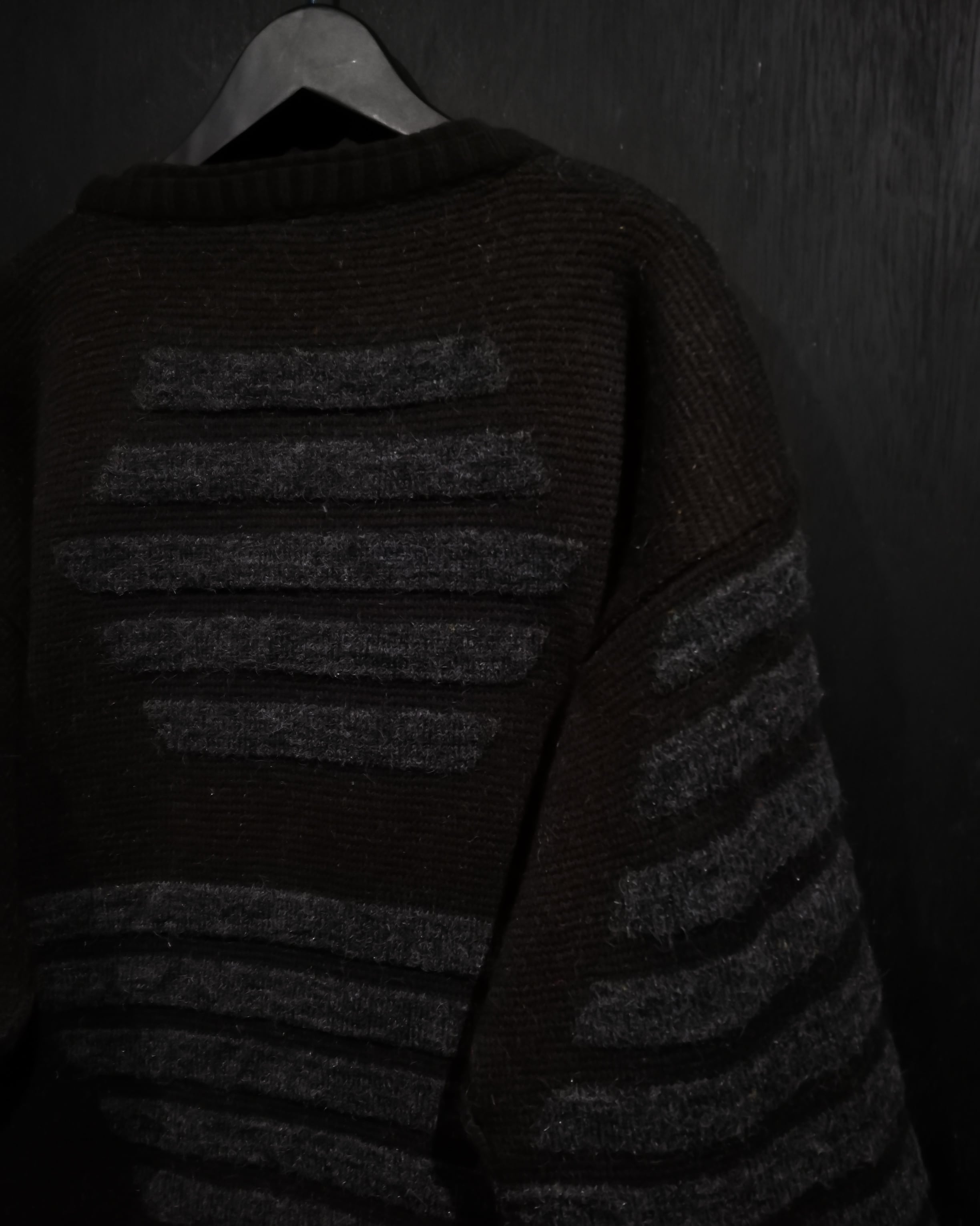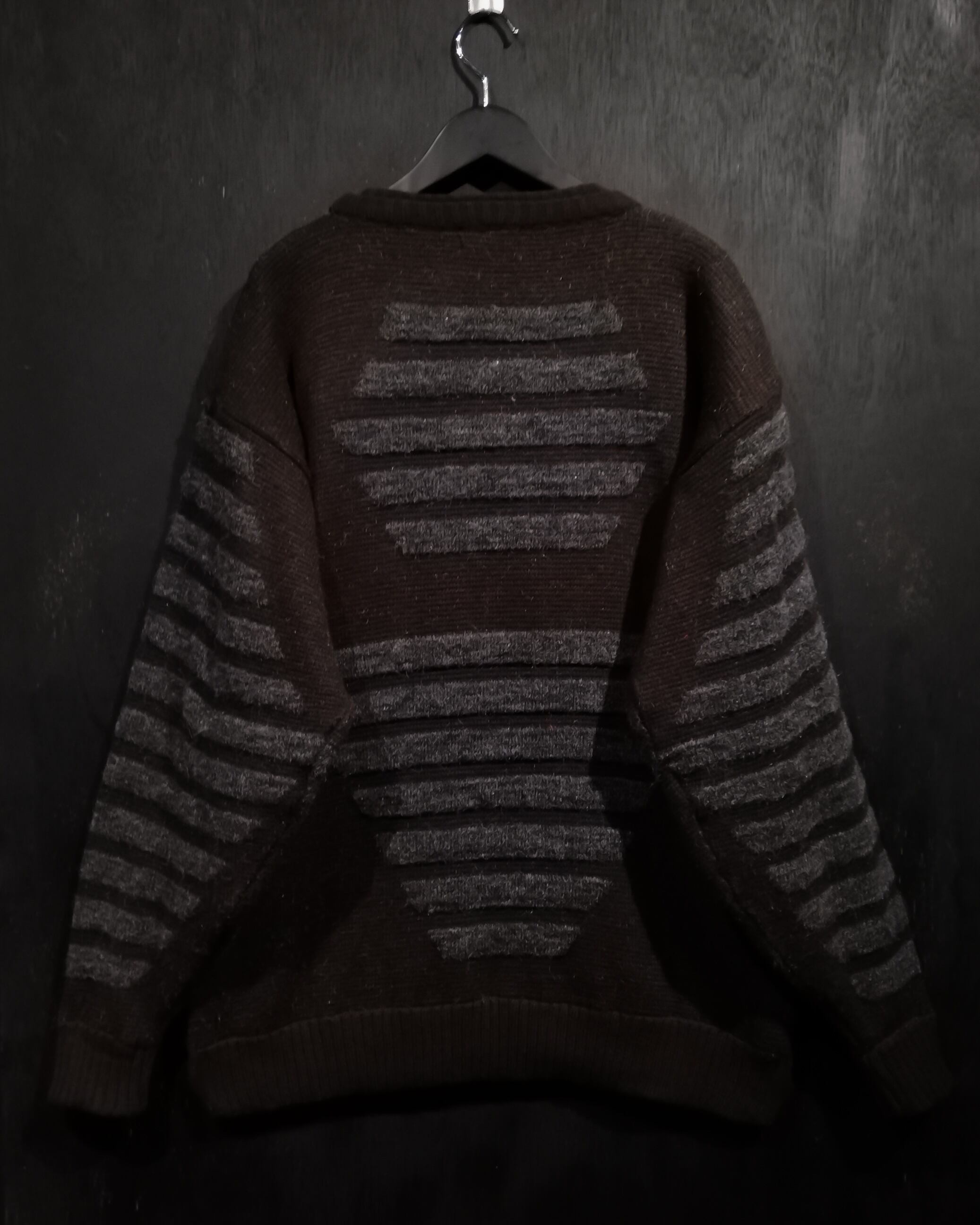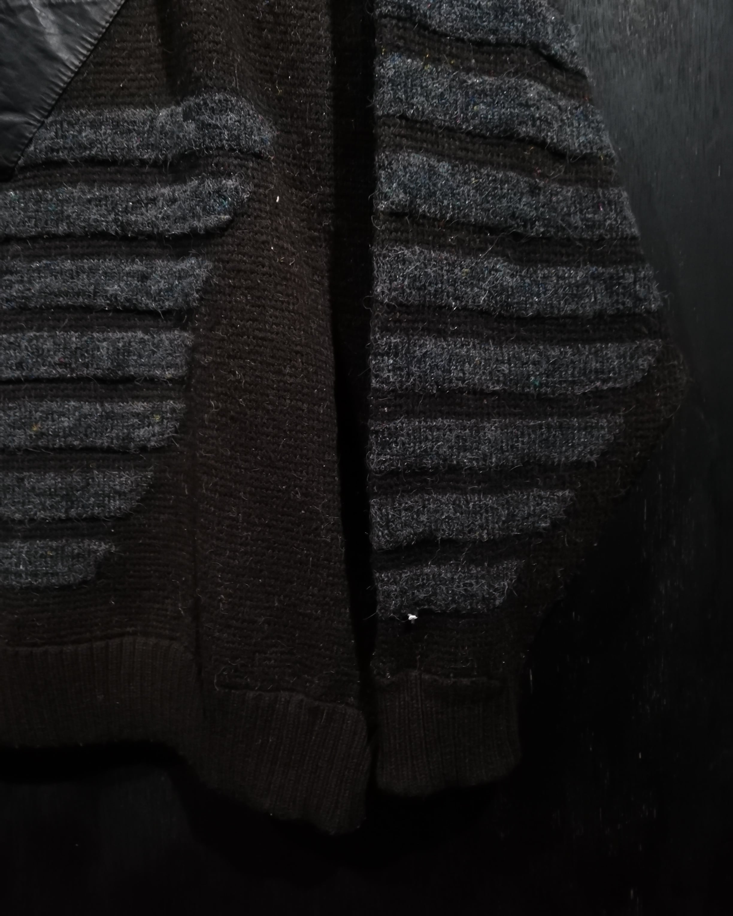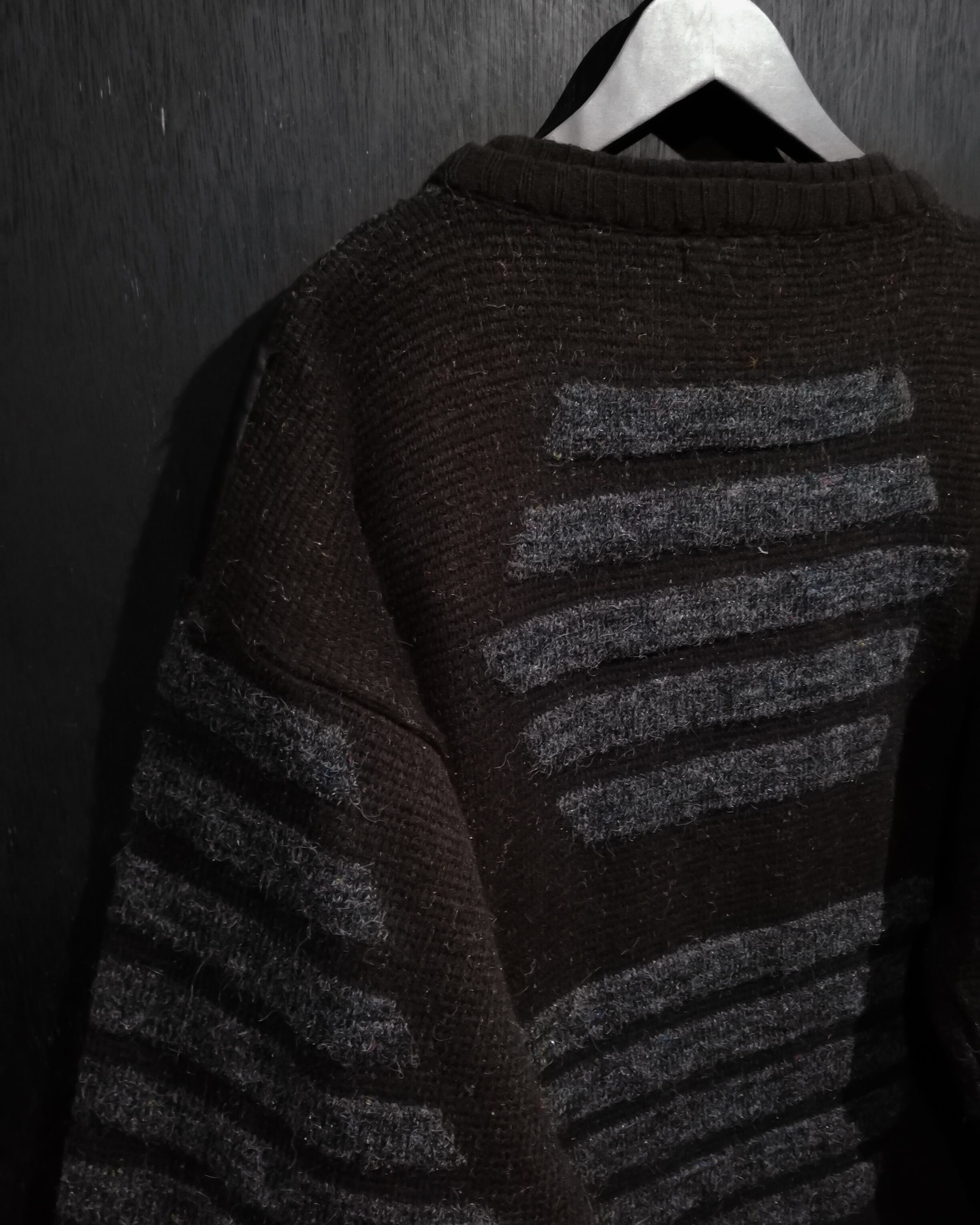 編みによってブラウンにグレーのボーダー状のデザインを立体的に編み込んだボディに、肩、フロント中央にレザーを切り替えた稀有なプルオーバーニット。