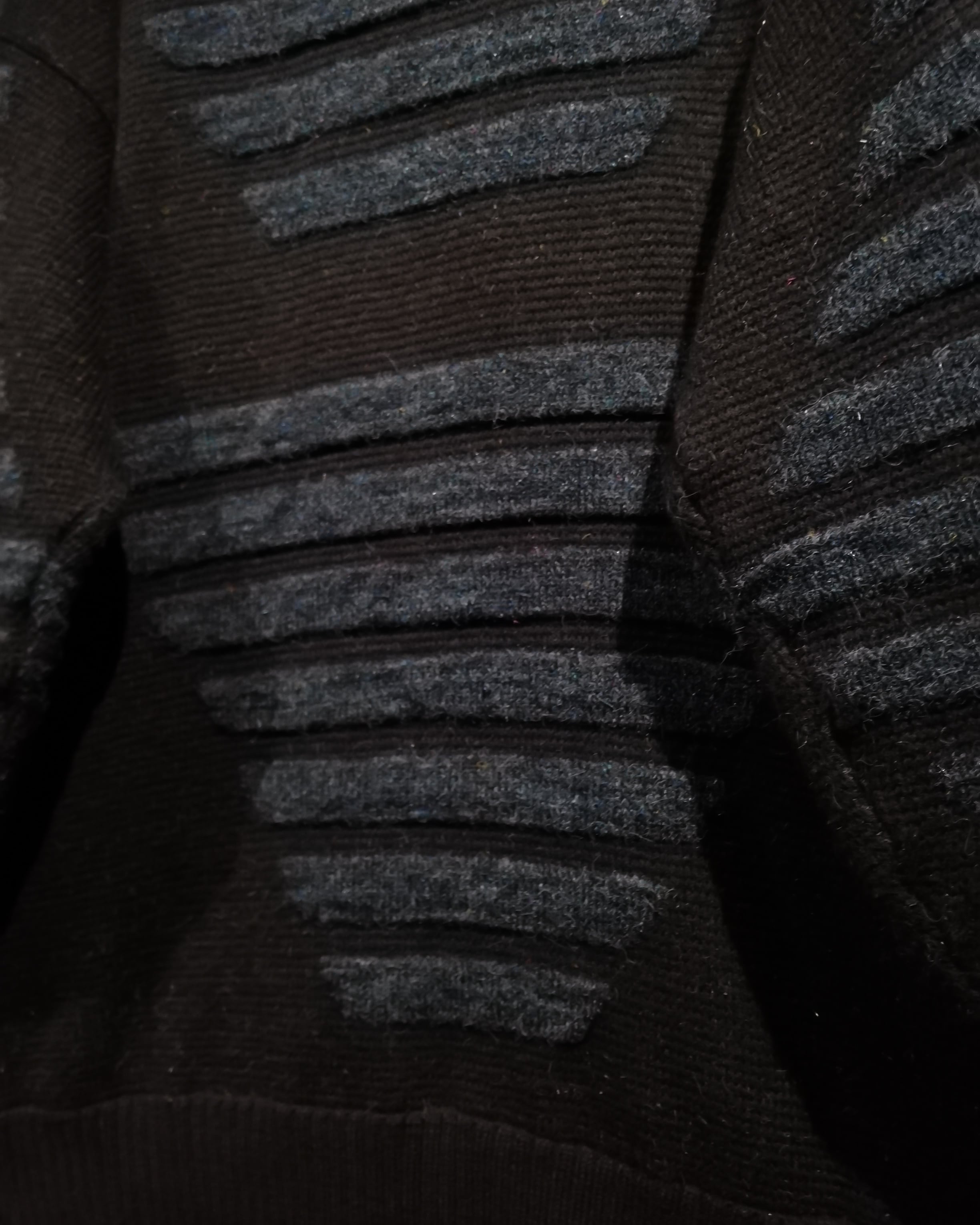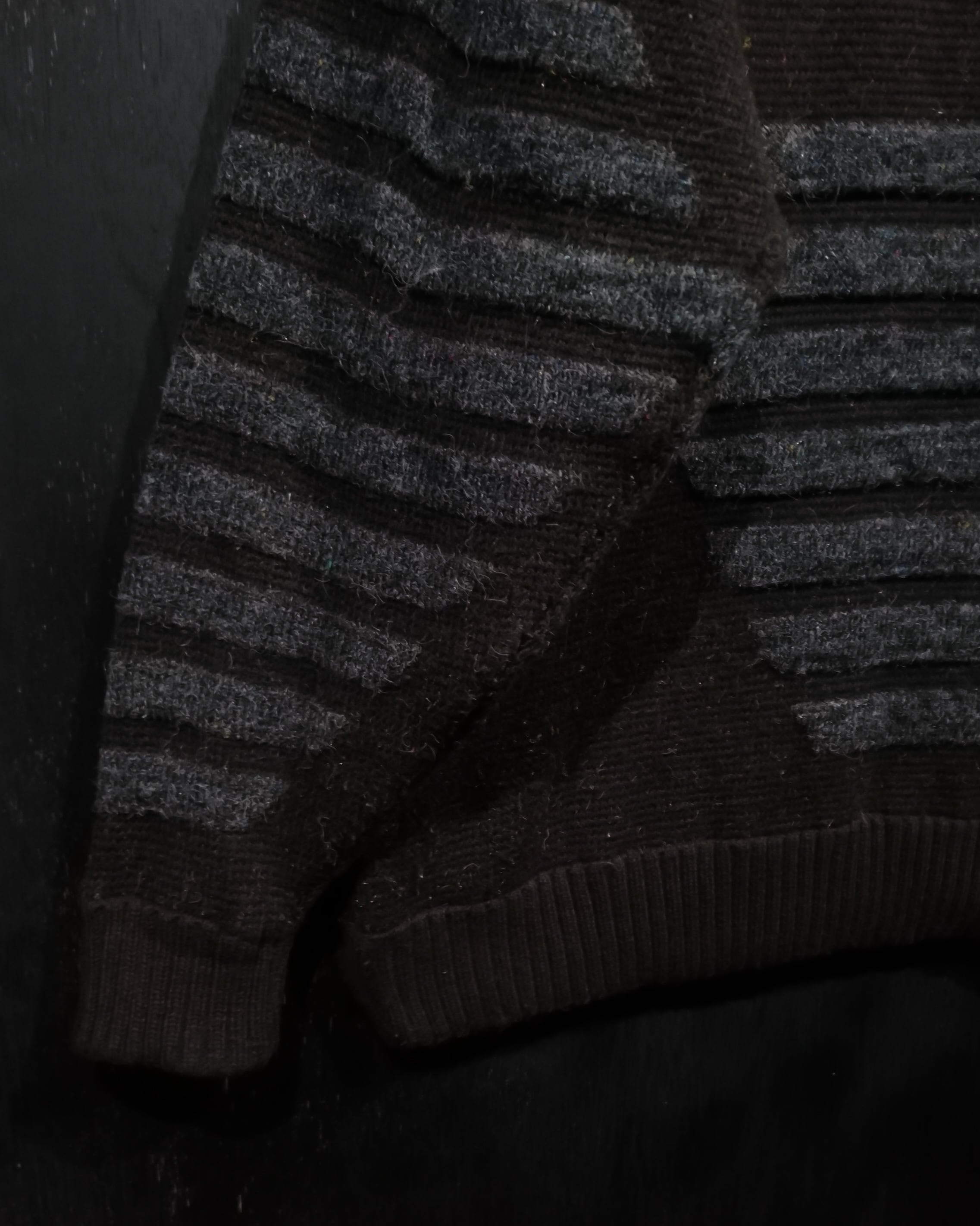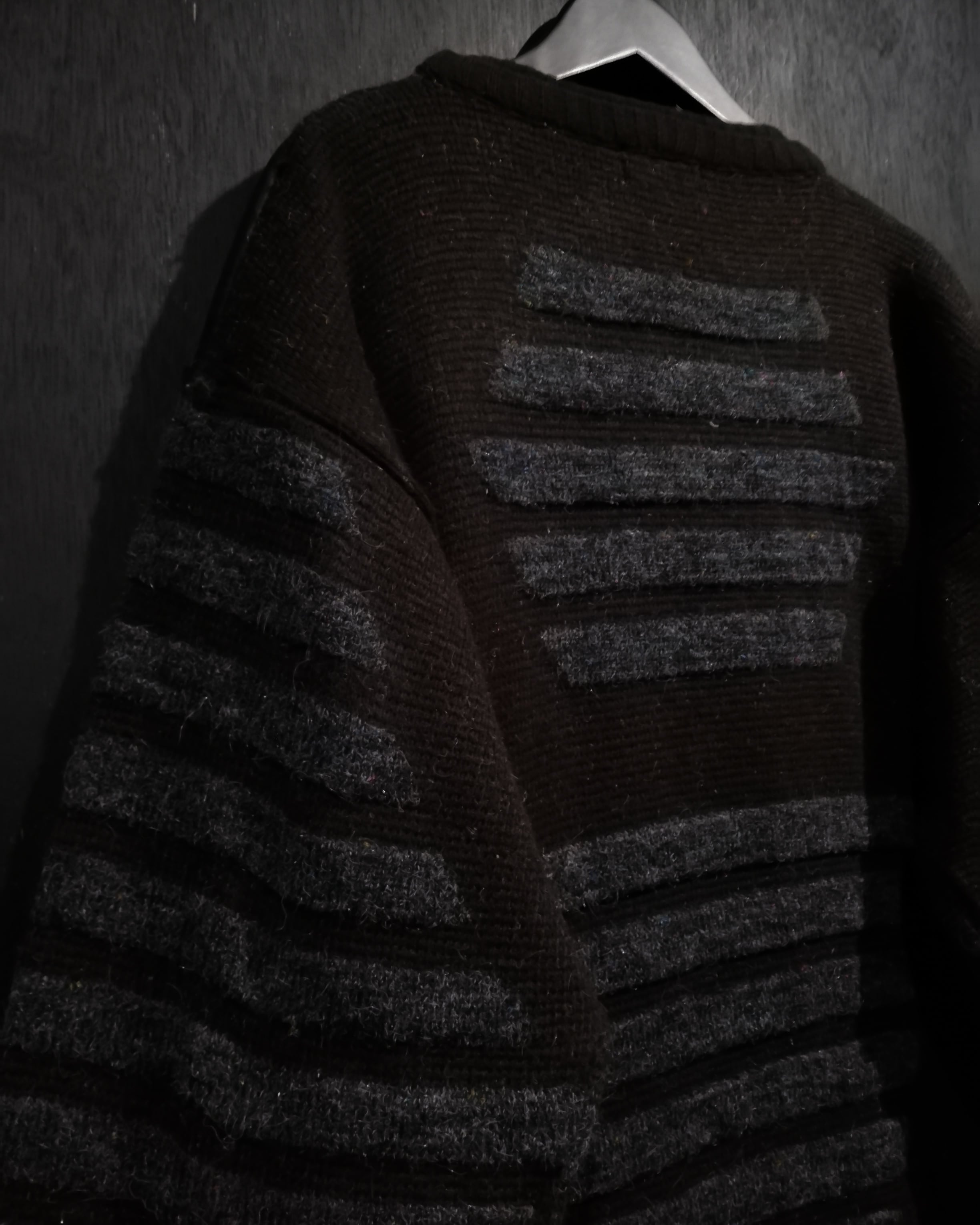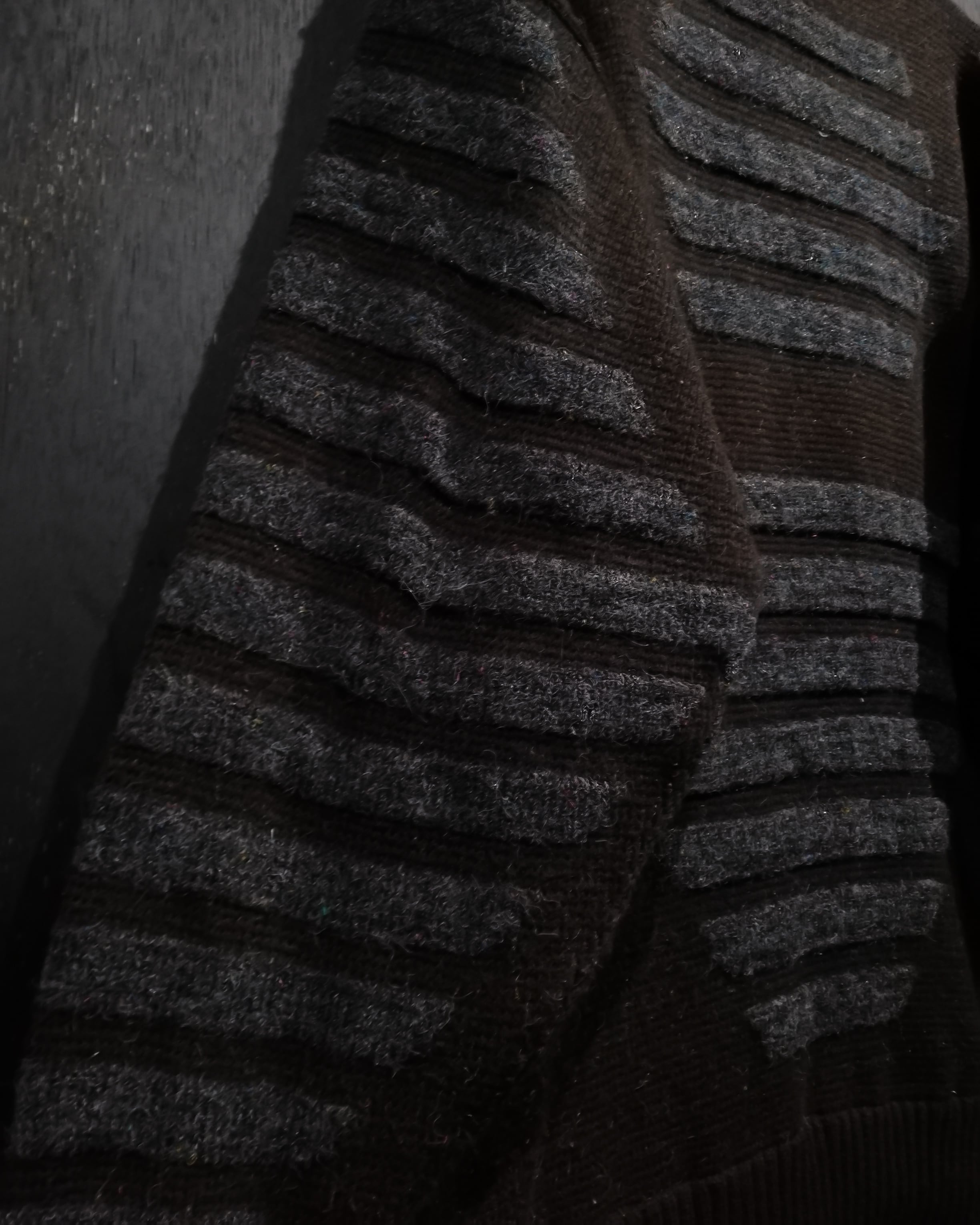 編みによってブラウンにグレーのボーダー状のデザインを立体的に編み込んだボディに、肩、フロント中央にレザーを切り替えた稀有なプルオーバーニット。