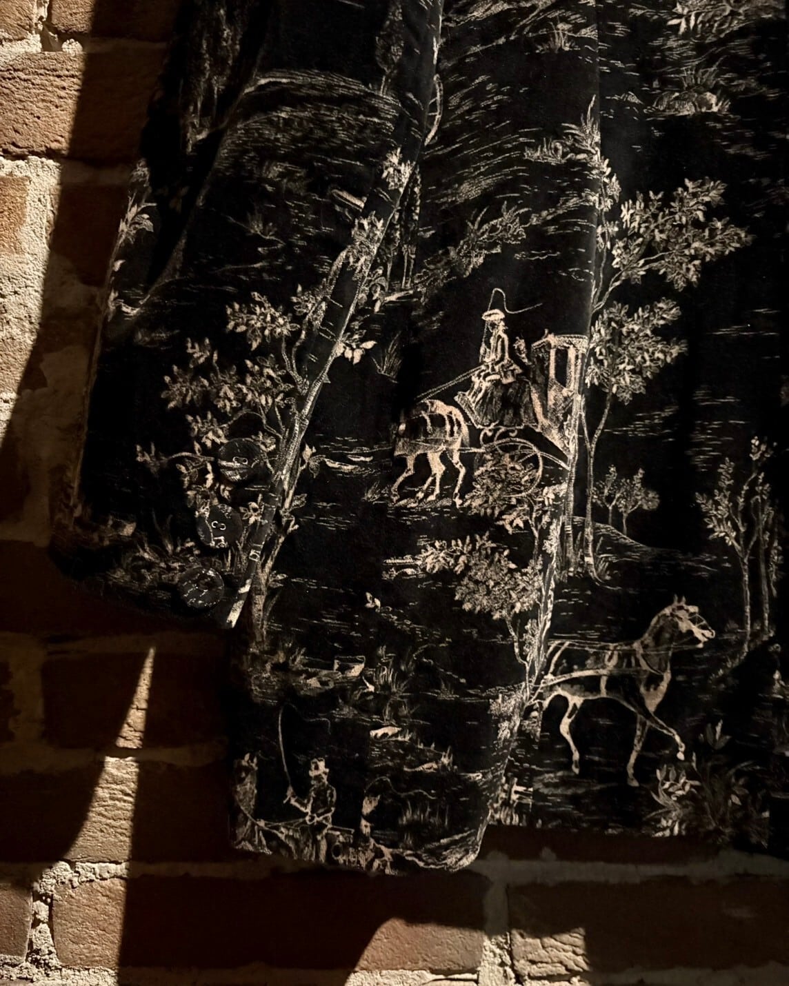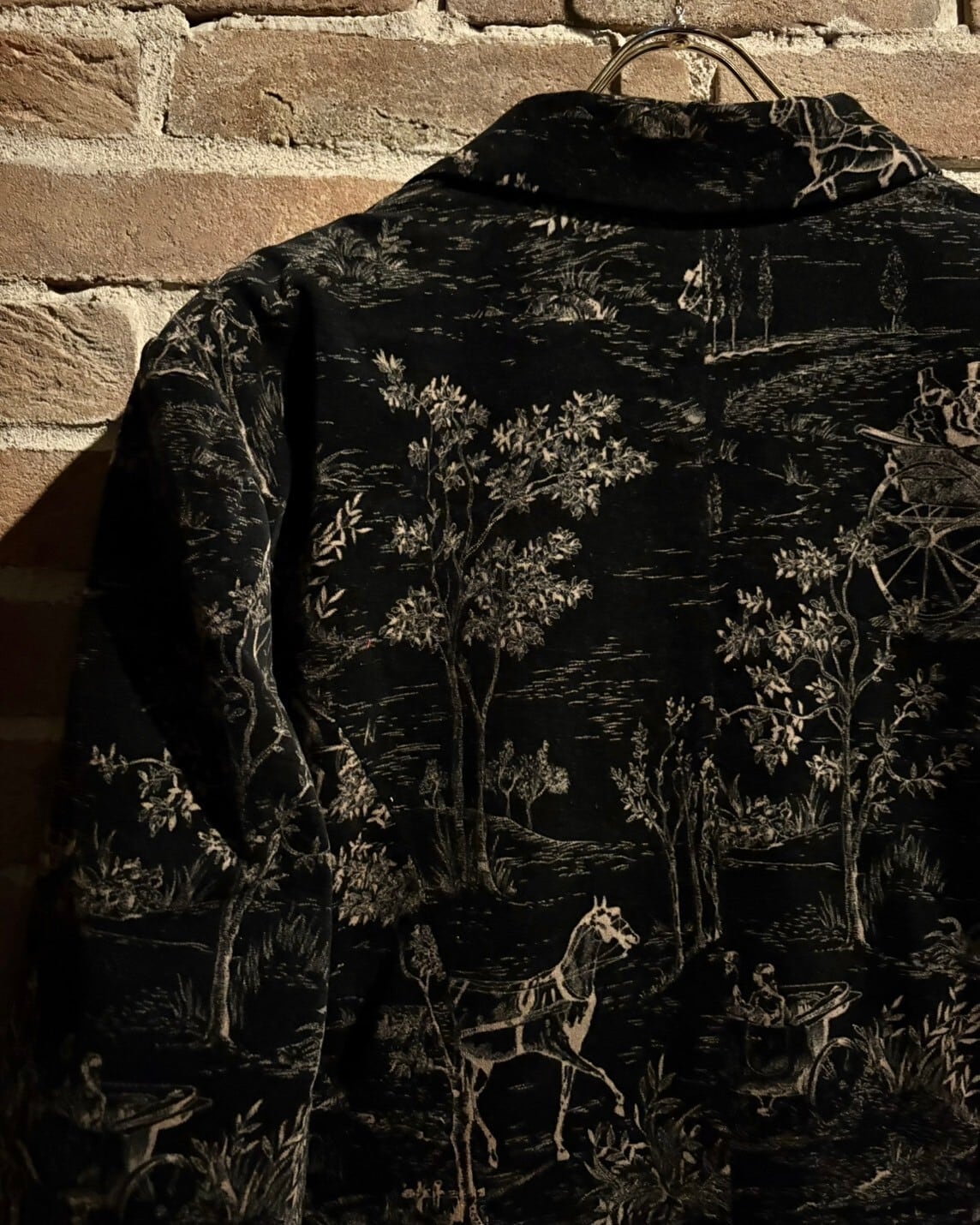見る角度や光の当たり方によって見え方、輝き方が変わる、極上ベロア素材を用いたテーラードジャケットに、馬車などレトロでラグジュアリーなデザインを載せたテーラードジャケット。