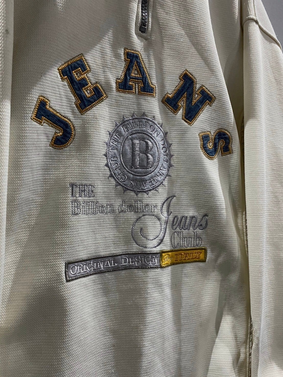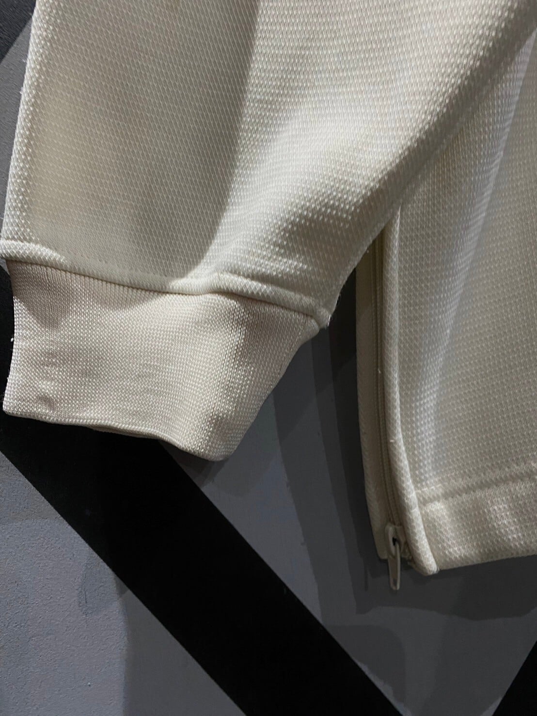 白のボディをベースに、フロントには刺繍のデザインを施したストリートな雰囲気を漂わせるハイネックスウェット。