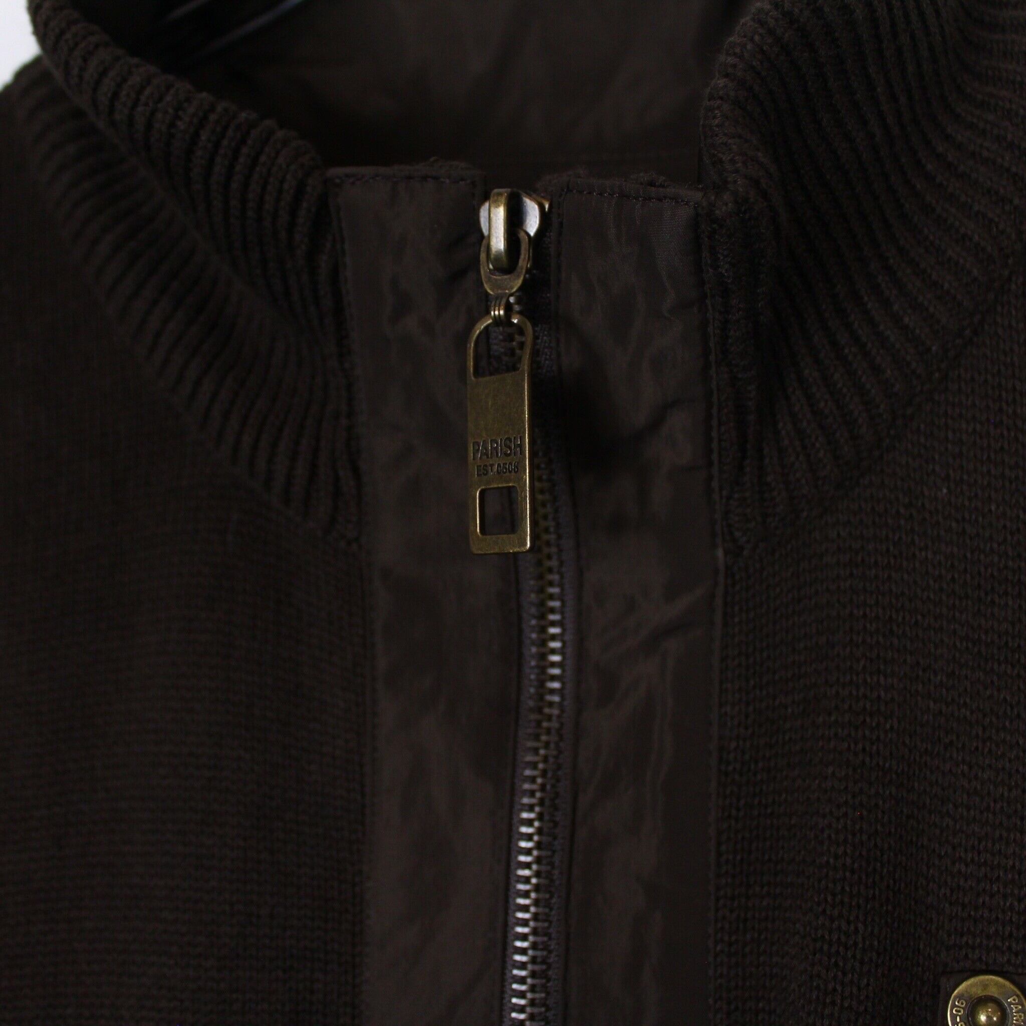 アームや前立て部分、背面にもナイロンの切り替えデザインが施されており、コットン素材とナイロンのコントラストによって立体感のある見栄えに仕上がっています。ゴールドのボタンも◎