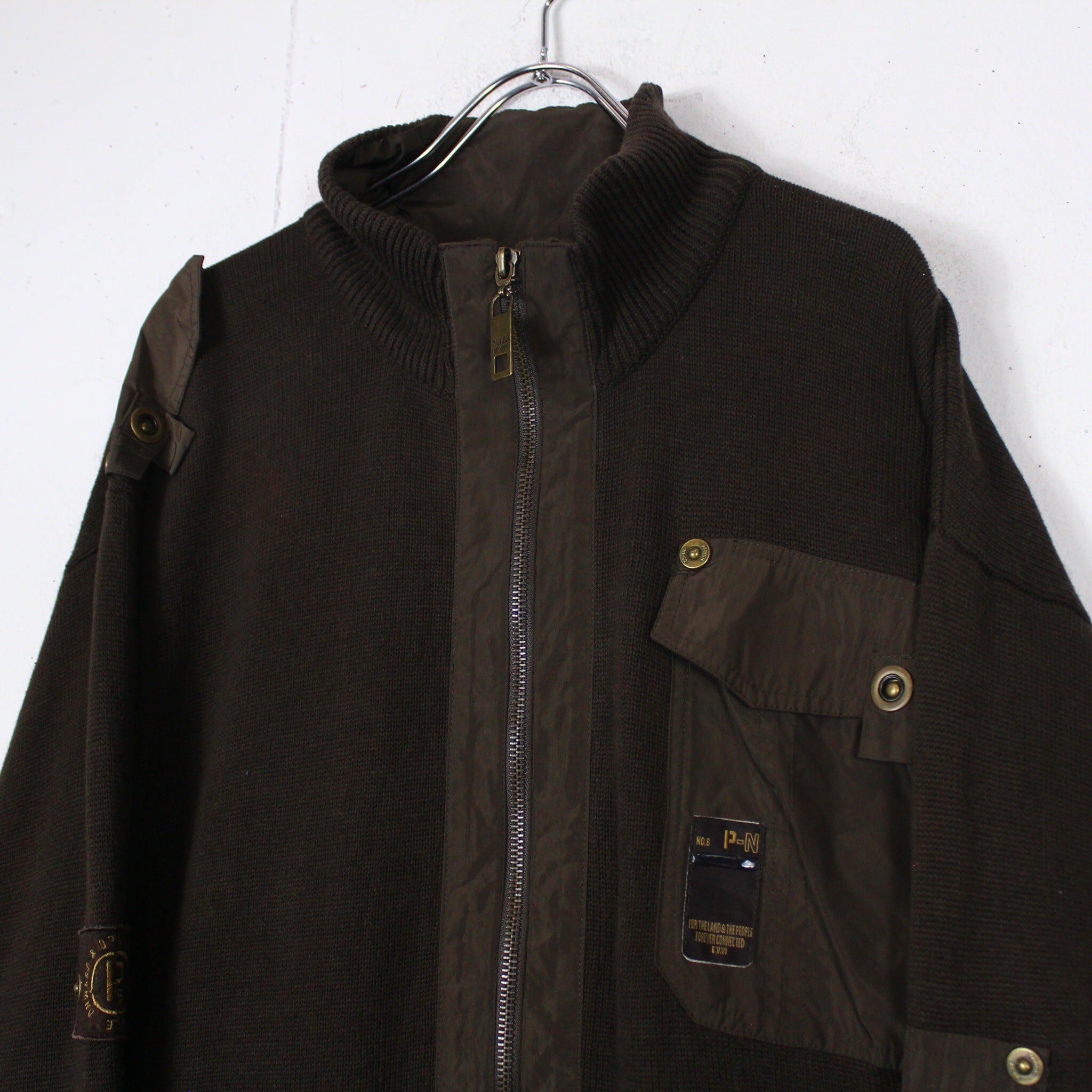 濃く深いブラウンのコットンボディに、ナイロン素材を切り替え、フラップ付きのマルチポケットを配したスペシャルな1着。