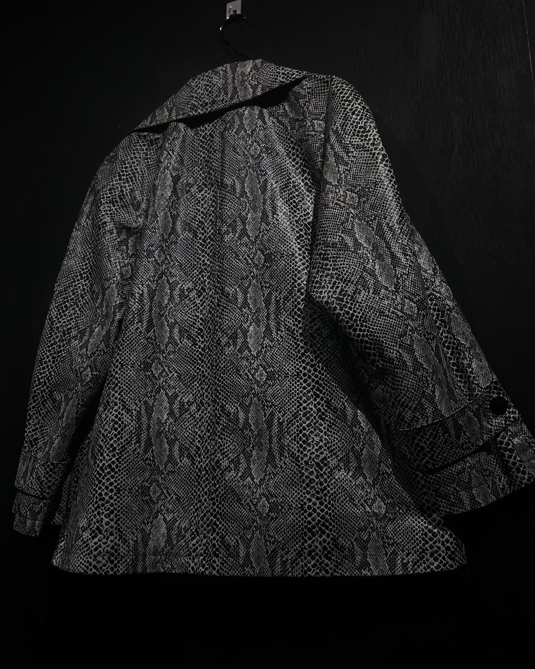 フワッと軽いポリ素材を用いたボディに、パイソン柄を載せ、ダブルのライダース型に落とし込んだジャケット。
