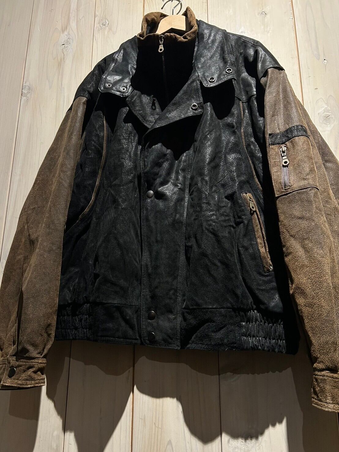 ここまでハイセンスなデザイン性が際立つレザージャケットは稀少。レザー同士を掛け合わせたレイヤードスタイルというモードかつハイエンドな合わせを1着で体現したスペシャルな逸品です。