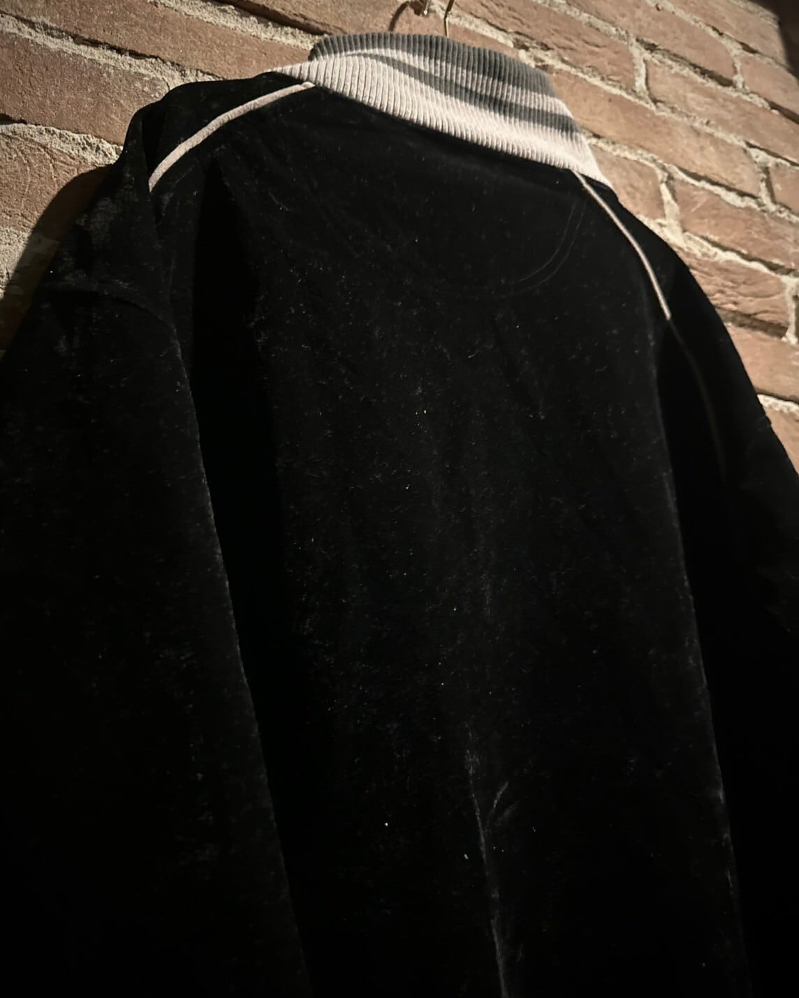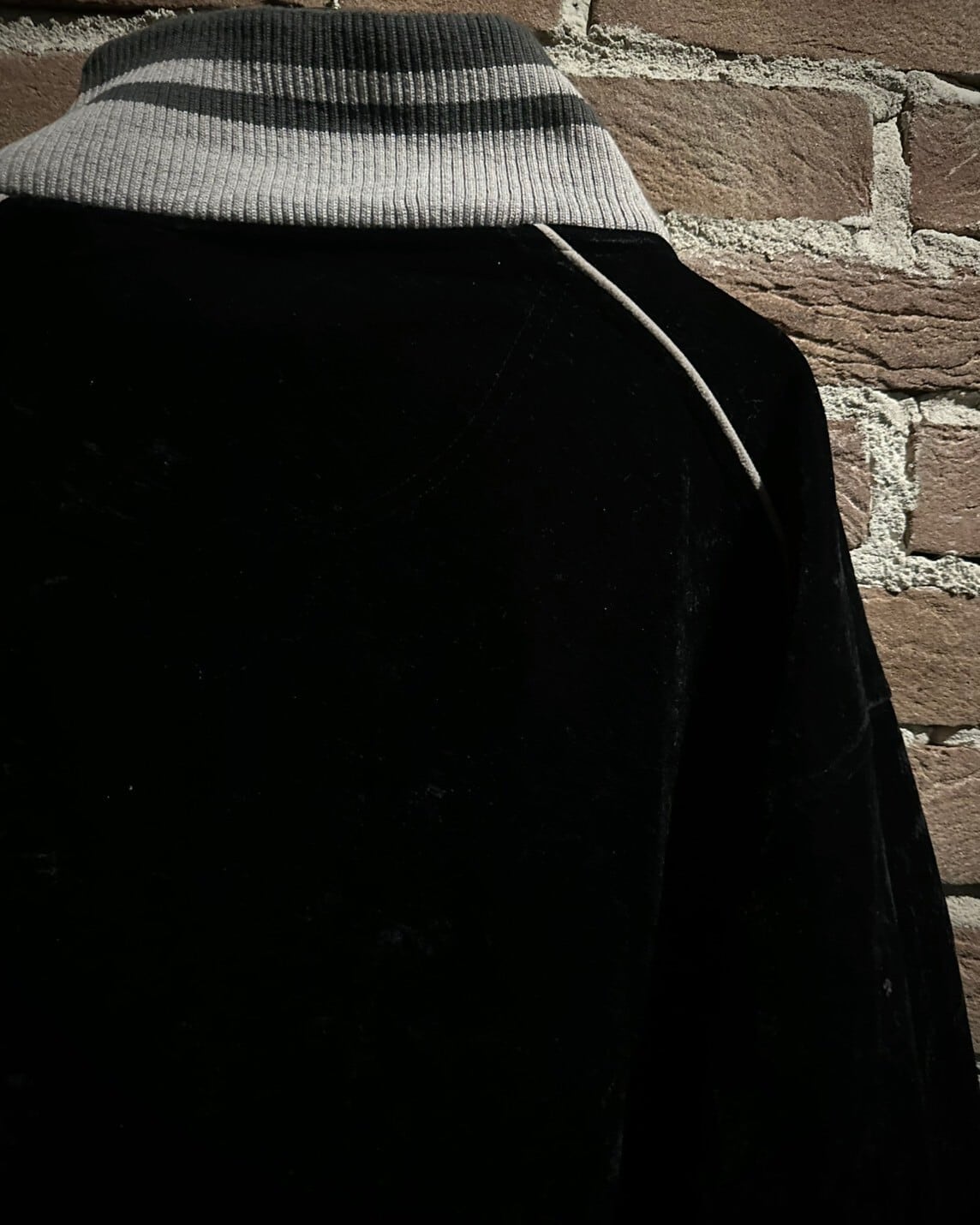 ハリがあり、ベロアのような起毛感のある素材を用いて首元やポケット口、リブにはニットを切り替えたブルゾンジャケット。