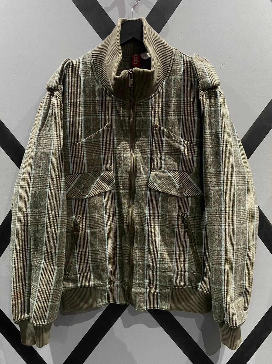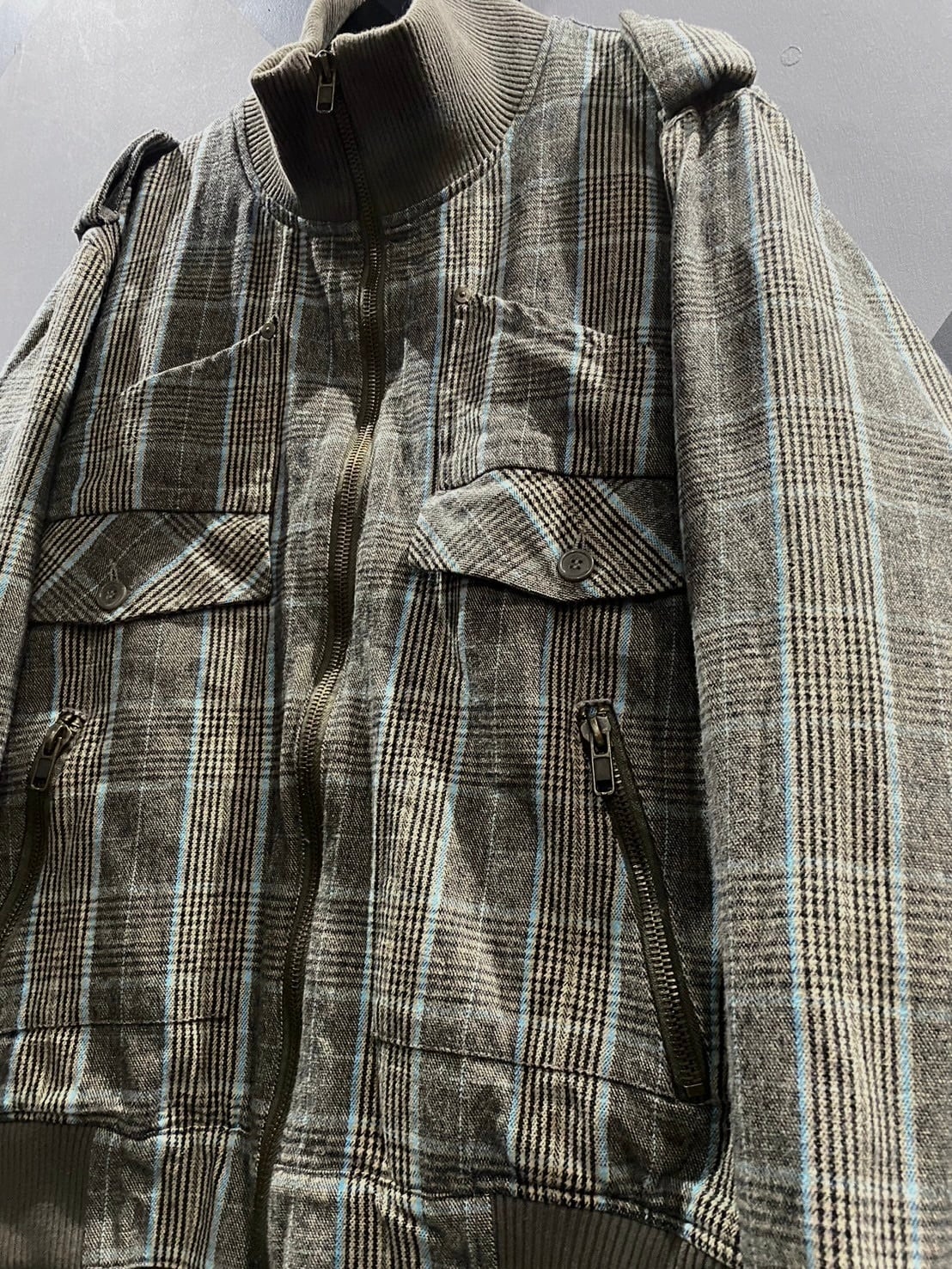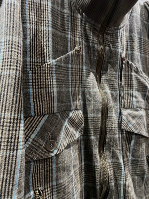 サラッとしたコットン素材のボディに、ベージュベースのチェック柄を全面に配した ハイネックジャケット。