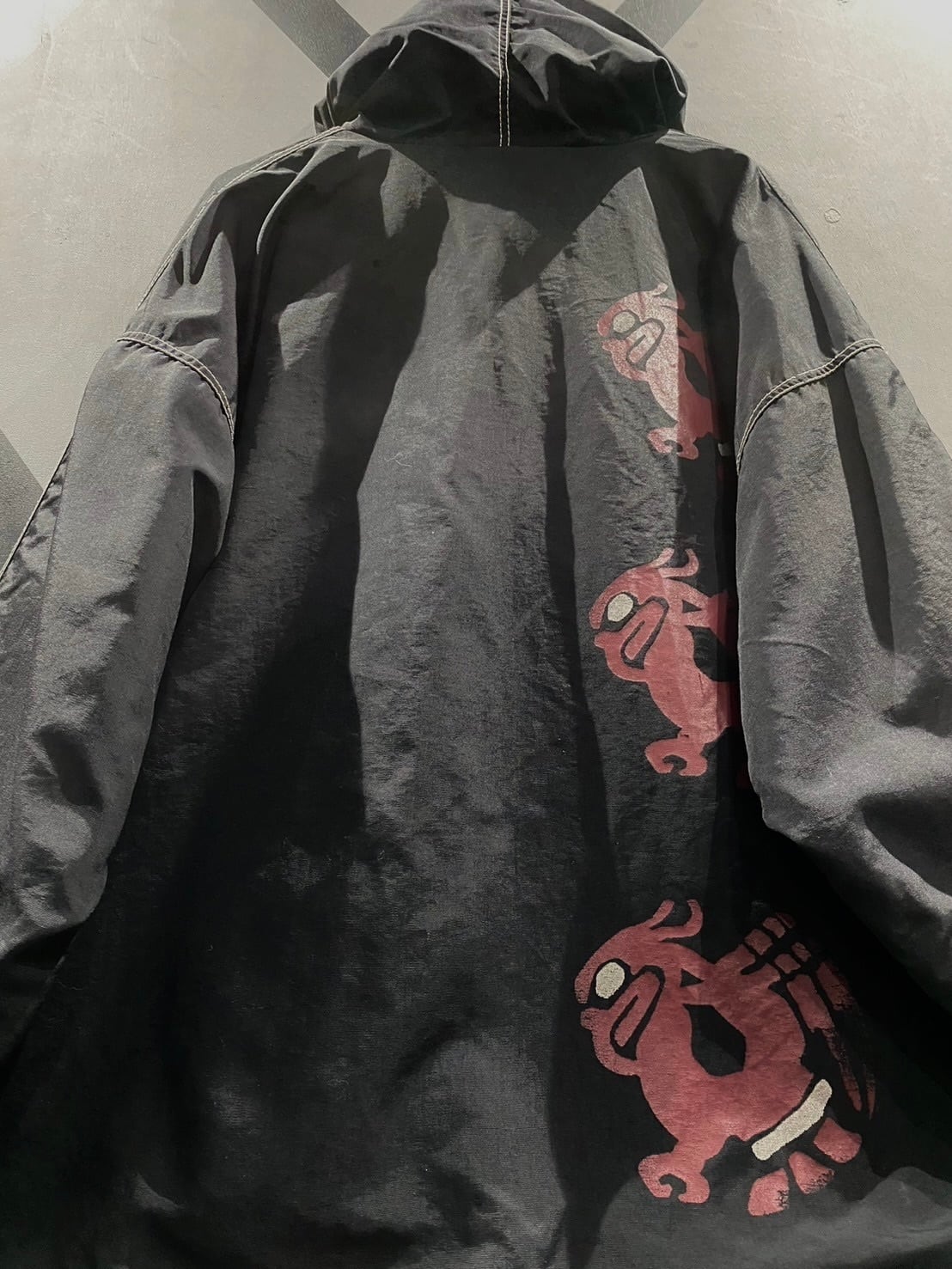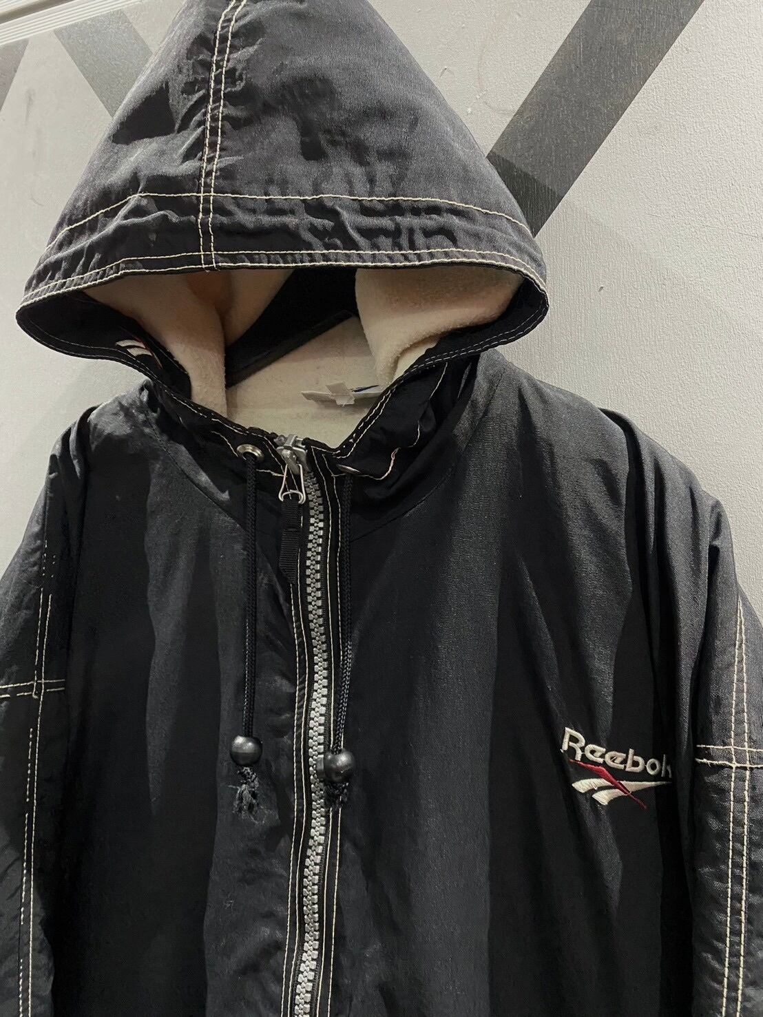 ブラックのナイロン素材をベースに、左胸には"Reebok"のロゴ刺繍、背面に民族調のタッチで描かれた鳥のプリントを施したナイロンフーディー。