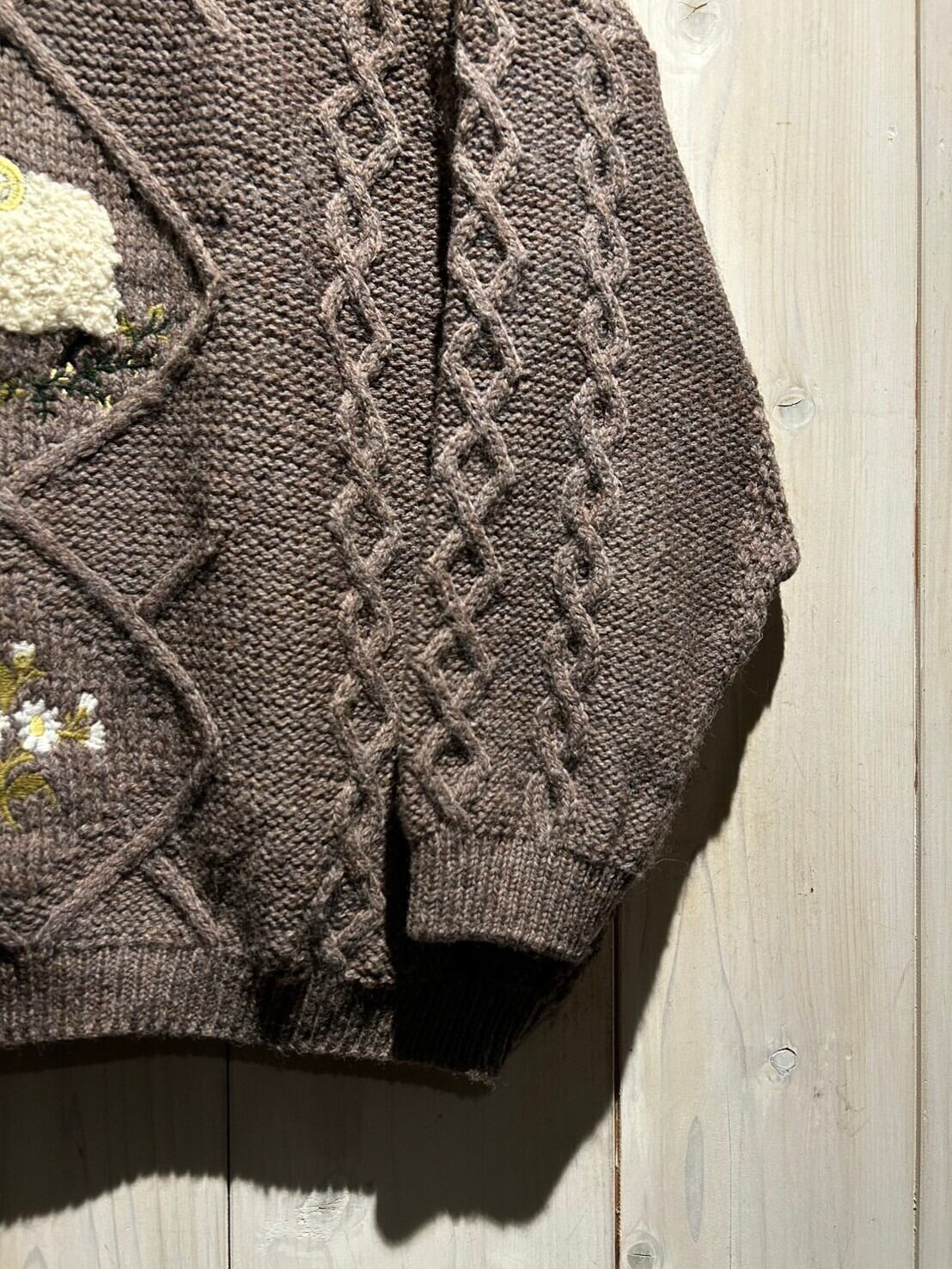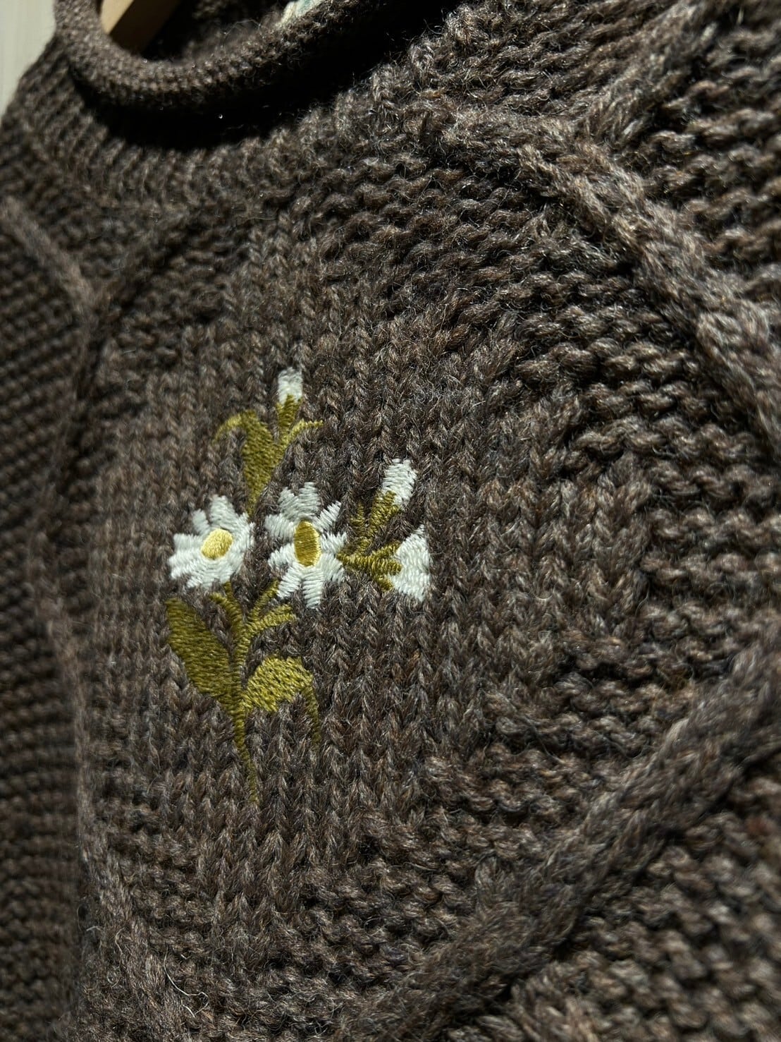 ブラウンのボディにケーブル編みを施し、フロント中央には羊さんとお花の刺繍デザインを施したプルオーバーニット。