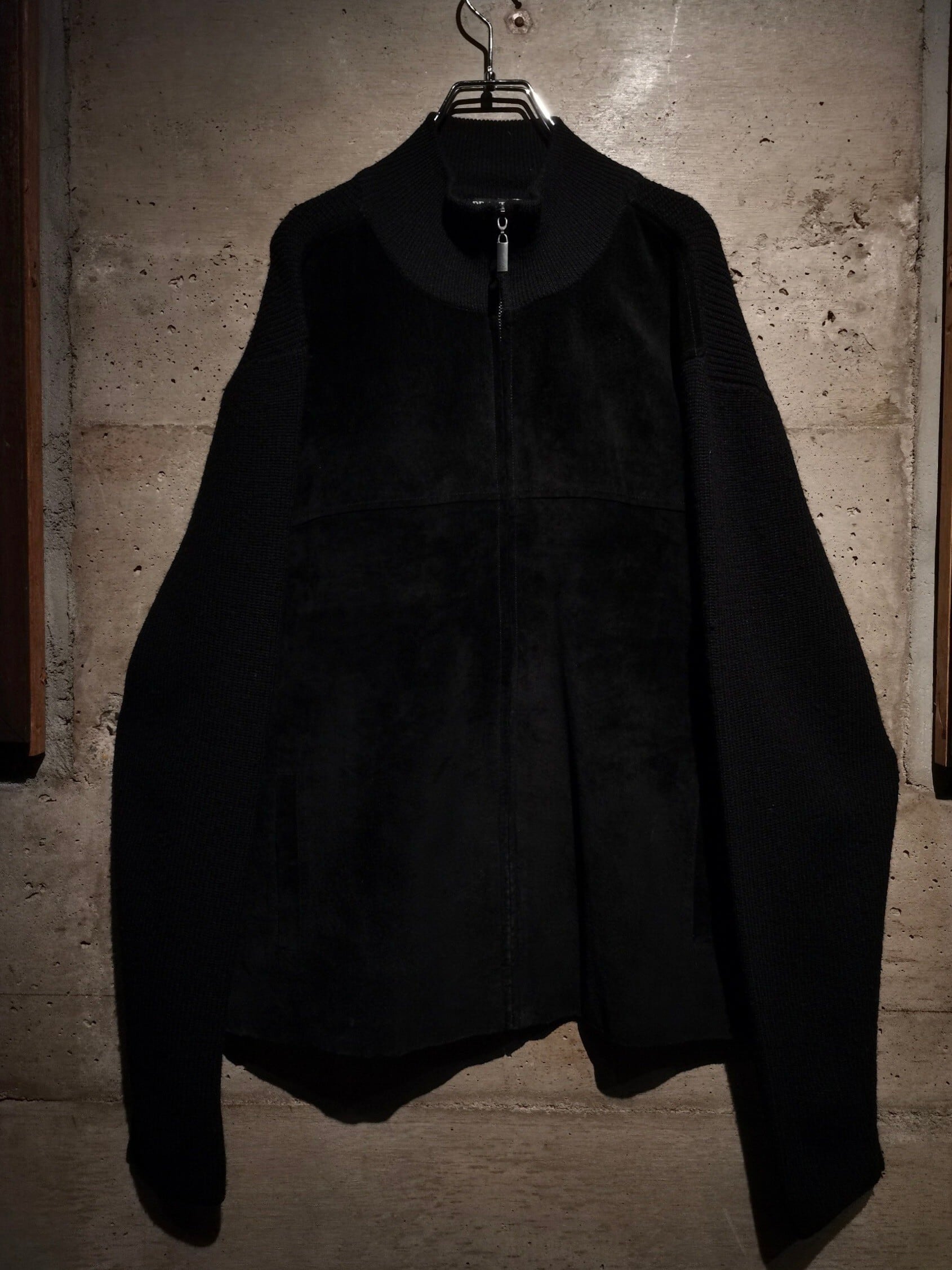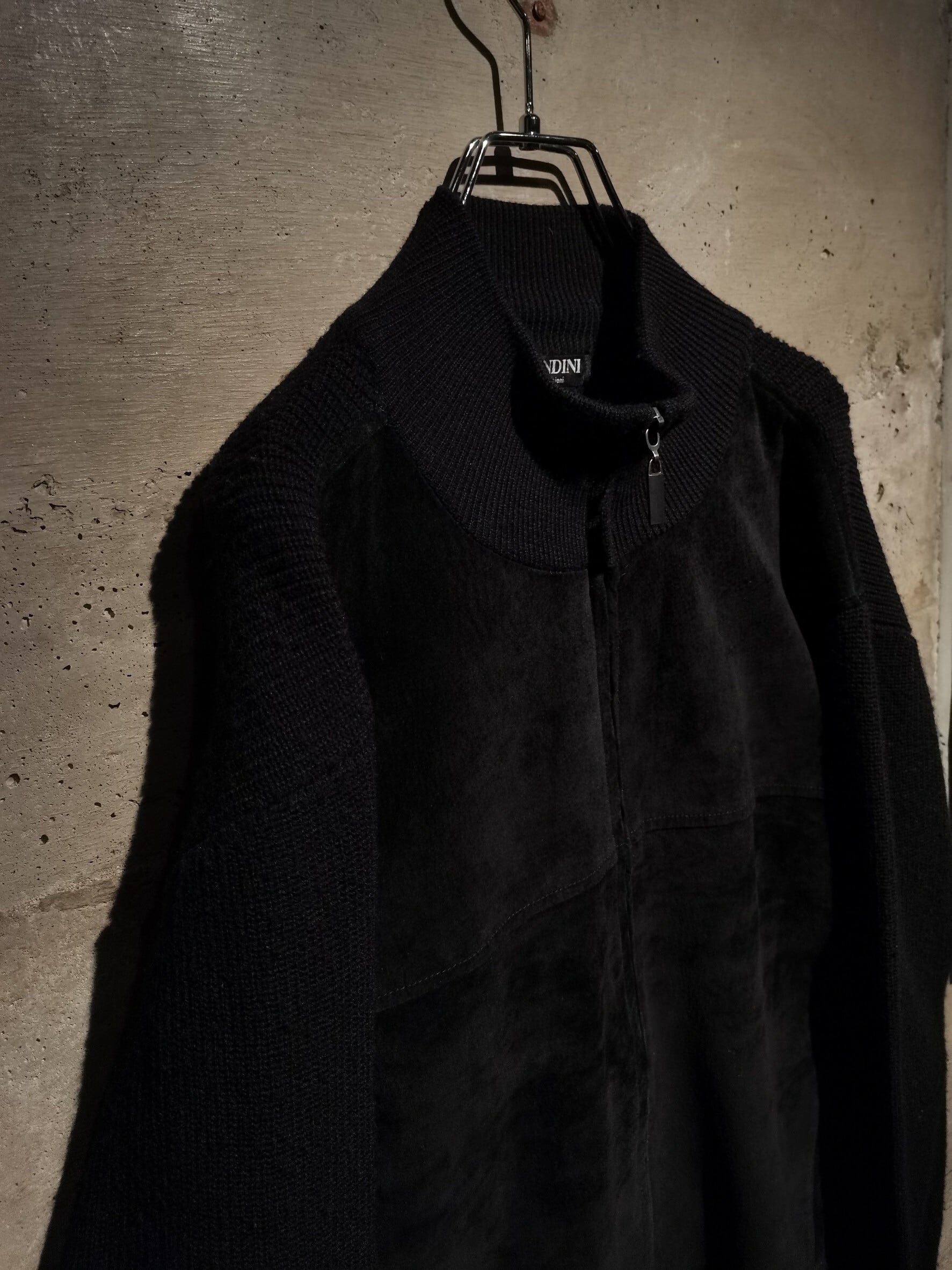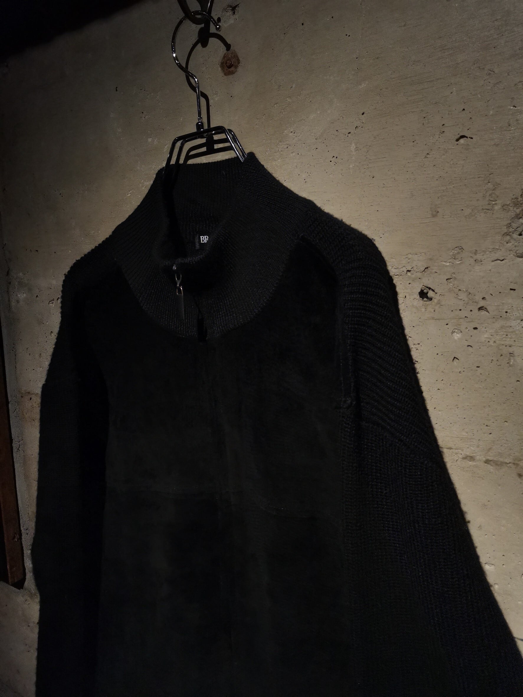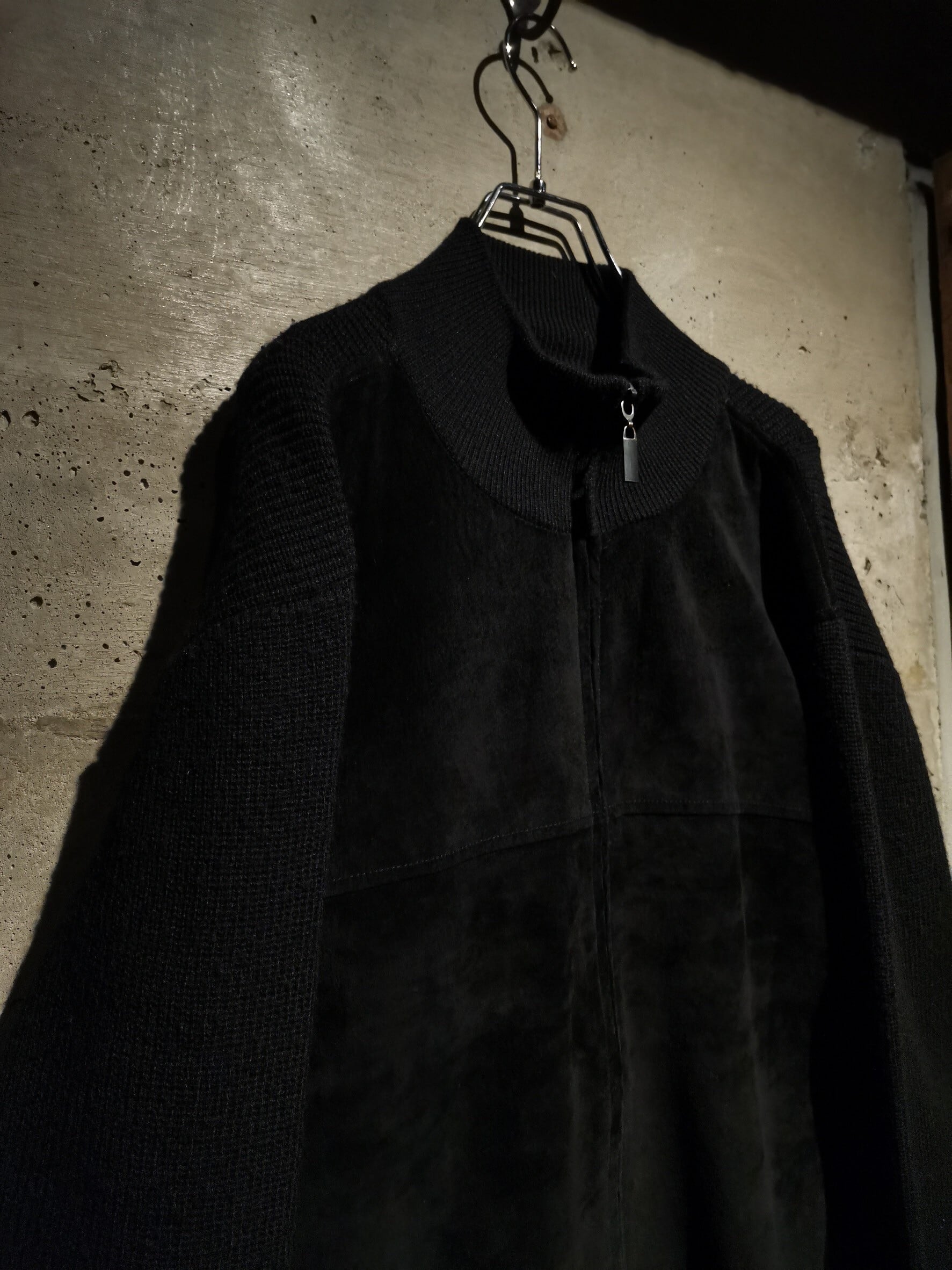 ブラックのニットボディをベースに、前身頃に上質なスエードレザーをフロントに切り替えたドライバーズニット。