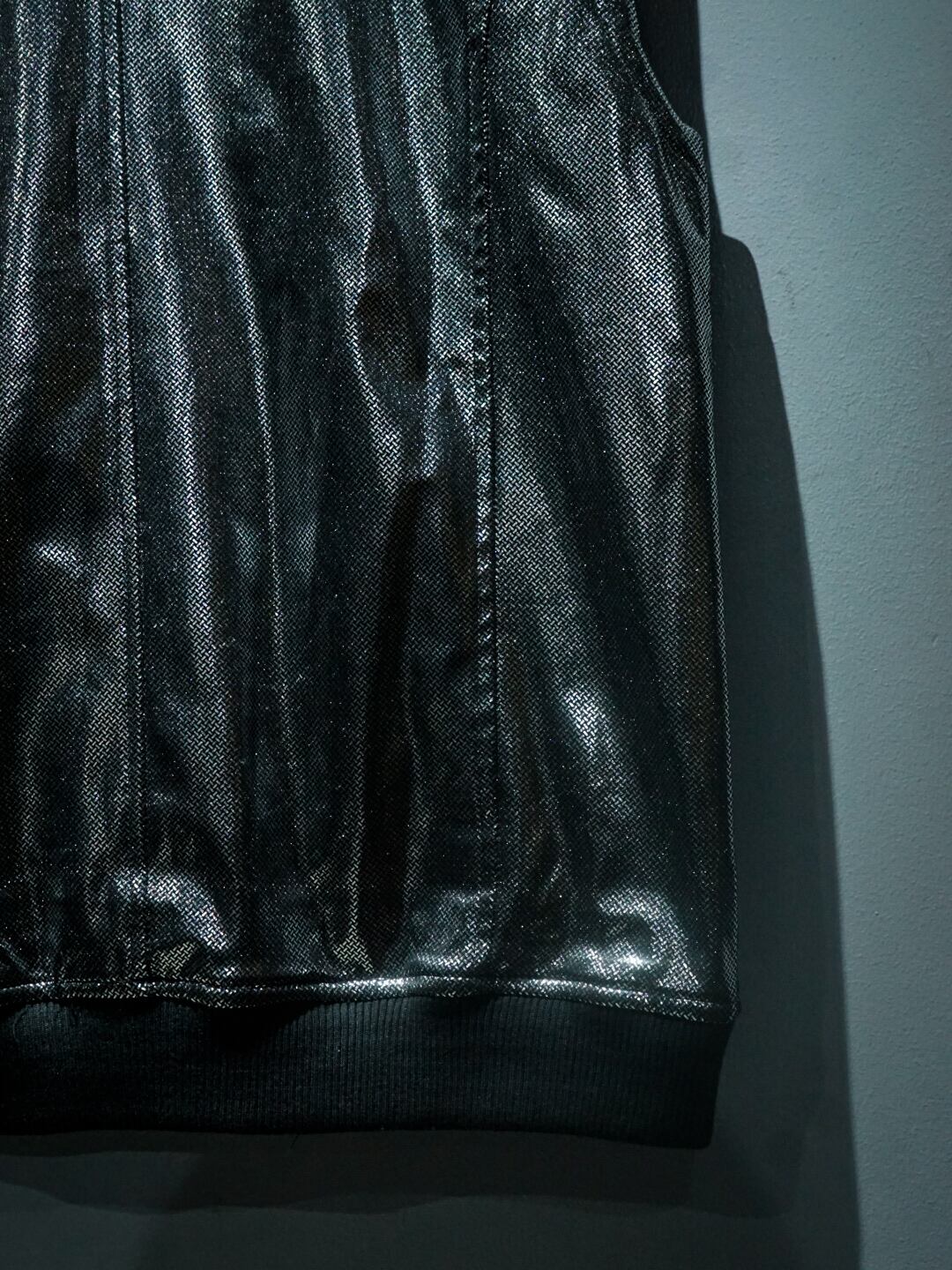 メタリックな光沢を帯びたシルバーカラーで、編み目状の柄を載せたジップアップベスト。