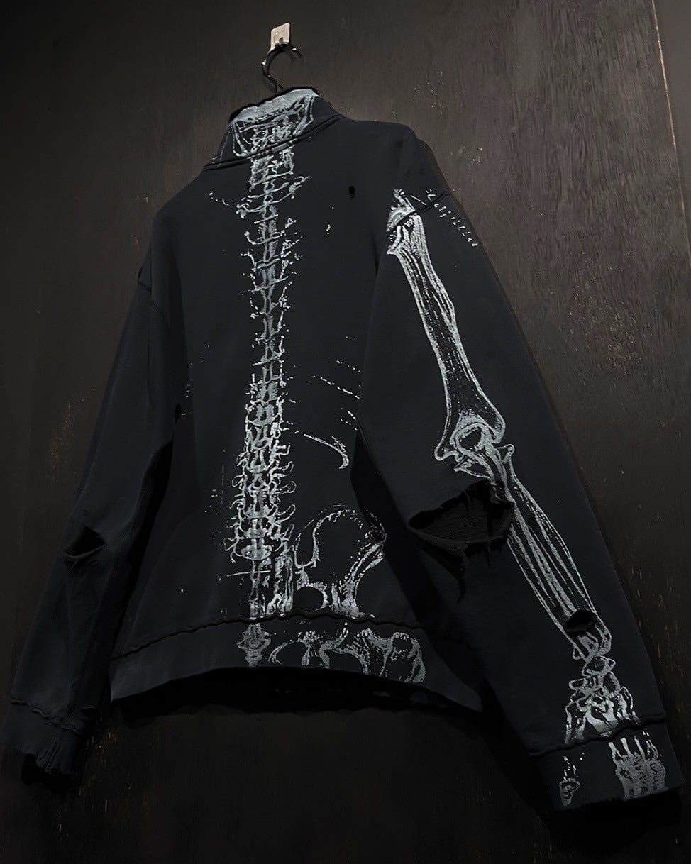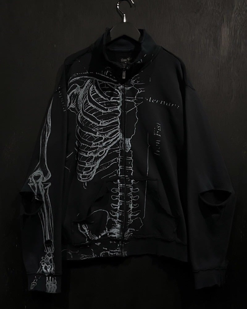 経年によるフェード、大胆なダメージが施されたボディに、フロント、バック、アームにスケルトンのプリントを載せたジップアップ仕様のスウェットジャケット。