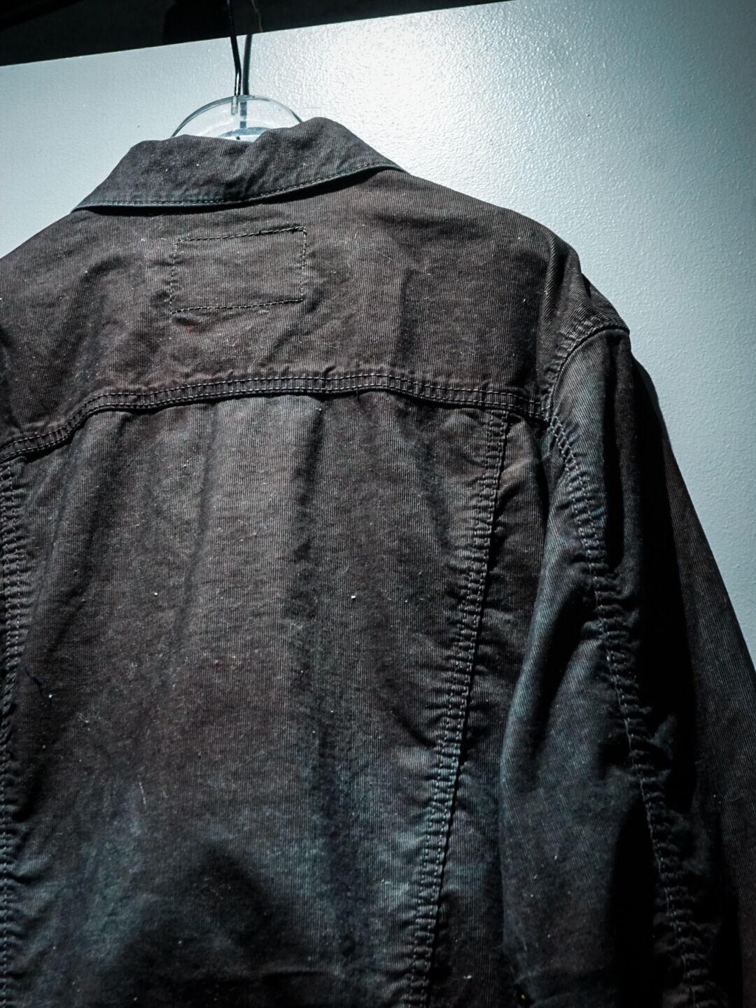 ブラウンから錆のように退廃的な雰囲気を持つ水色へと移りゆくフェード加工が非常に美しい薄手のコーデュロイジャケット。