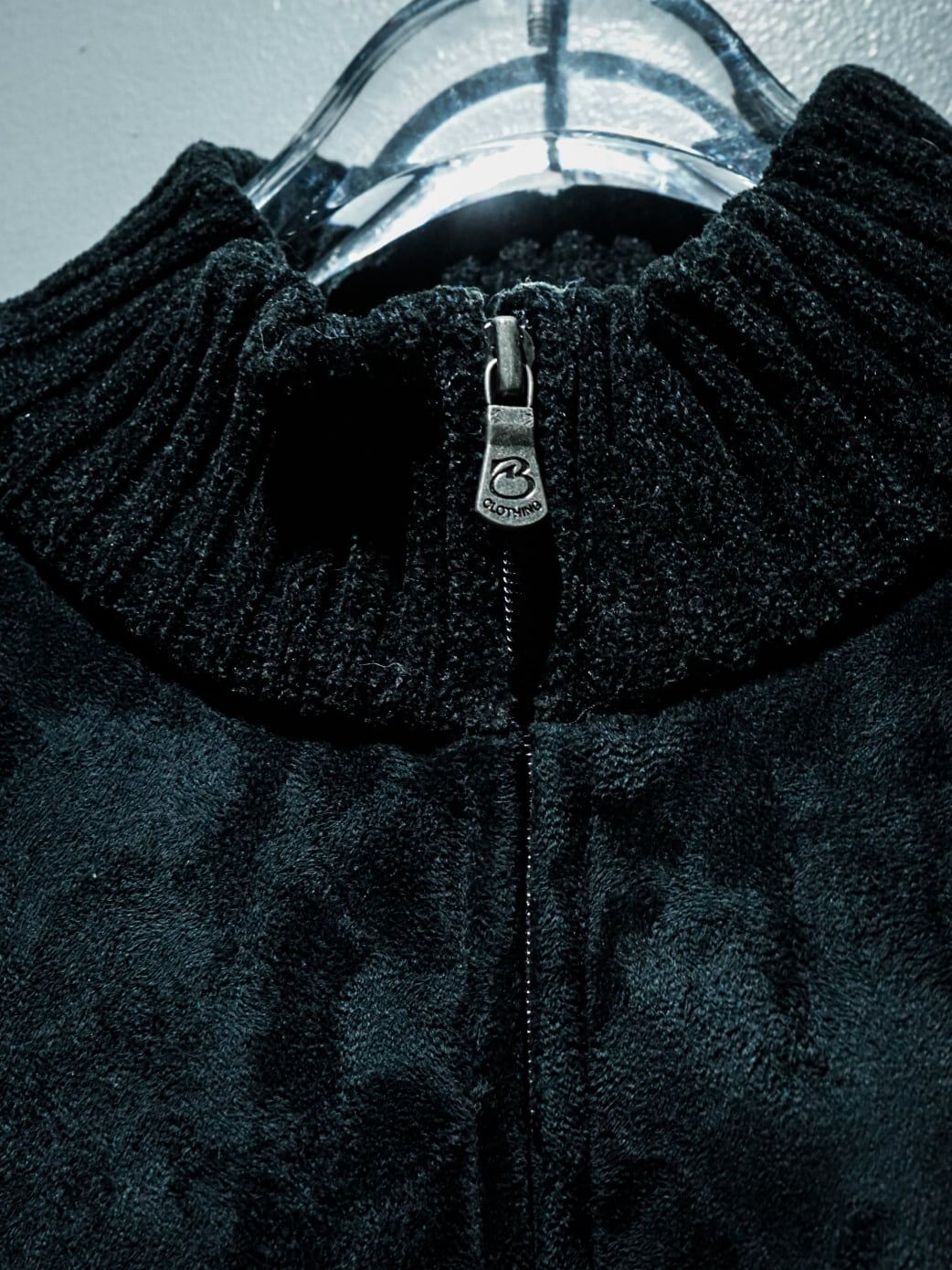 鈍い光沢のあるシェニール織のニットに、前身頃にフェイクスエードを切り替えたいわゆるドライバーズ型のジップアップニットジャケット。