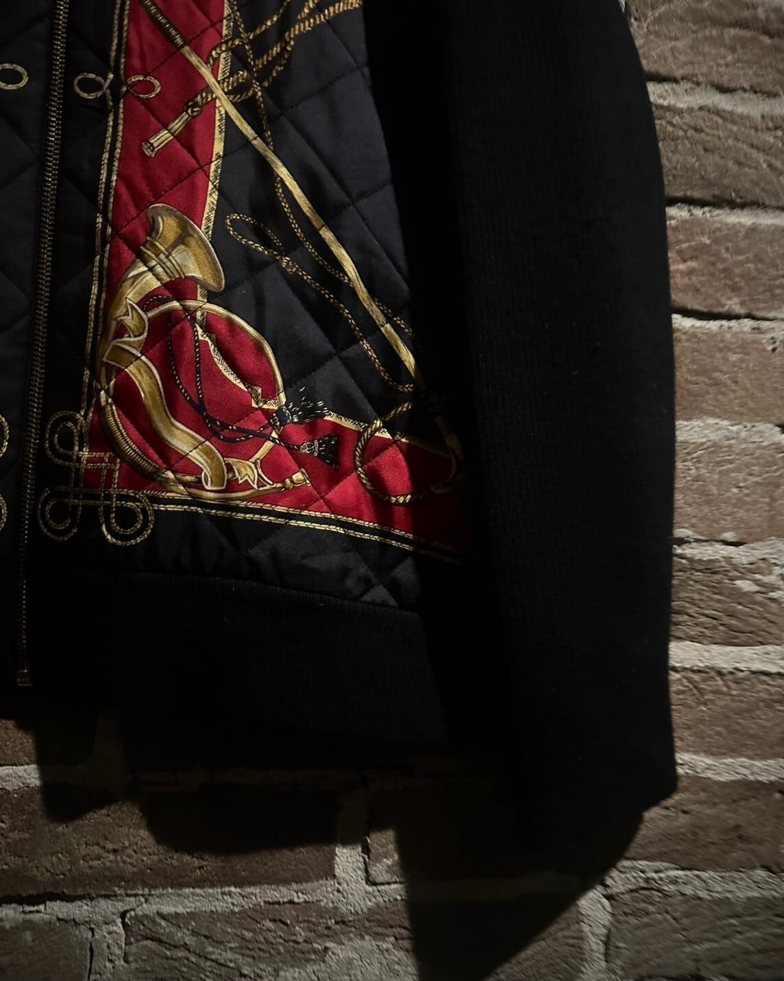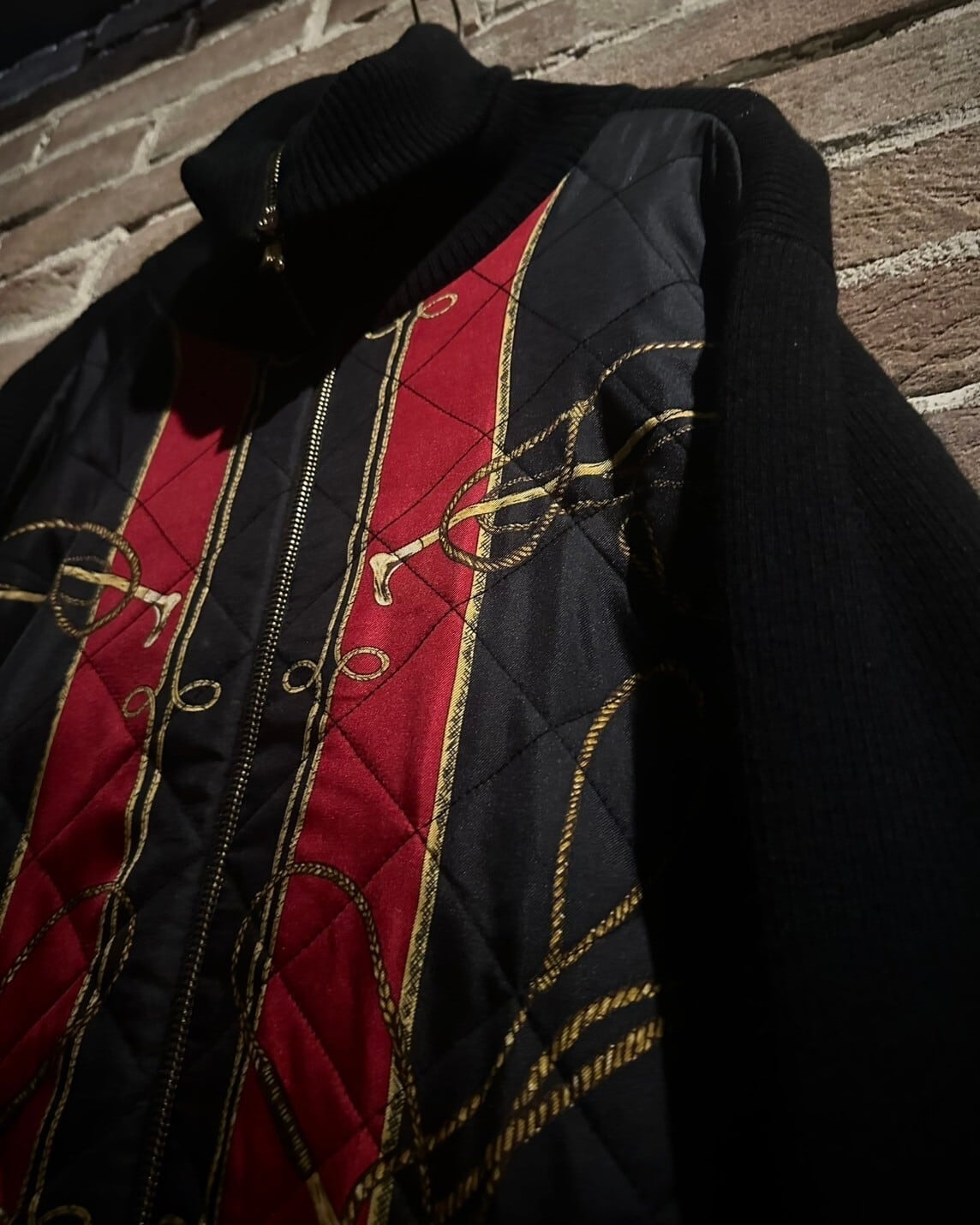 ブラックのリブニットをベースに、フロントにスカーフ柄を載せたキルティングを切り替えた稀有なニットジャケット。