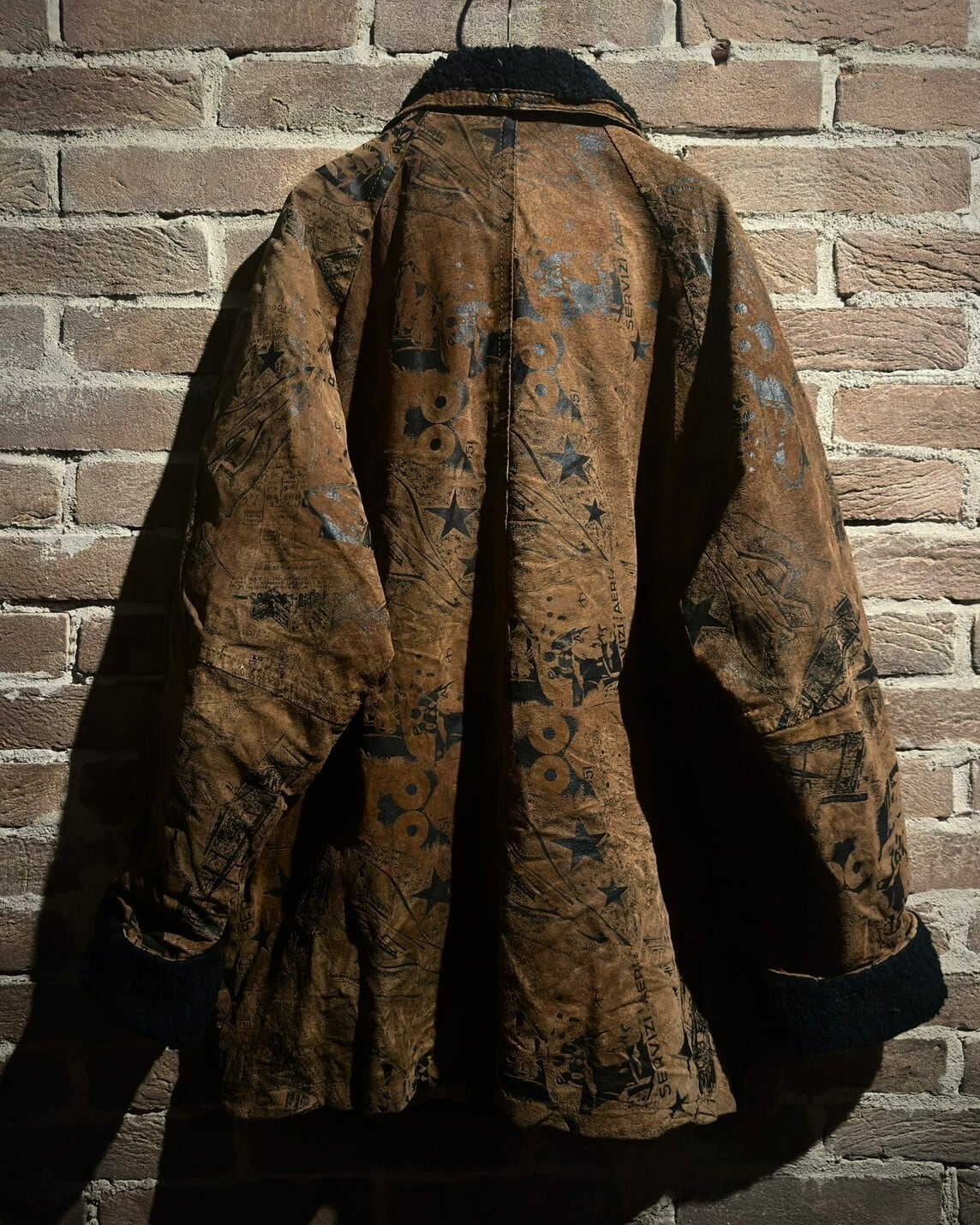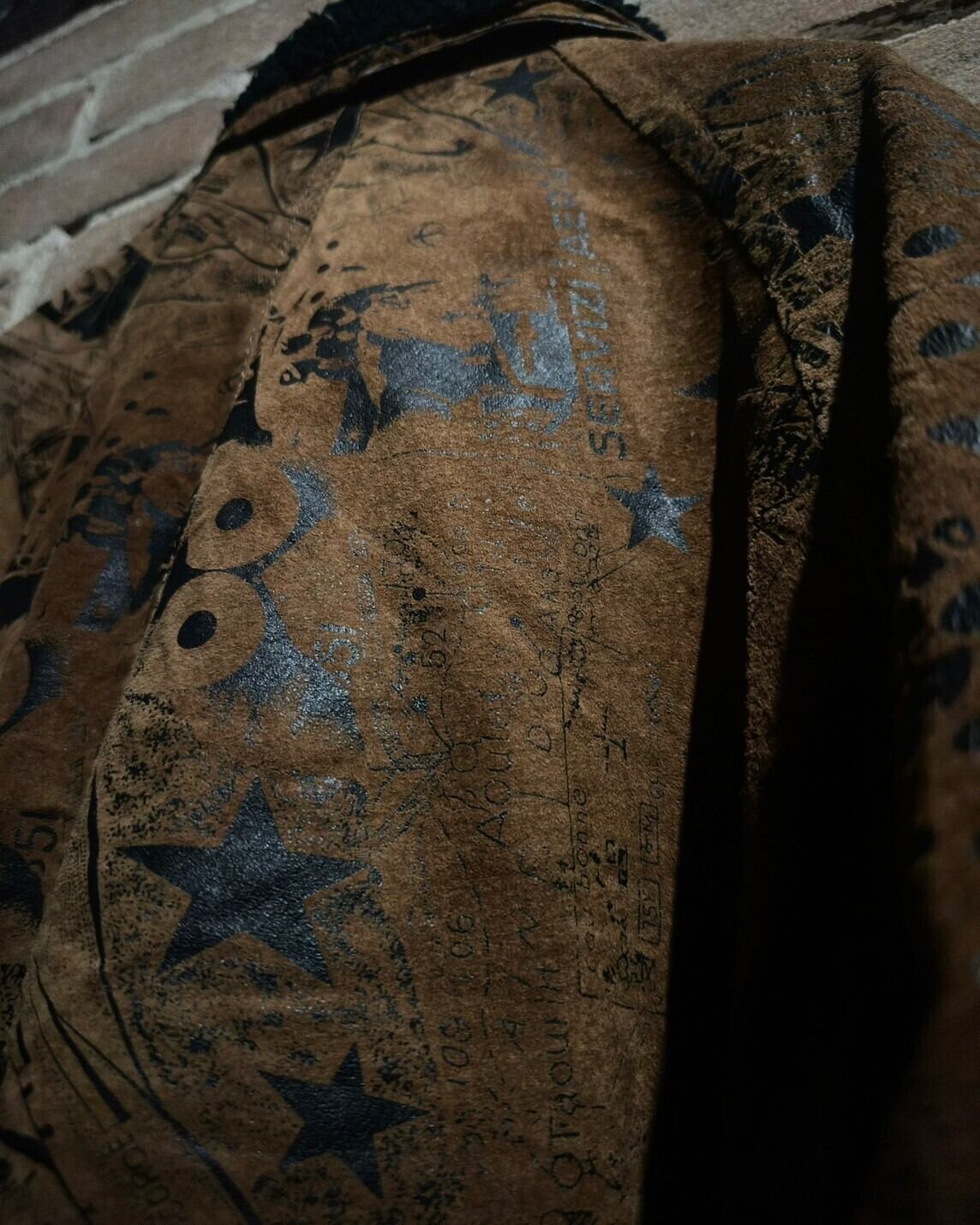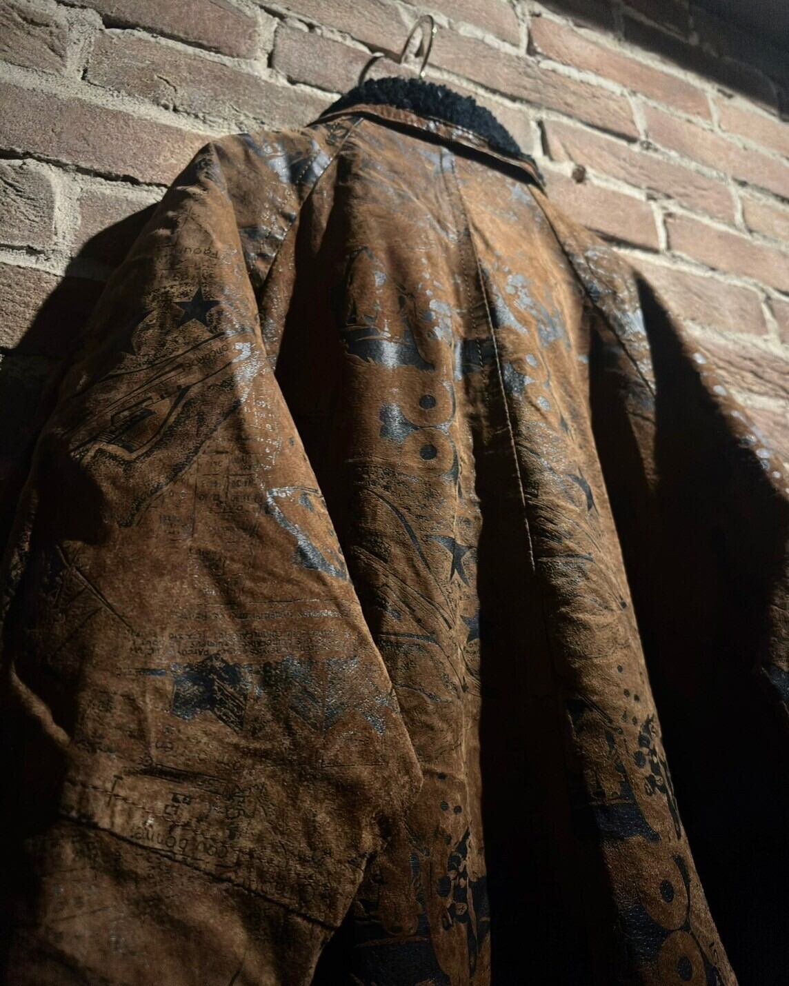 しっとりとハリのある上質なスエードレザーにエスニックな雰囲気を漂わせるプリントを施したジャケット。