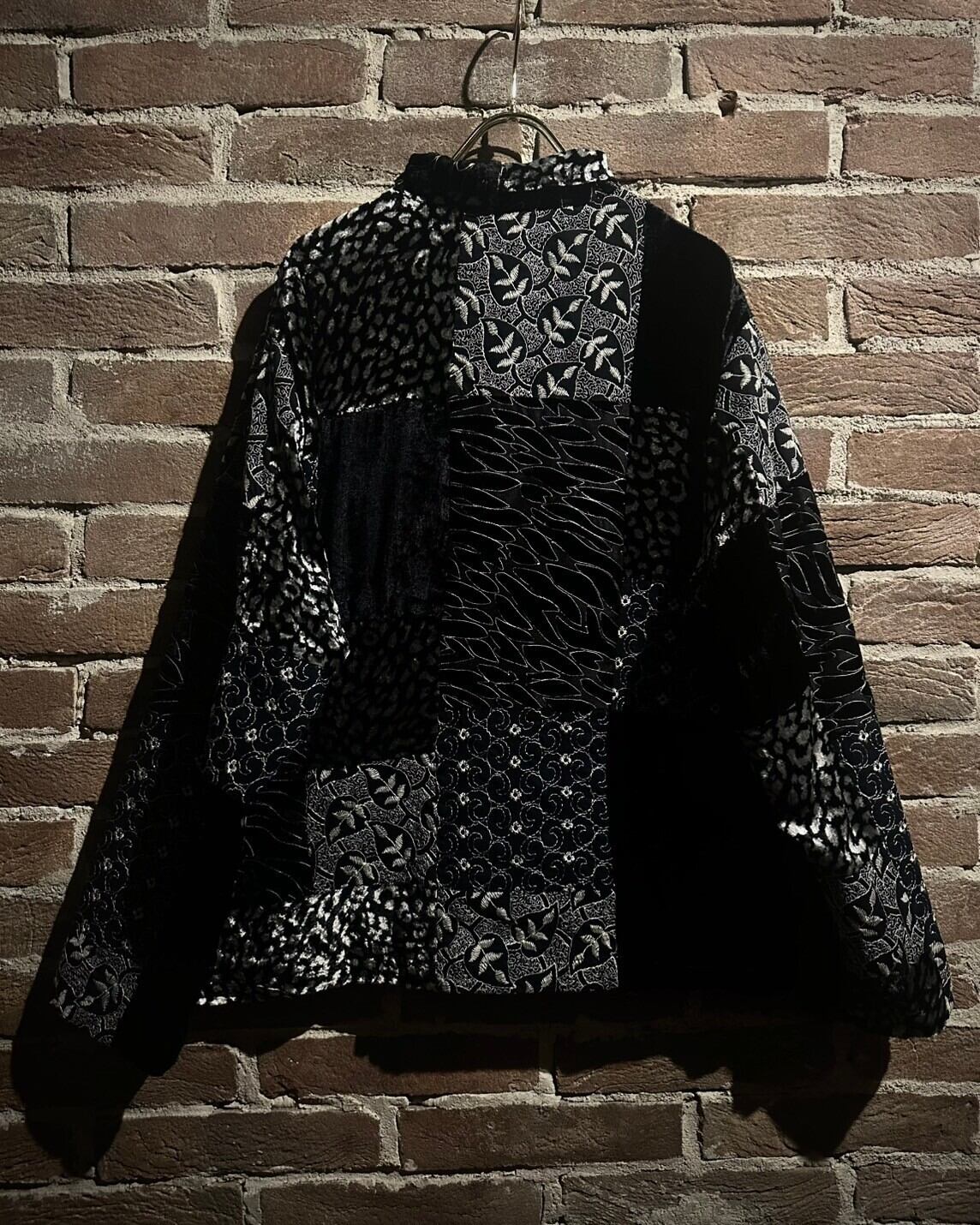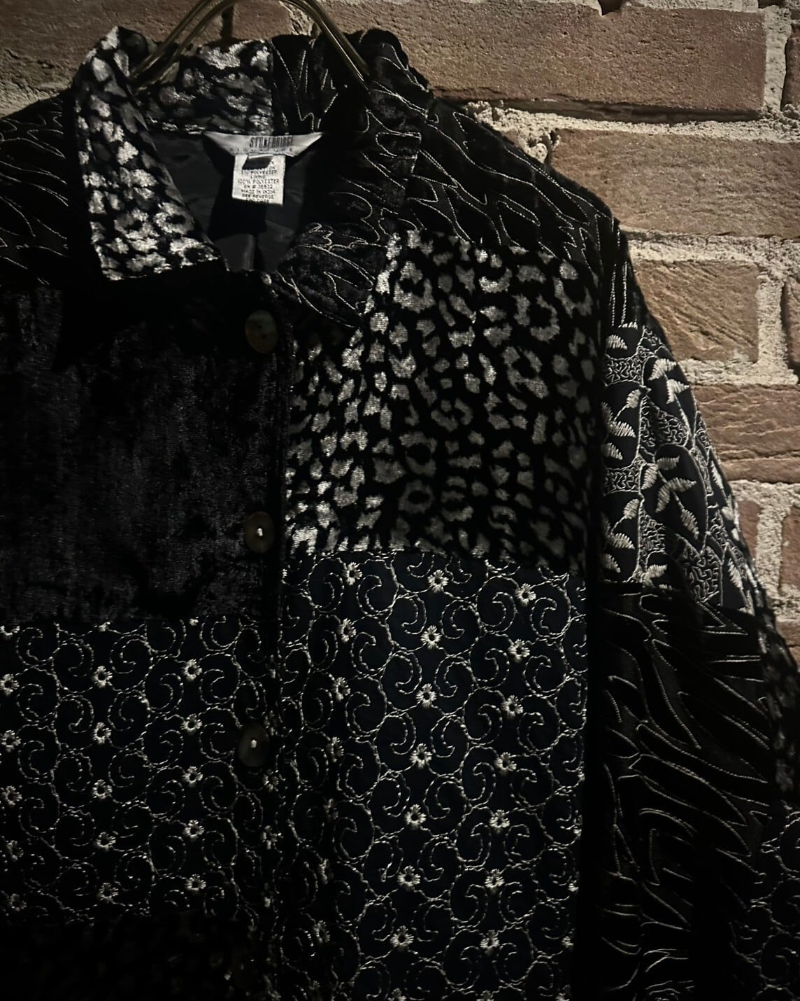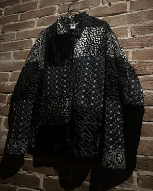 黒、シルバーのカラーでパッチワーク風に切り替え、レオパード柄、花柄、抽象柄を載せたシャツジャケット。