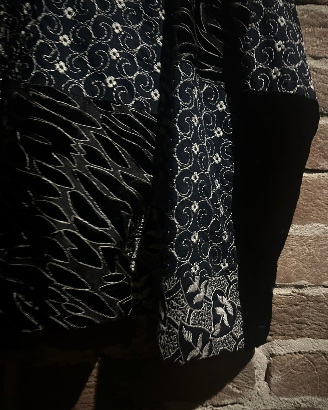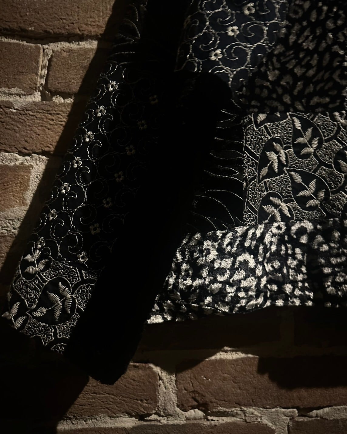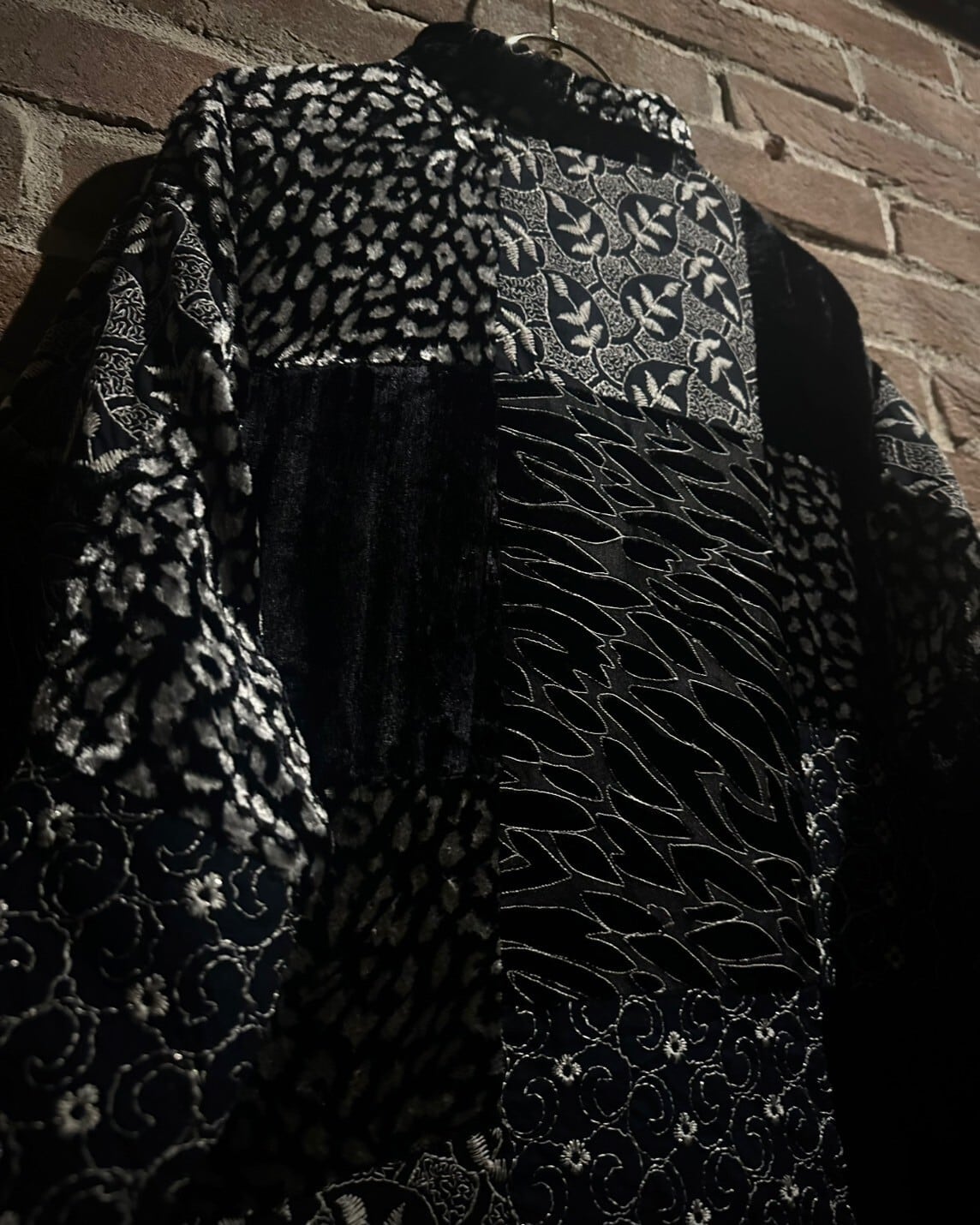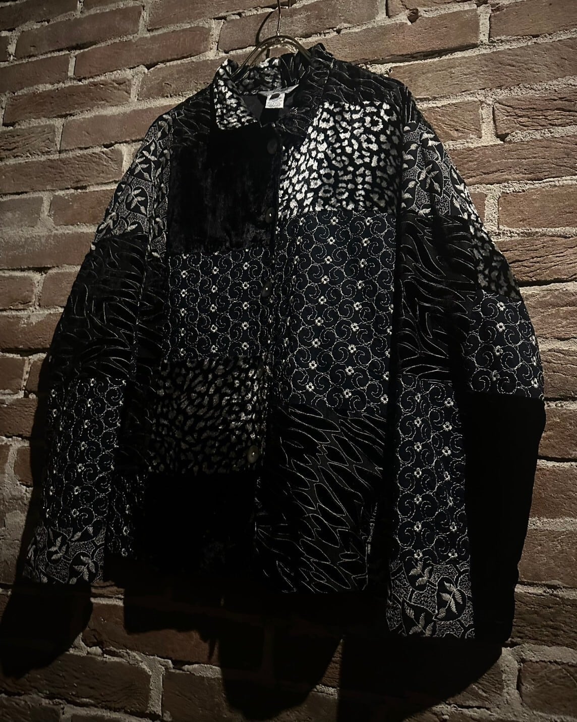 ベロアの鈍い光沢にパッチワークの立体感が合わさり非常に存在感のある1着に。このラグジュアルなルックスが堪りません、、、随所には刺繍でデザインが施されており、よりこのアイテムのクオリティの高さを感じられます。