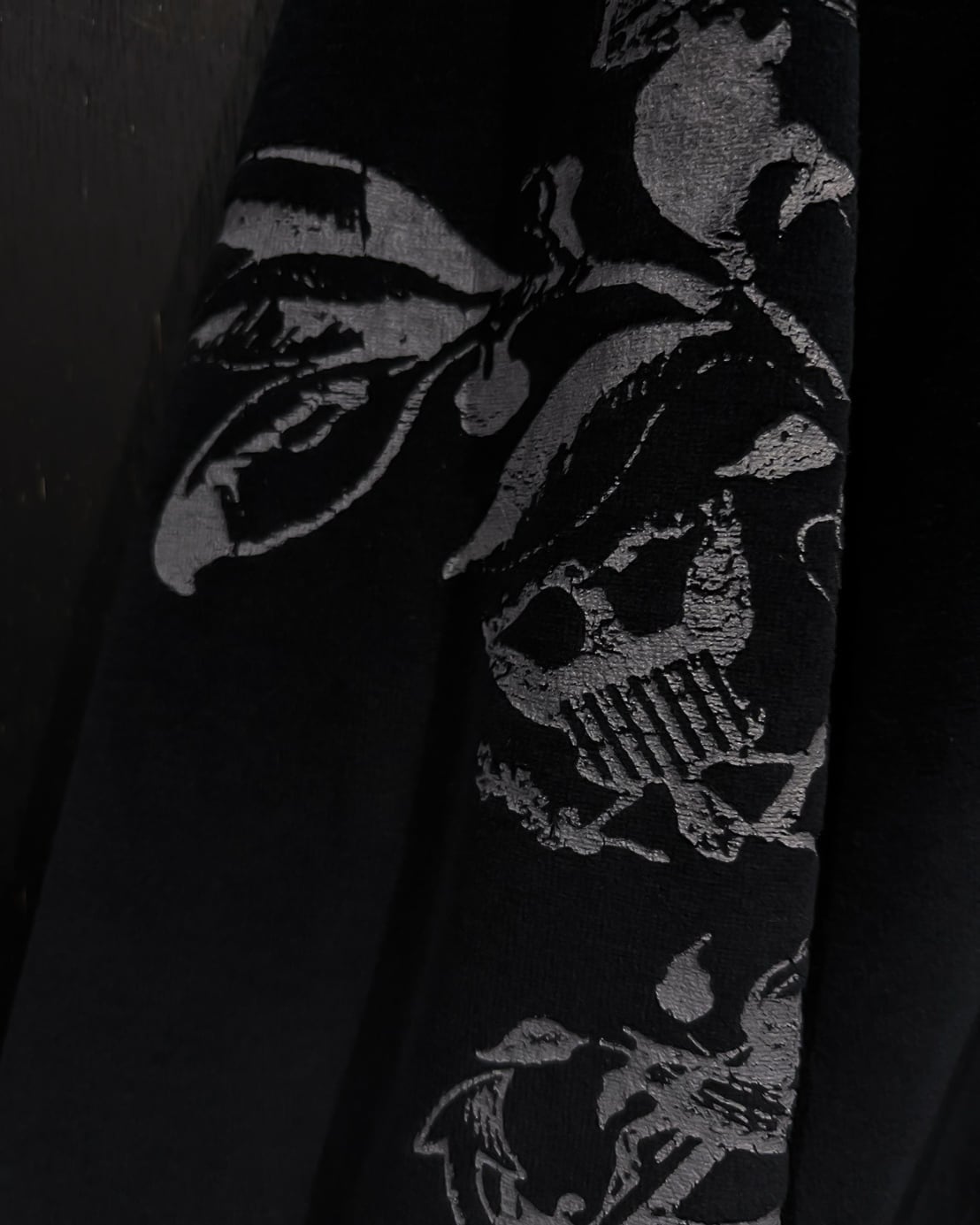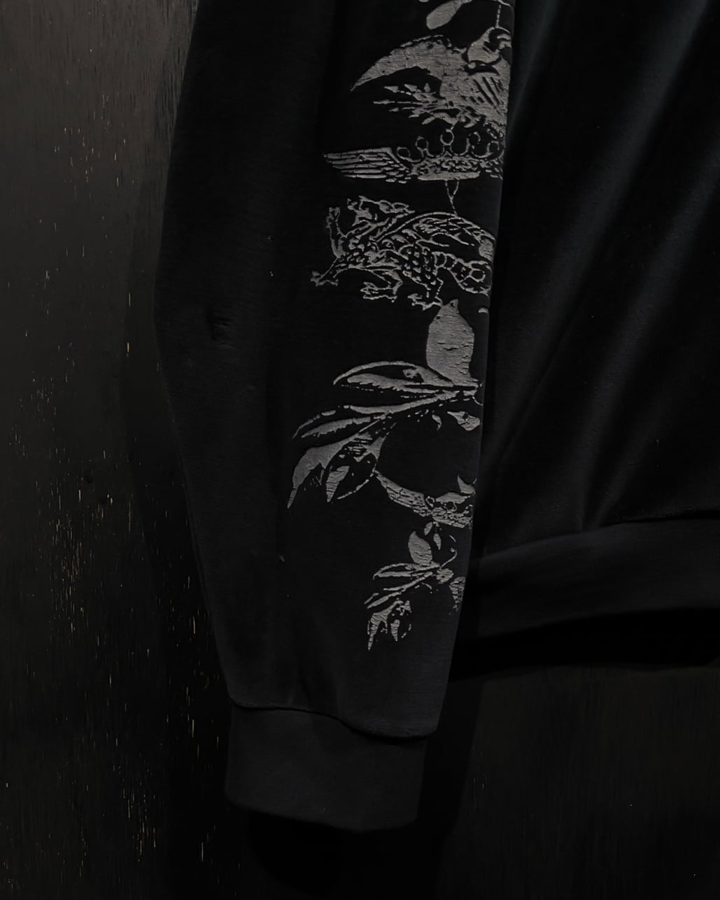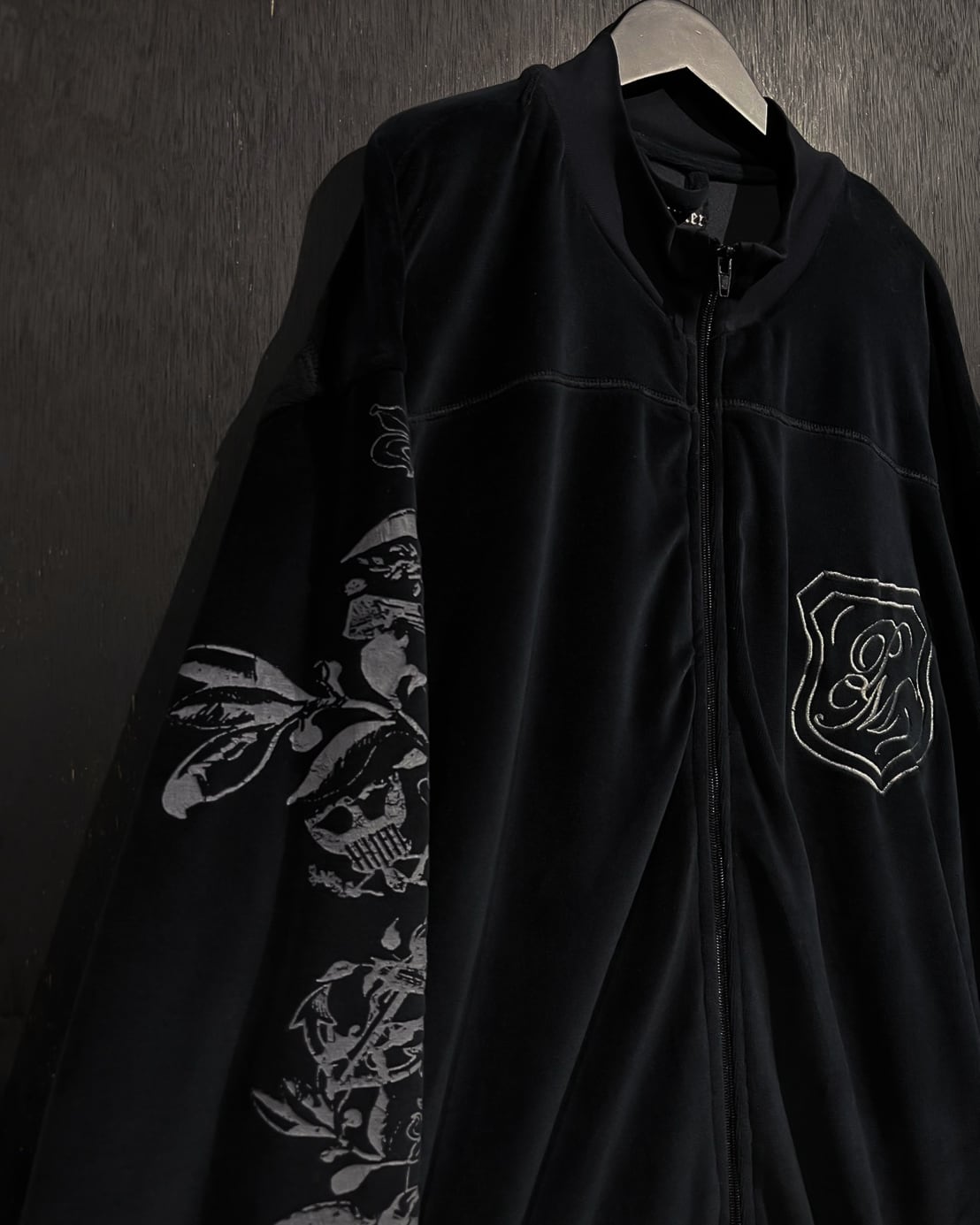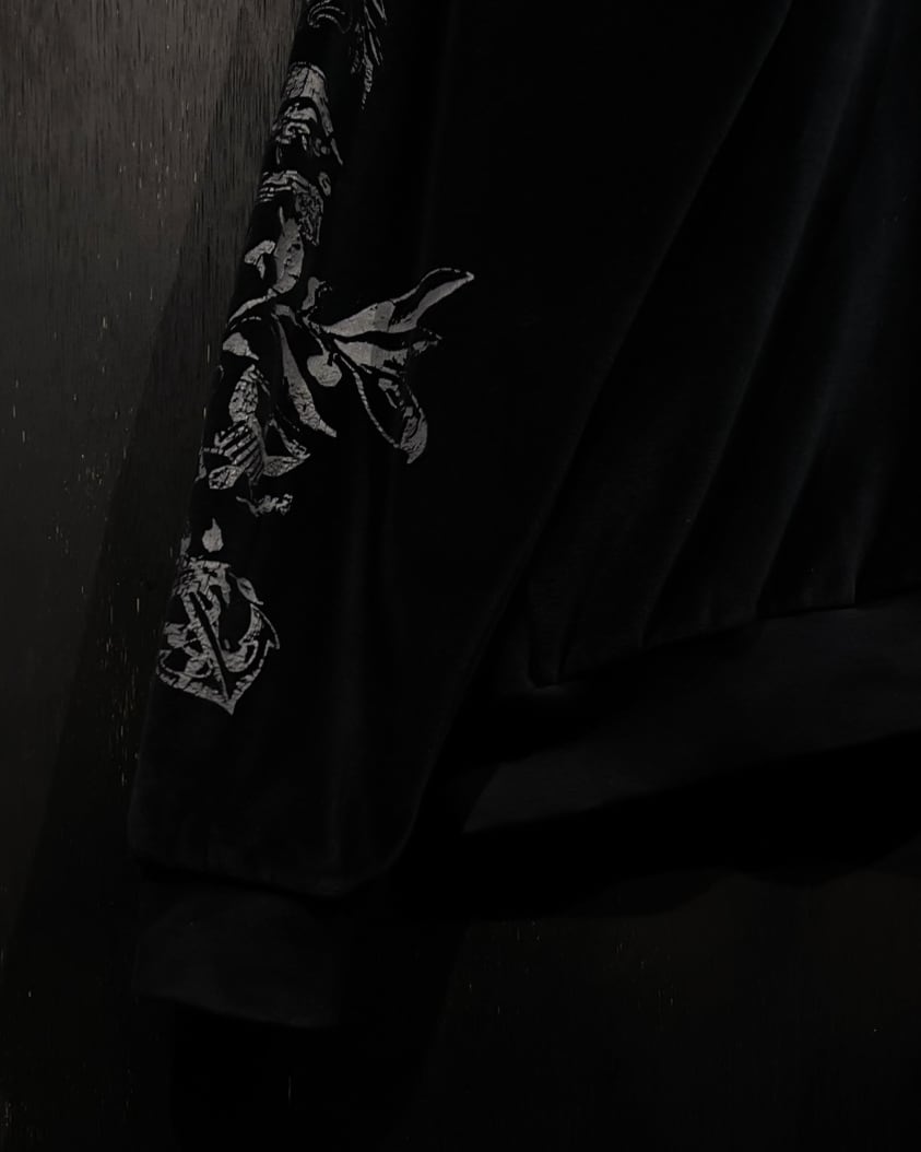 クロムハーツ等のブランドでも踏襲された、フランス王家の紋章"フルール・ド・リス"をデザインソースに、背面にプリントで載せたベロアジャケット。