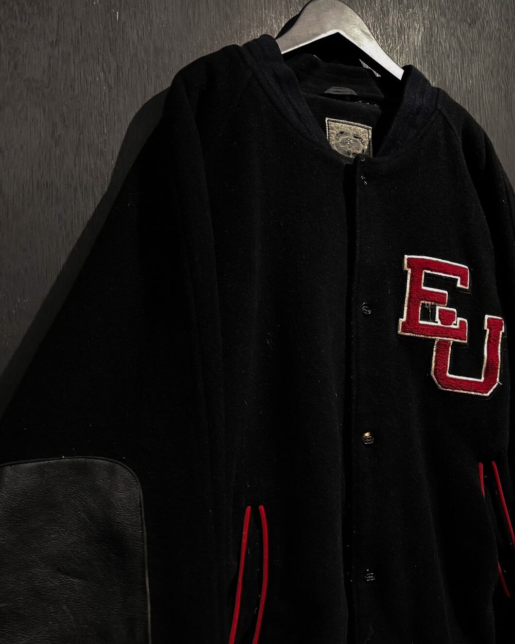 上質なウールを使用したブラックカラーをベースとしエルボーパッチに鈍い光沢を放つブラックレザーを切り替えしたスタジャン。