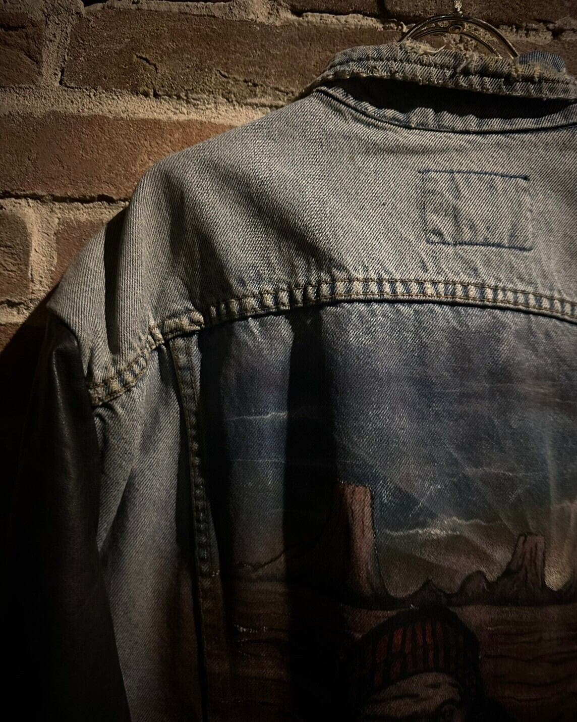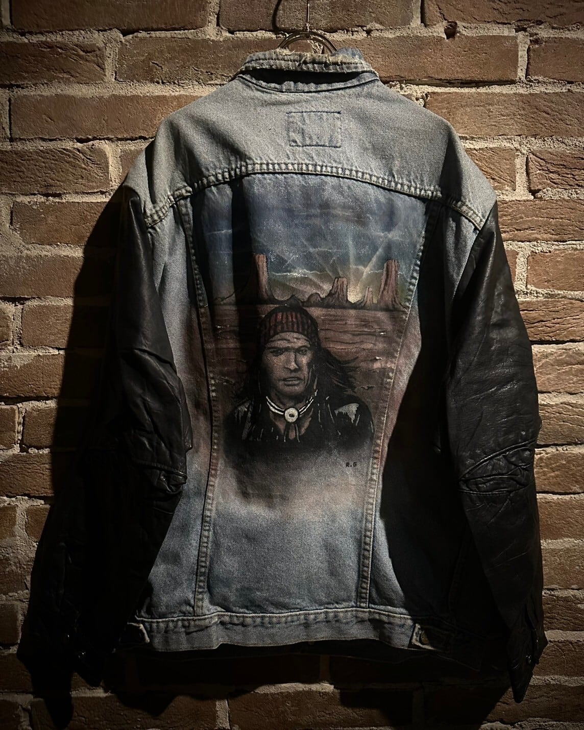 フェード感の良いデニムジャケットに、アームにはハリのあるブラックレザーを切り替え。背面にはネイティブアメリカンのデザインをハンドペイントで施した逸品。
