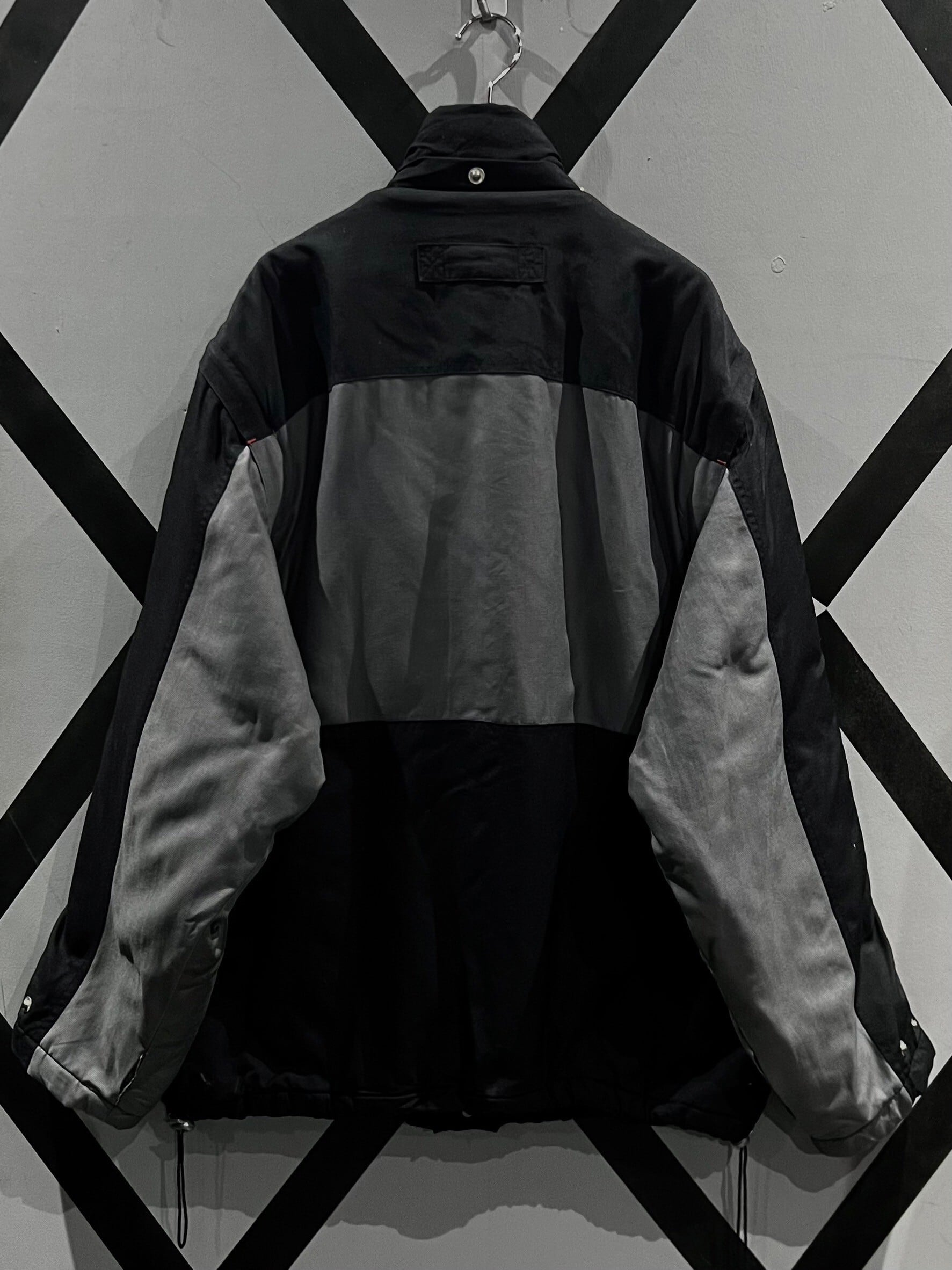 ブラック×グレーのソリッドなカラーリングで切り替え、ギアジャケットらしいギミックを盛り込んだ1着。フロントのポケットやボタン、ドローコードなど、機能性とデザイン性を兼ね備えた仕上がりに。