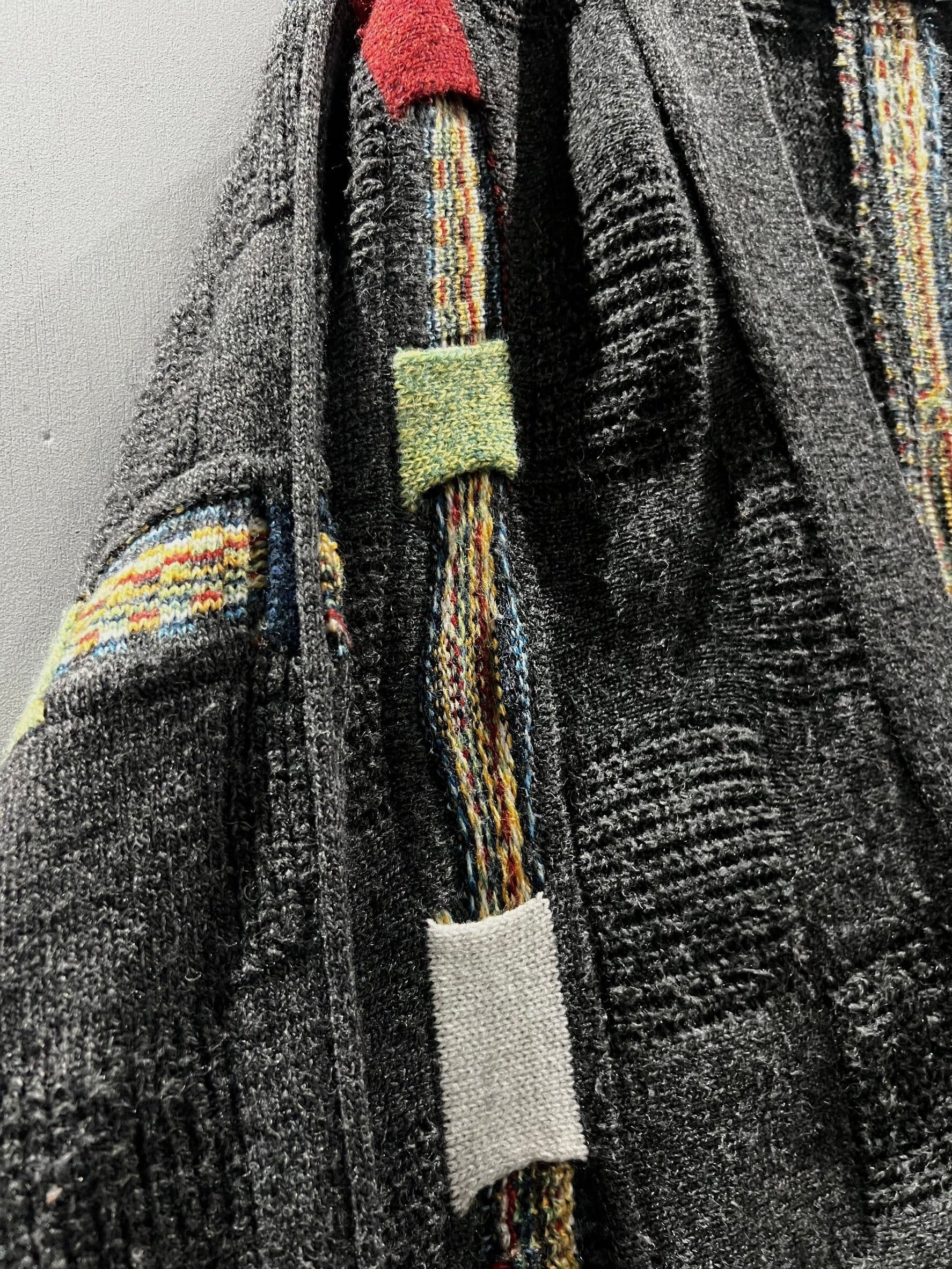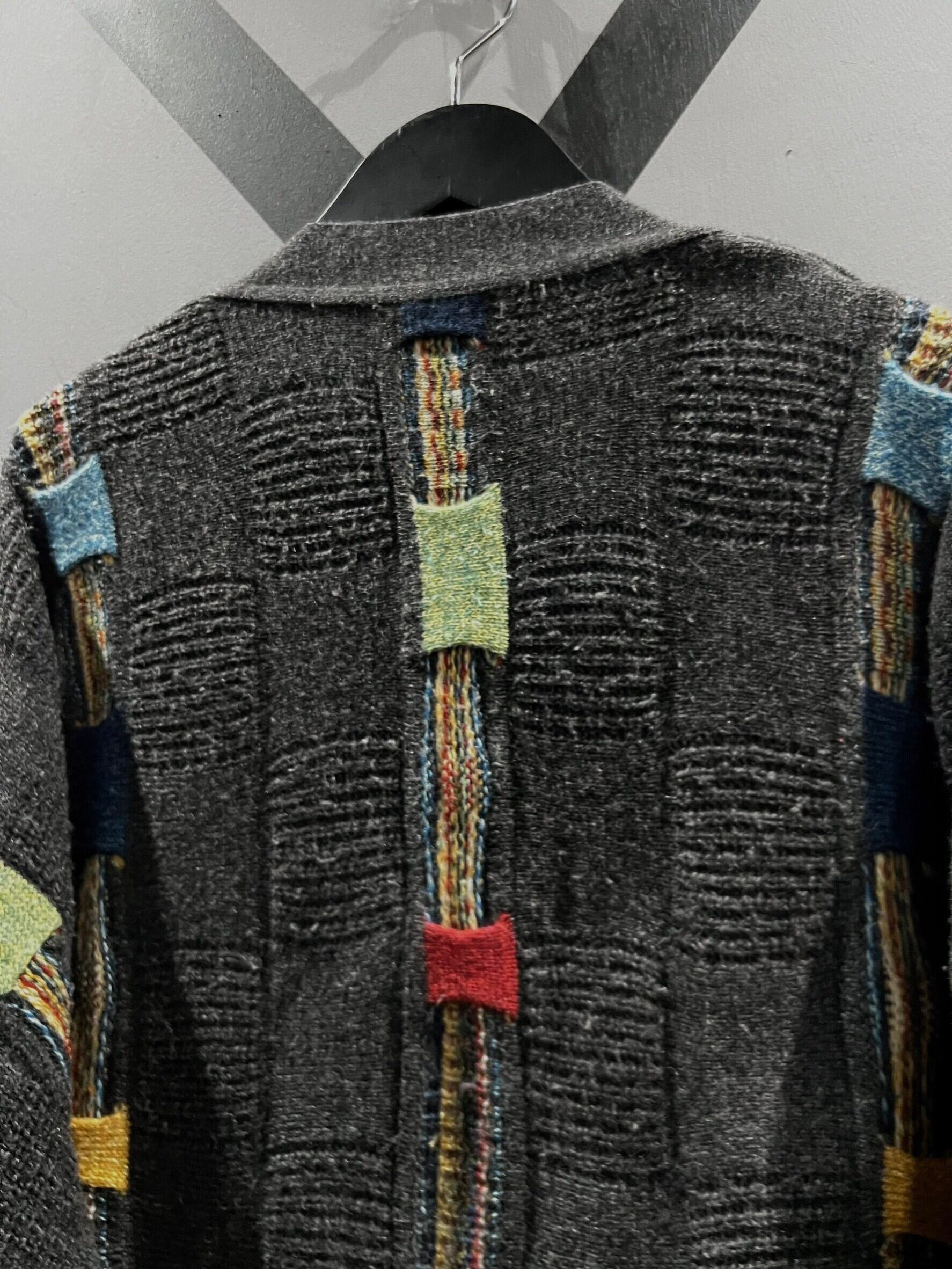 ダークグレーのボディをベースに、色鮮やかなマルチなカラーリングでニッティングを施した1着。