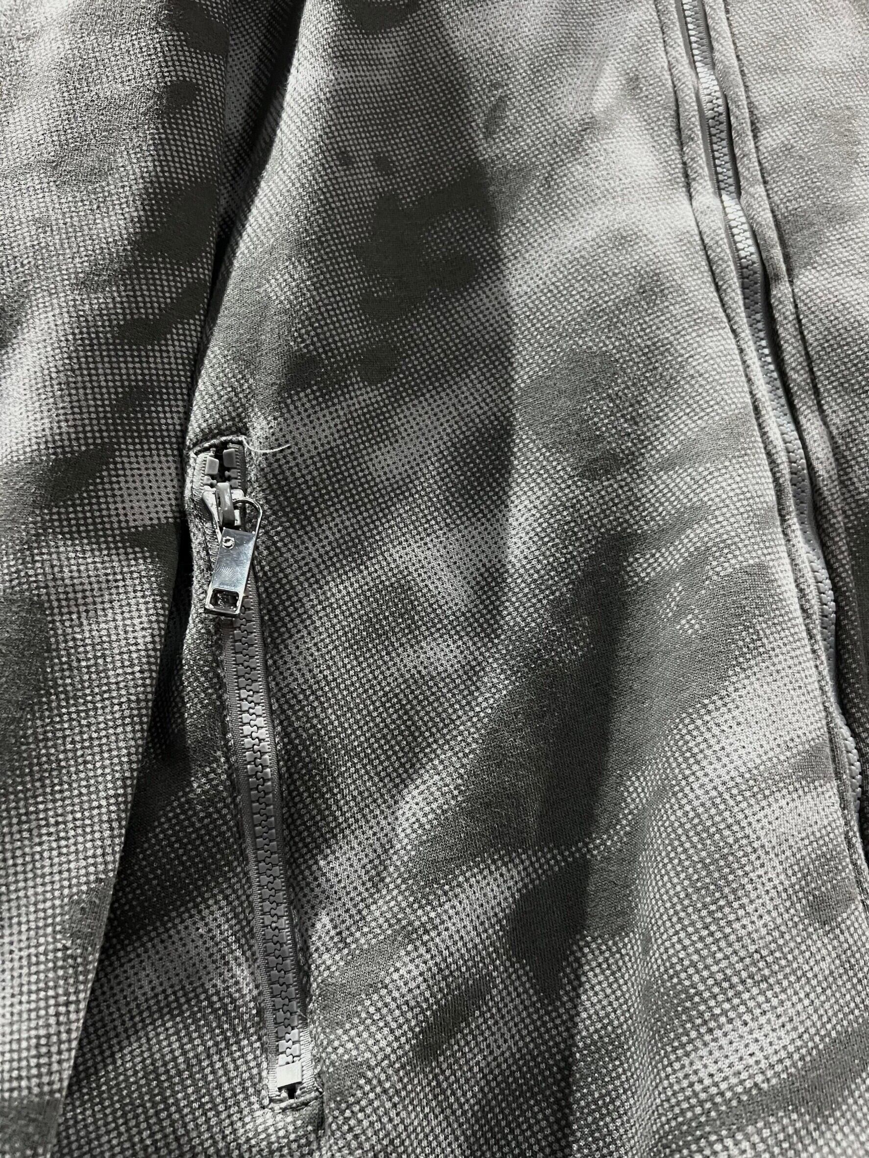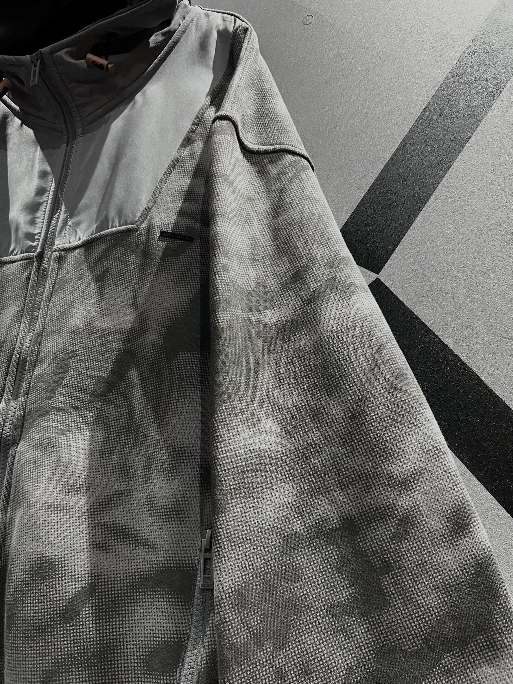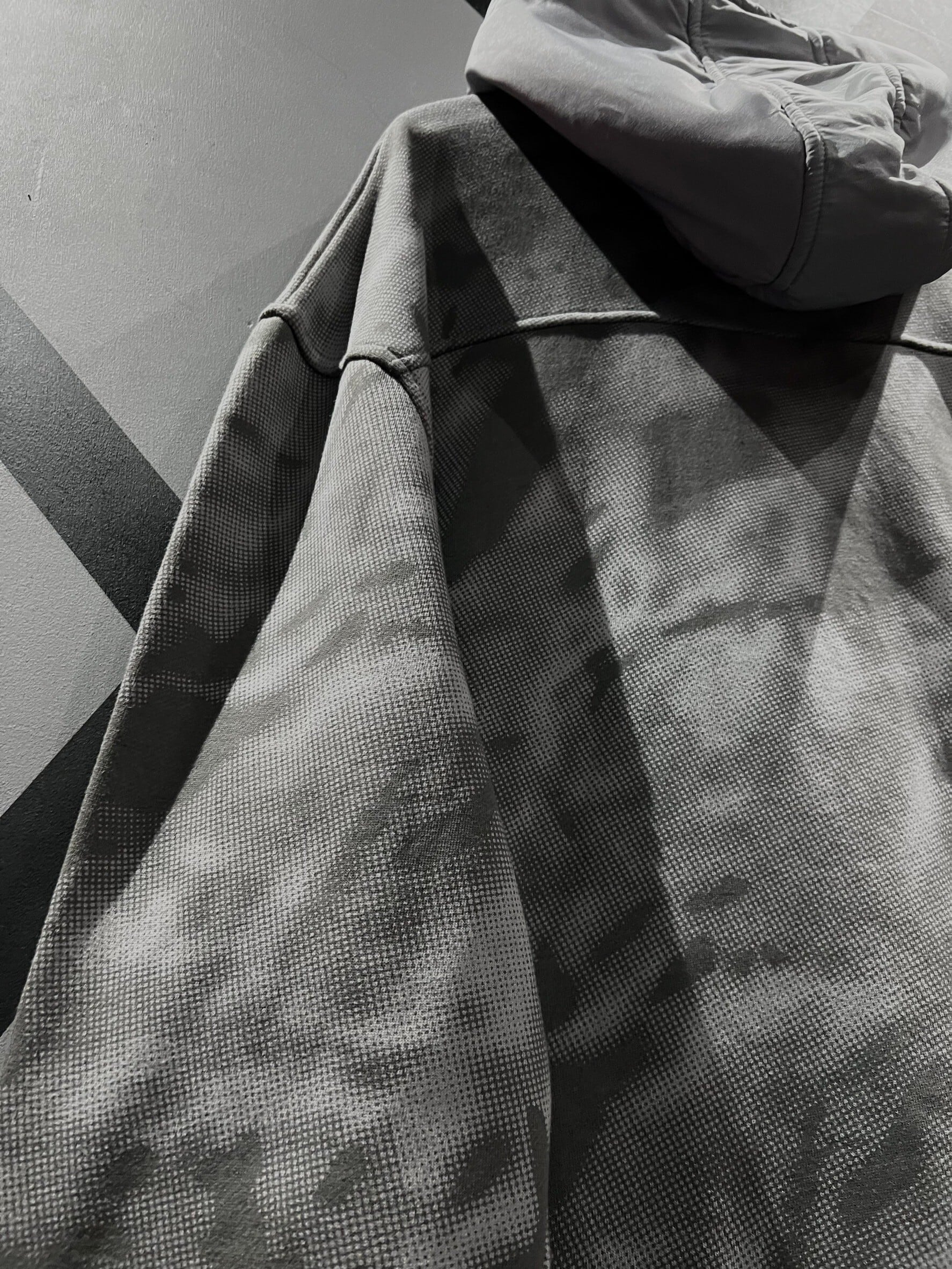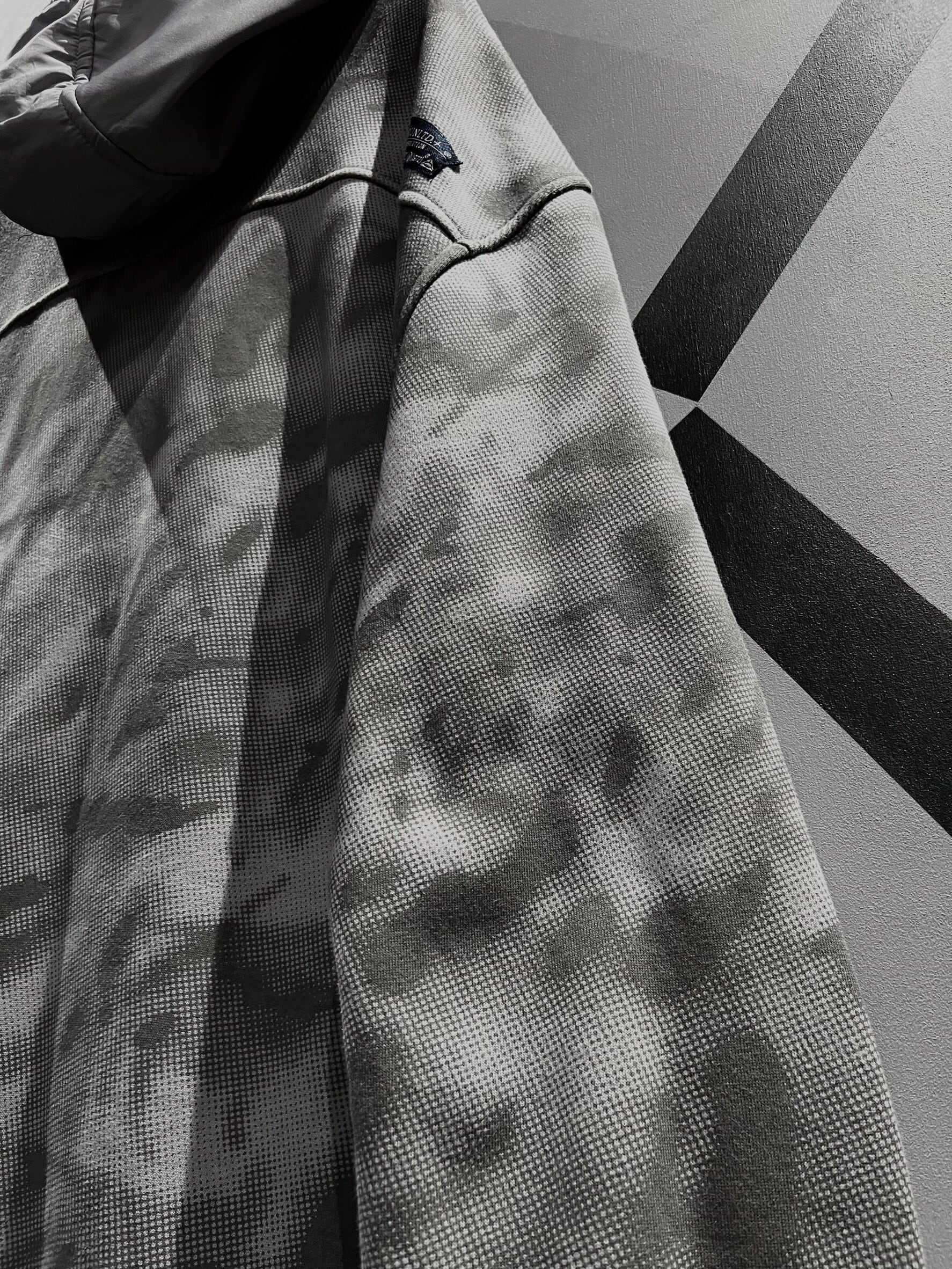 ドットワークで、モノトーンのグラデーションがかった抽象柄を載せた1着。