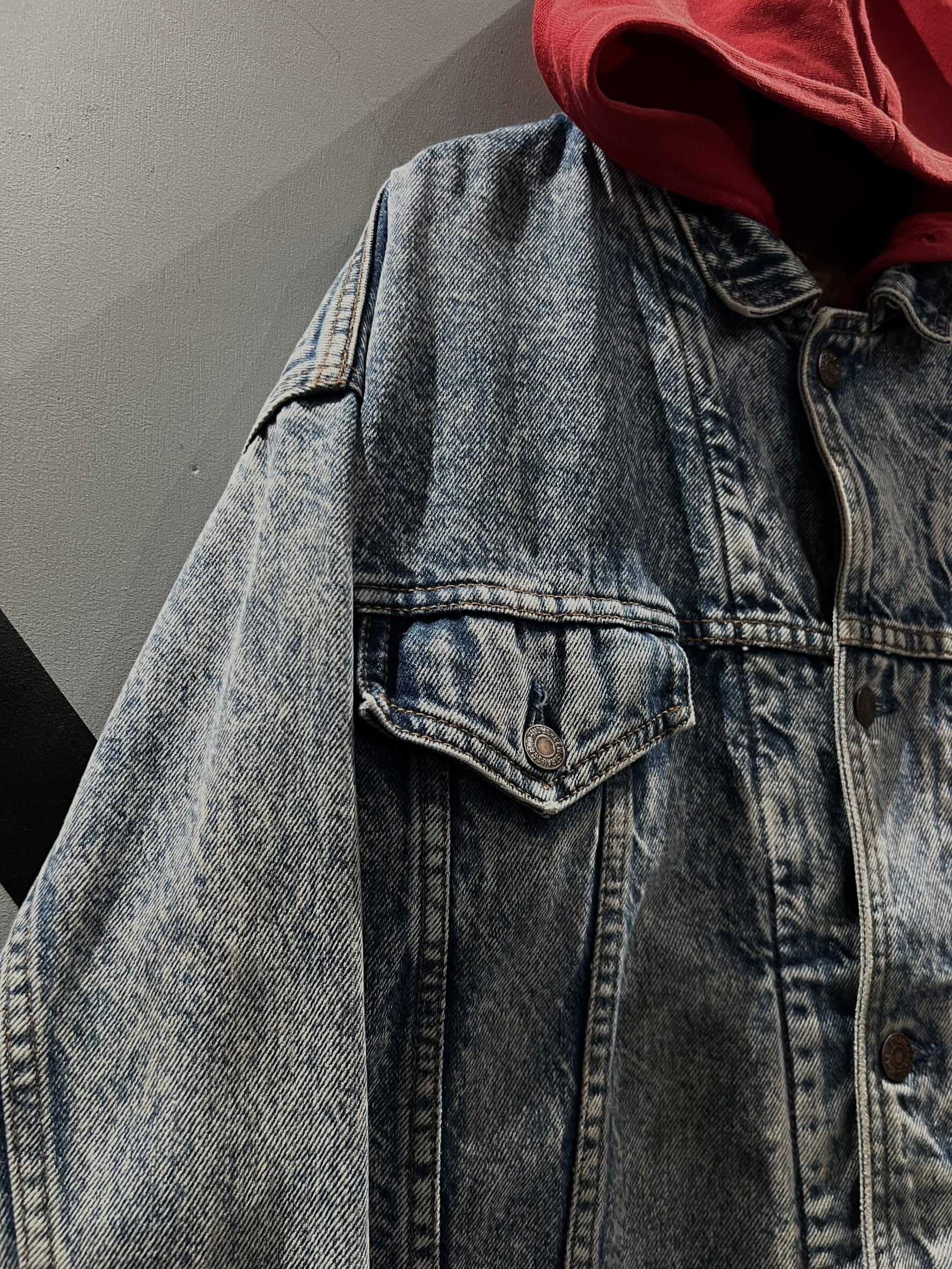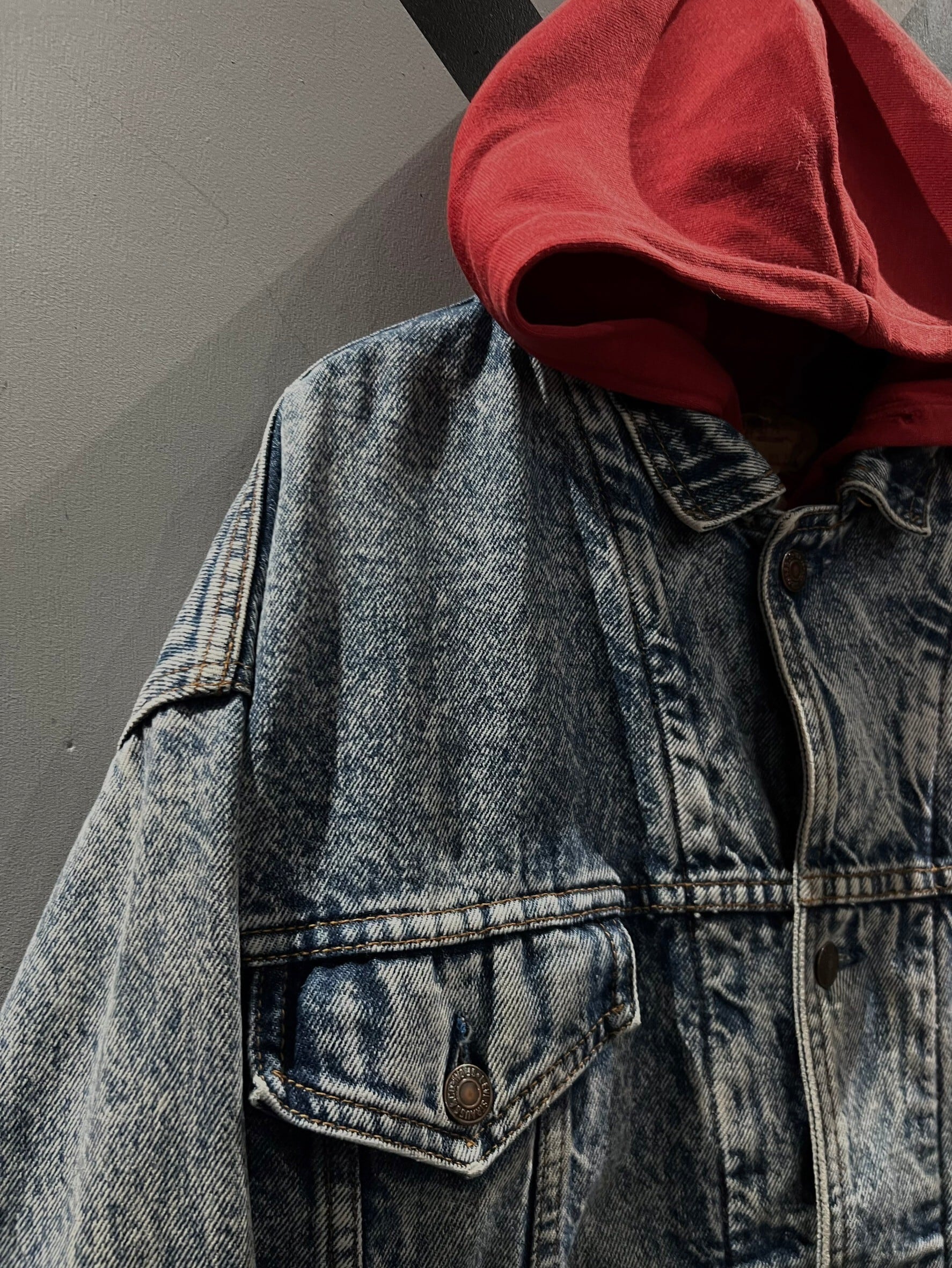 程よくフェードが効いたデニムジャケットをボディに、インナー的な感覚でフーディがレイヤード風にデザインされたジャケット。