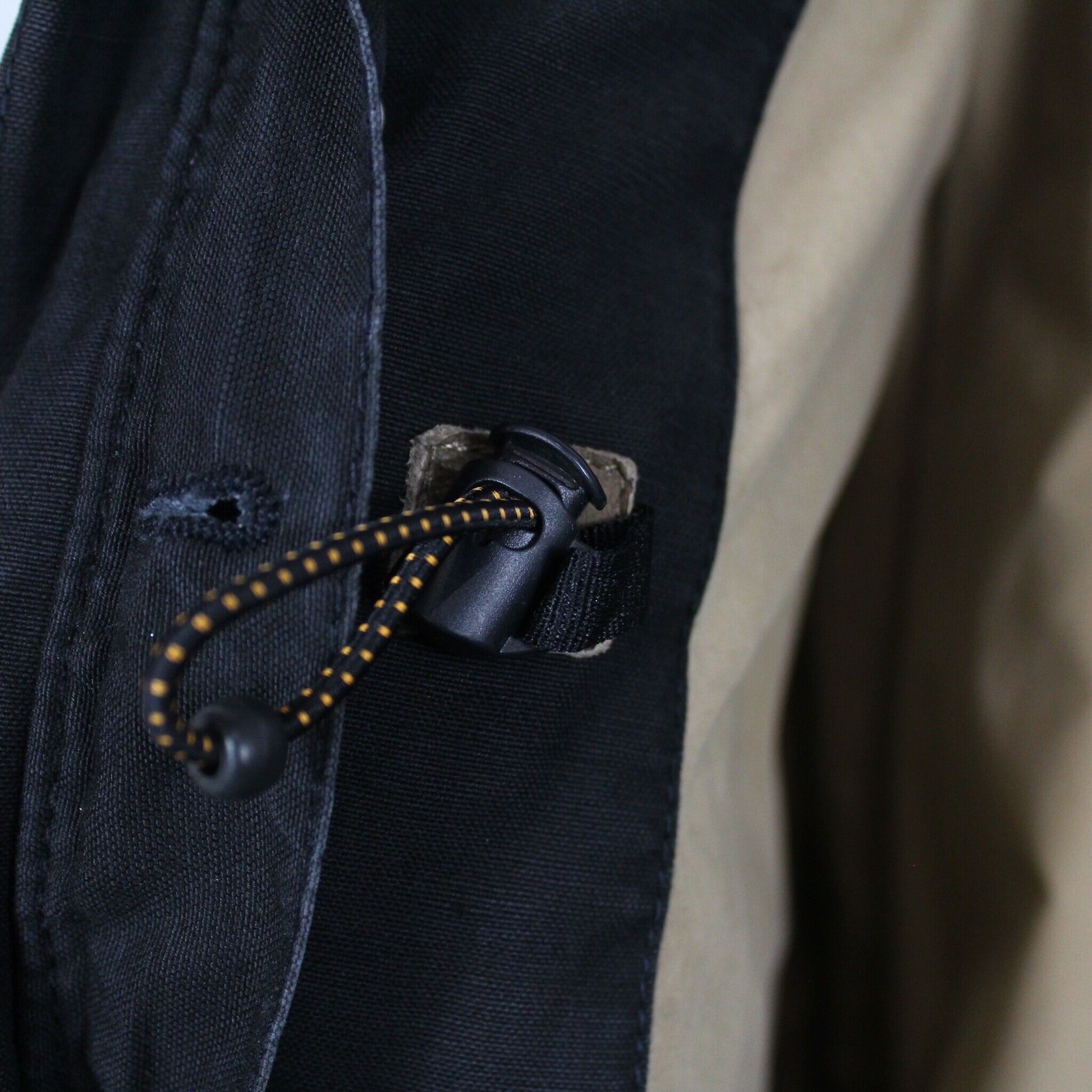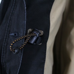 ボディフロントには大ぶりのフラップポケット、ウエストにはドローコード、首元にはチンストラップを施しスタンドカラーに仕様変更可能。肩にはアクションプリーツが施されており、機能的なギミックの数々に心打たれます。