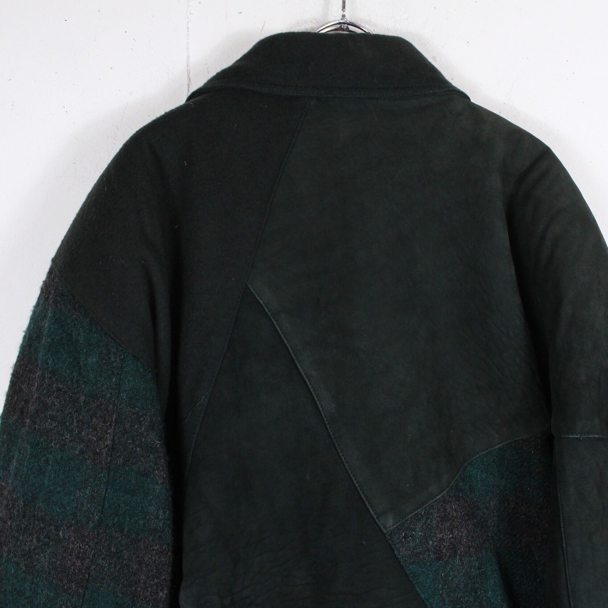 黒×グリーンのチェック柄を載せたウールを用いたボディに、しっとりとした柔らかなスエードレザーをパッチワーク風に切り替えたユーロヴィンテージ、イタリーメイドのジャケット。
