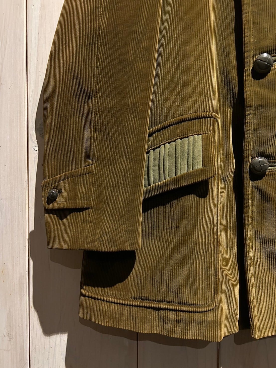 フロントには大ぶりのフラップポケット、オープンカラーですが、トップボタンにループが施されているの閉めての着用も可能です。