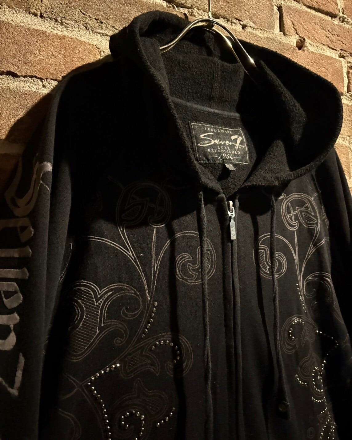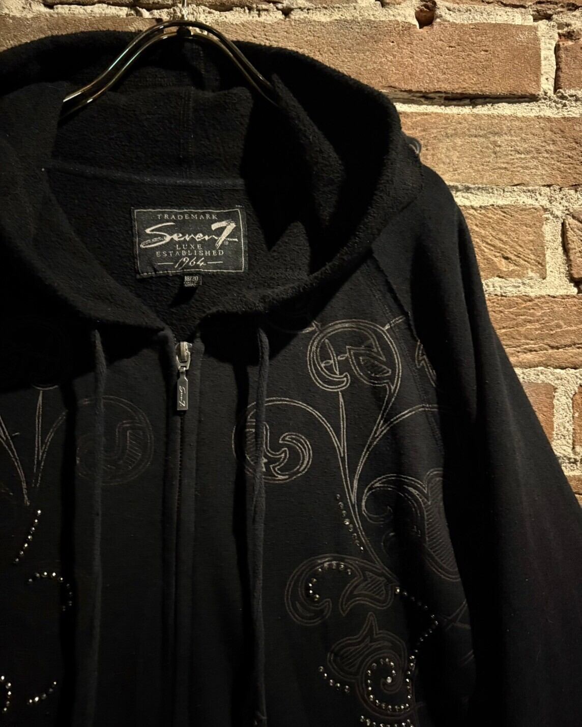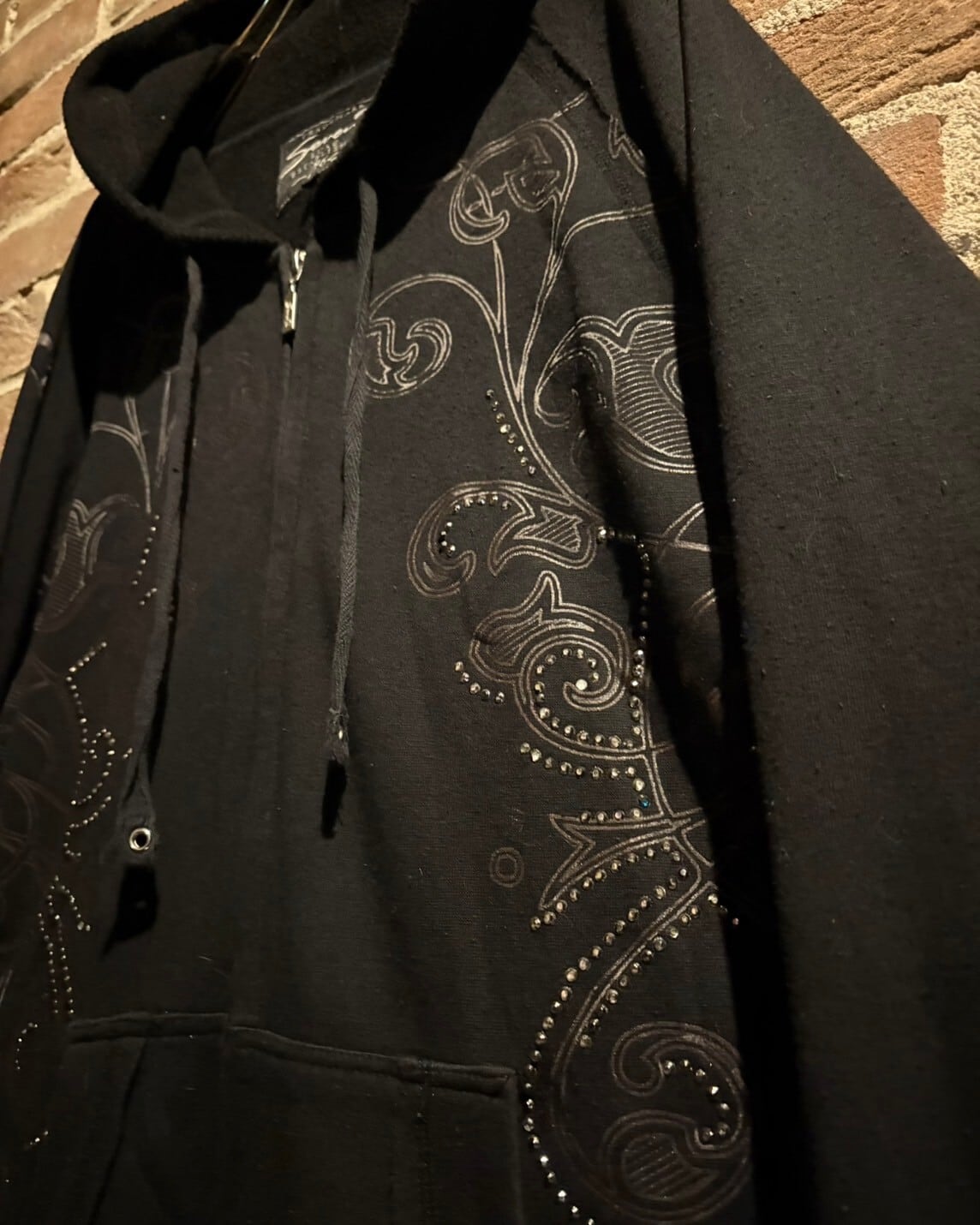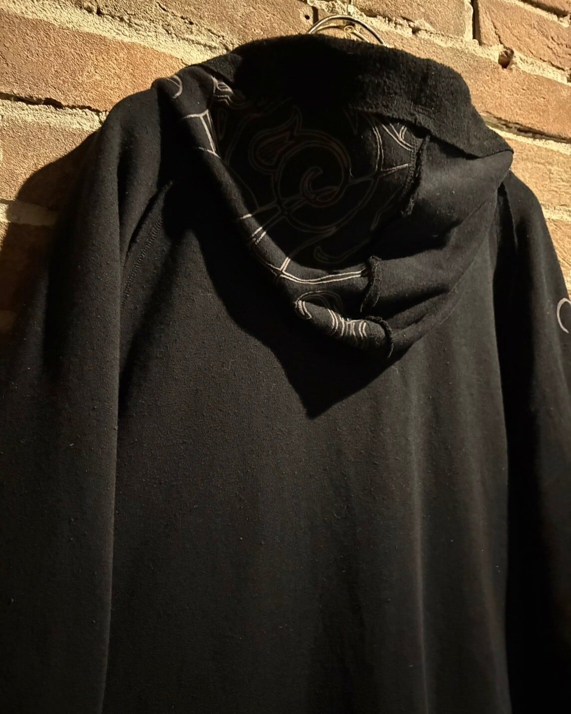 ブラックのボディをベースに、ゴシック調のデザインをプリントした、今の気分ドンズバなジップアップフーディ。