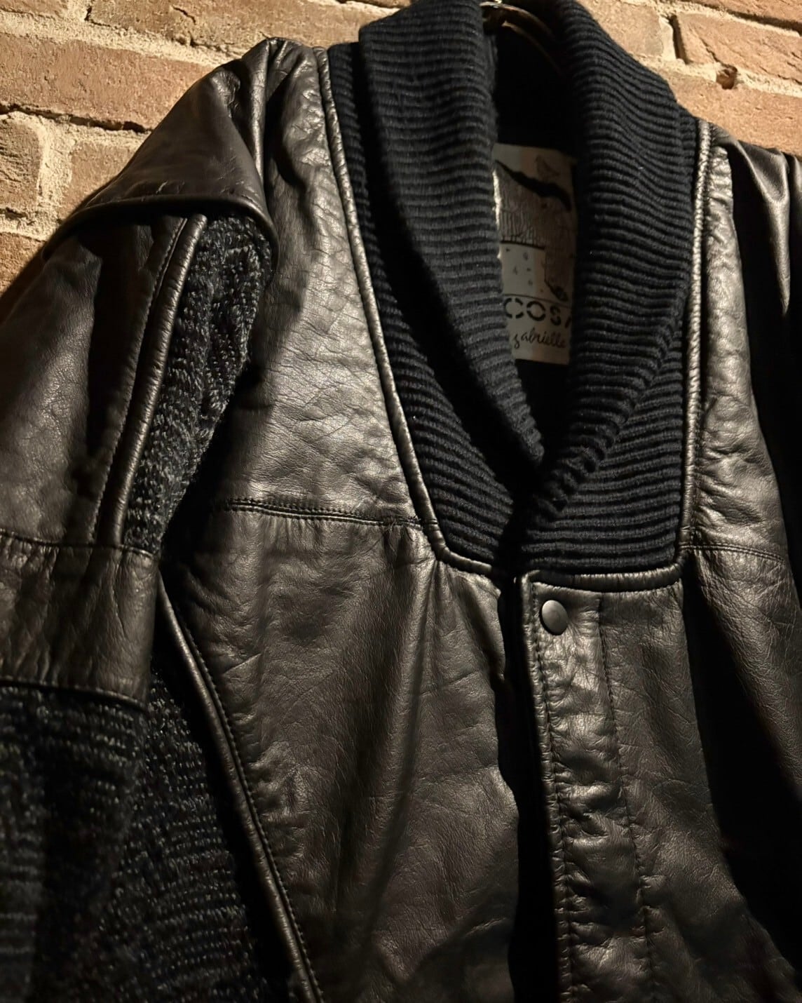 ダークや配色ながらも、ニット×レザーによって、奥行きのある表情が生み出された、秀逸なデザインバランスが素晴らしい、、、切り替えバランスも非常に良く、ヴィンテージならではの1着ですね。