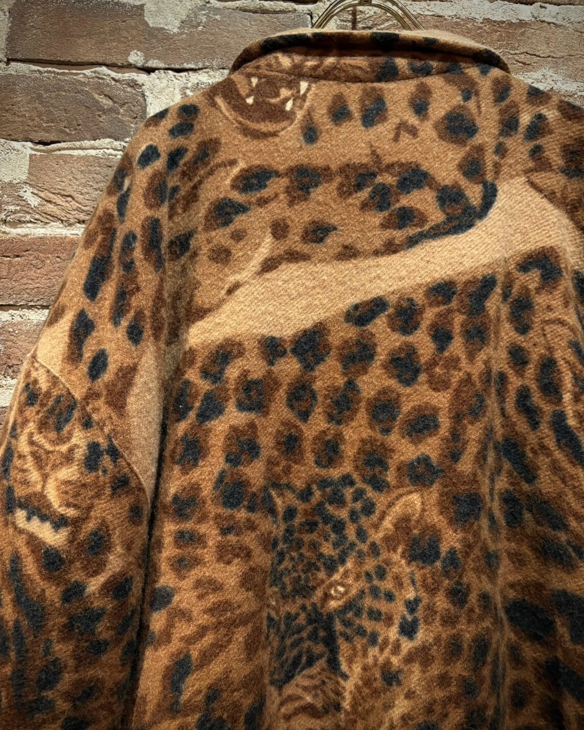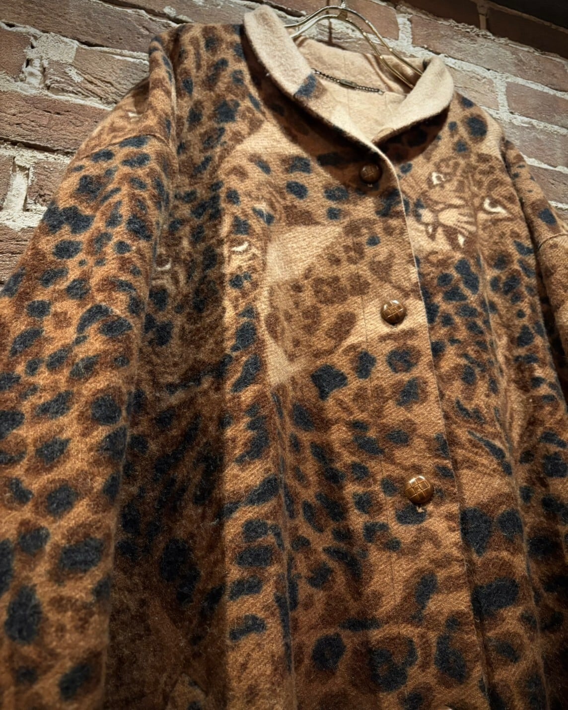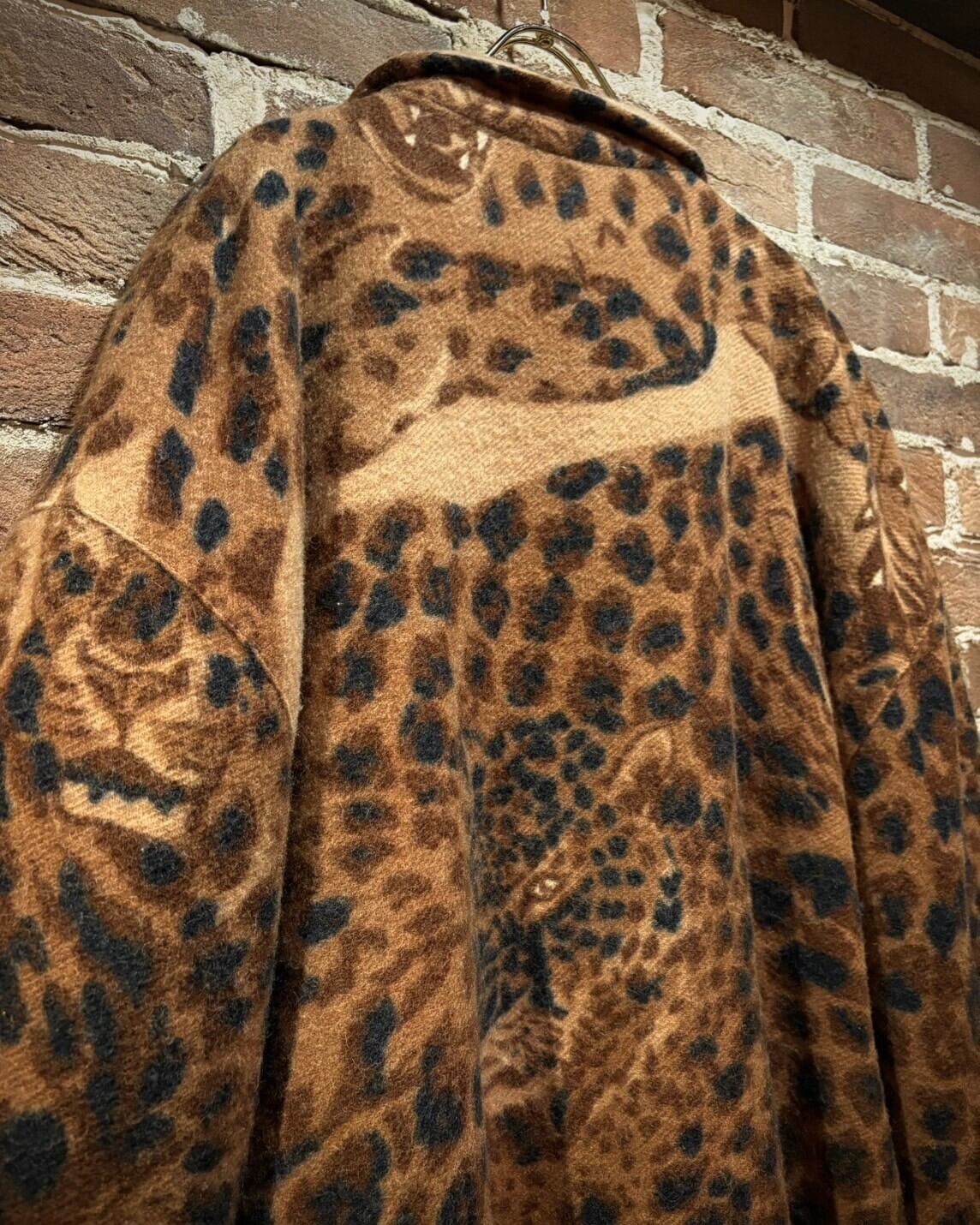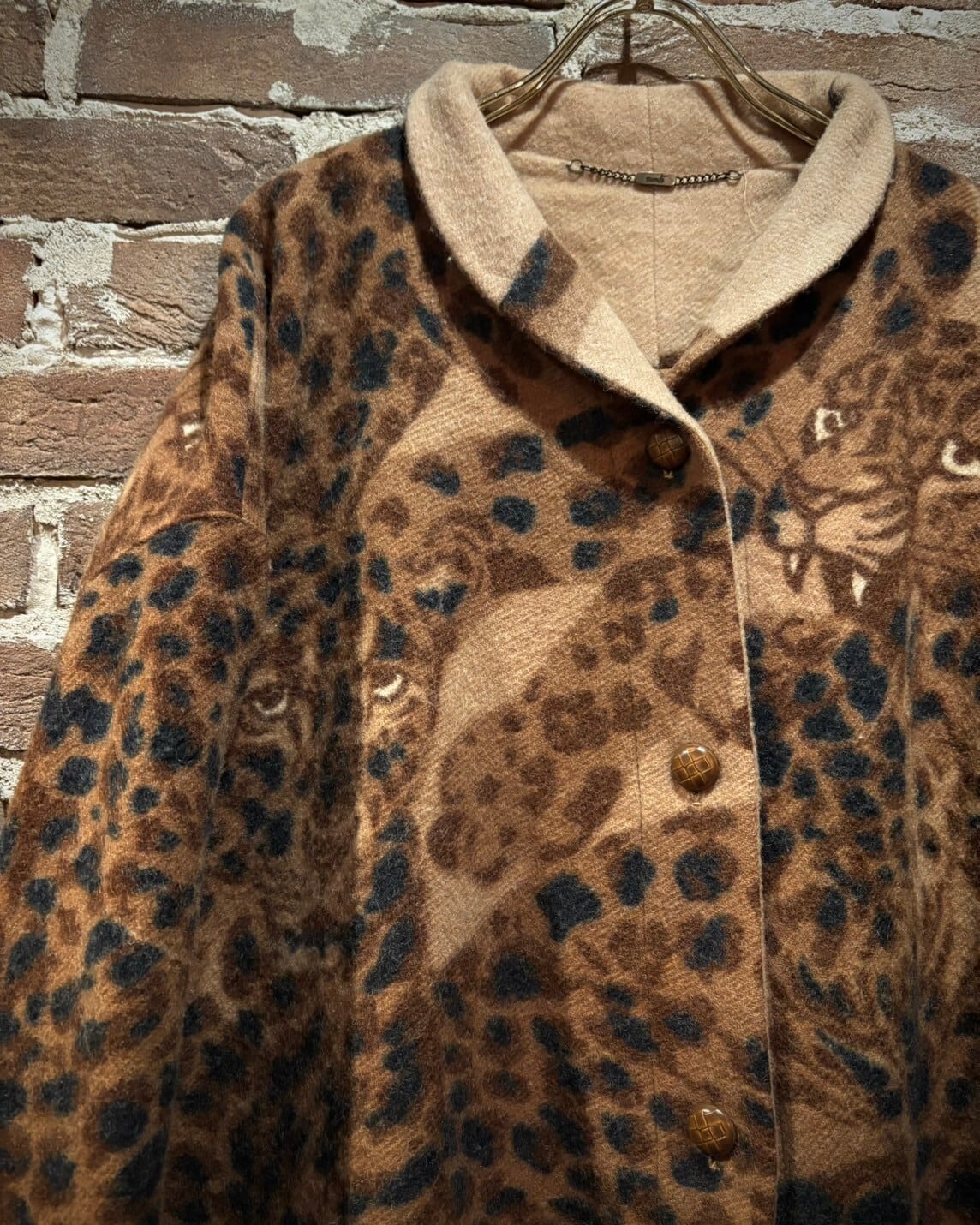 フワッと柔らかくウールを混紡した素材を用いたボディに、レオパード柄、ヒョウの顔をデザインに落とし込んだハーフコート。