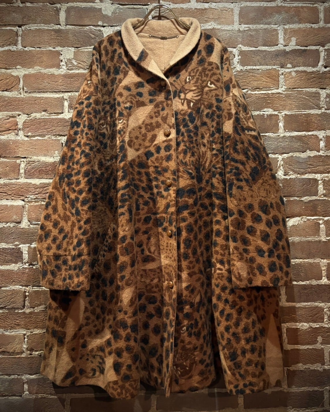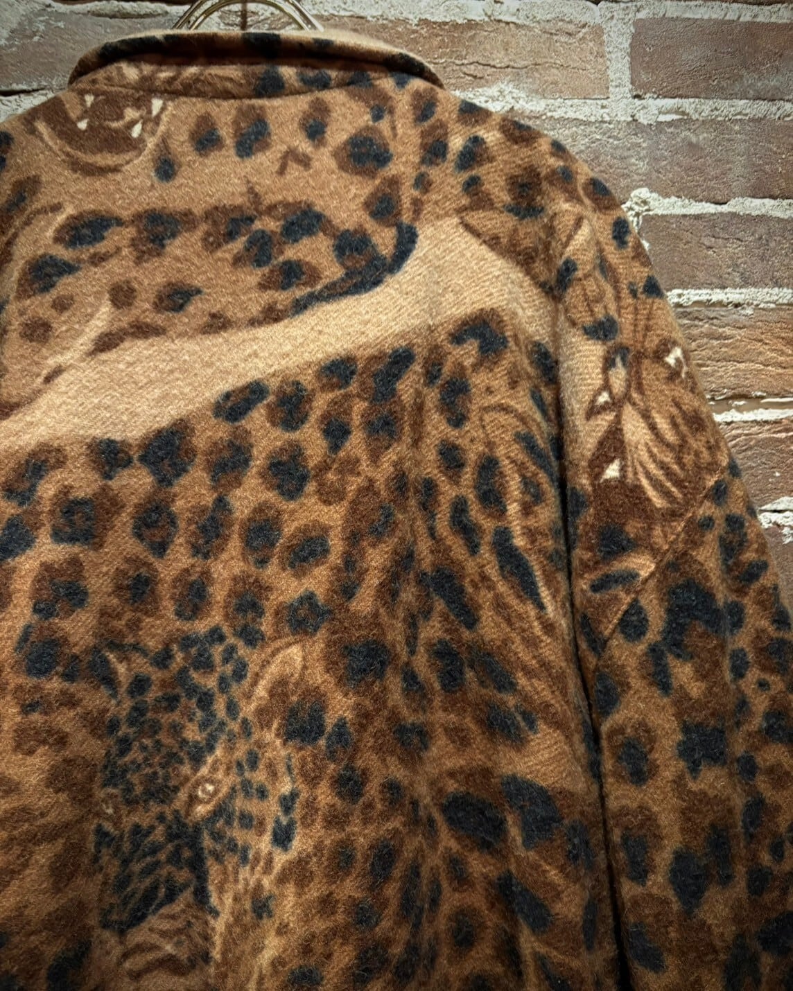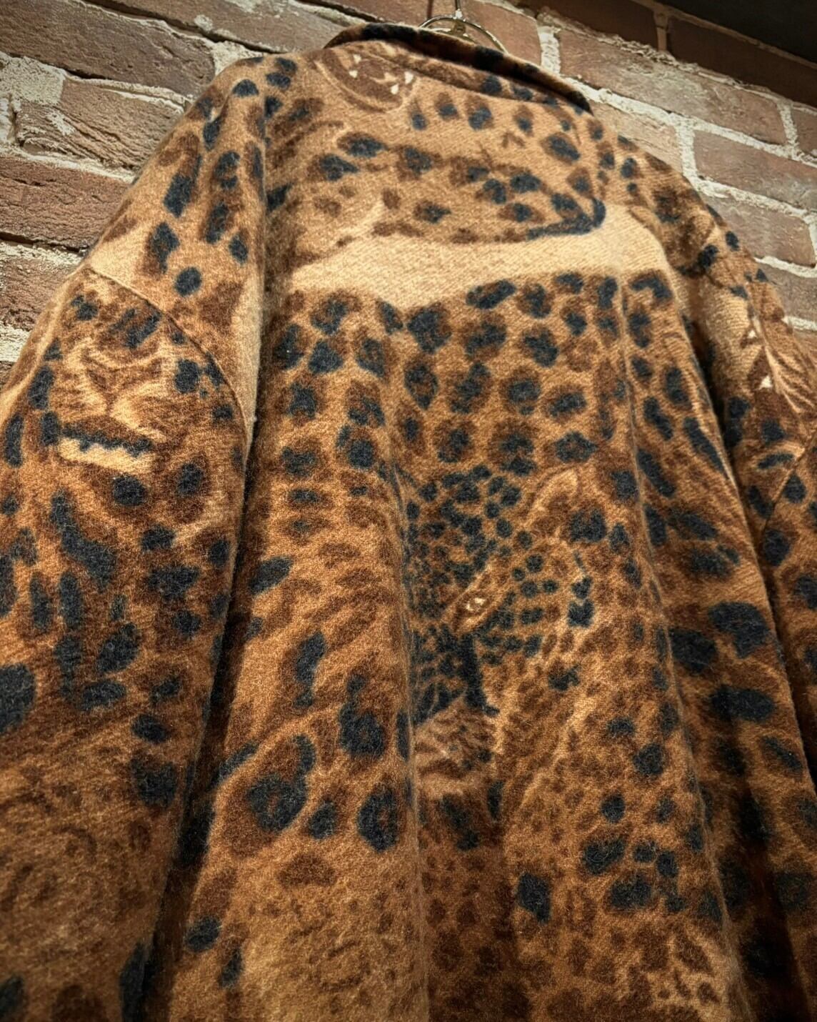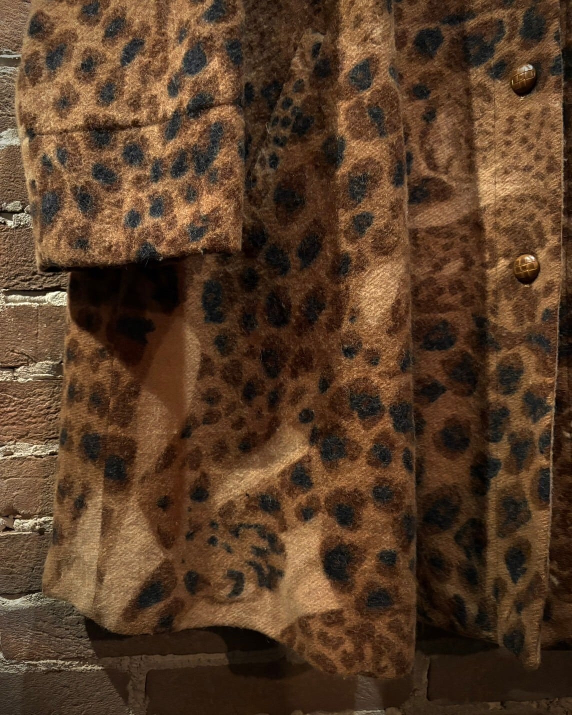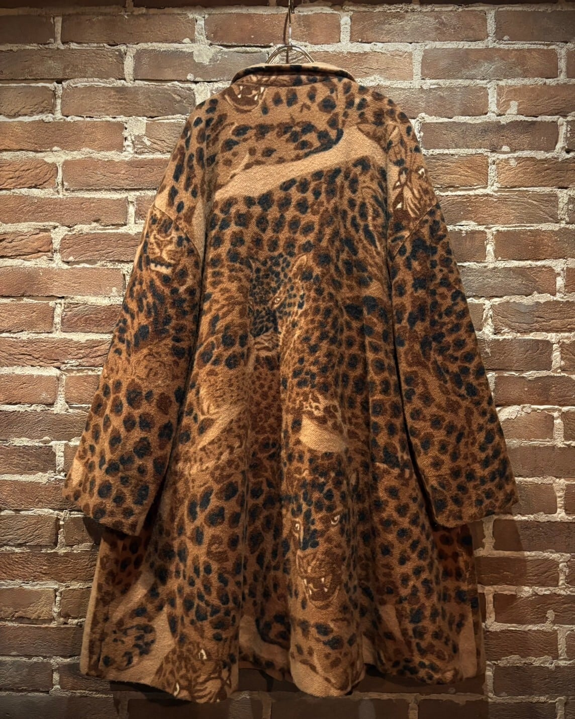 フワッと柔らかくウールを混紡した素材を用いたボディに、レオパード柄、ヒョウの顔をデザインに落とし込んだハーフコート。