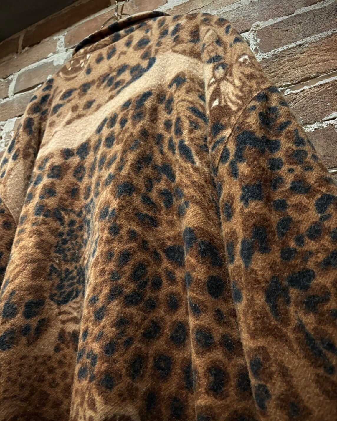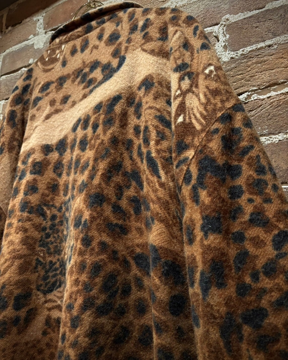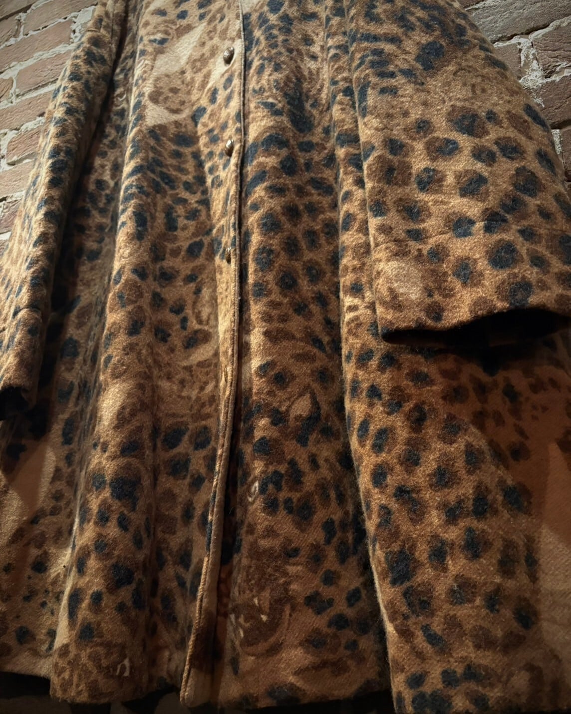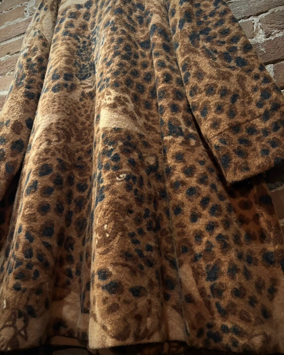 フワッと柔らかくウールを混紡した素材を用いたボディに、レオパード柄、ヒョウの顔をデザインに落とし込んだハーフコート。