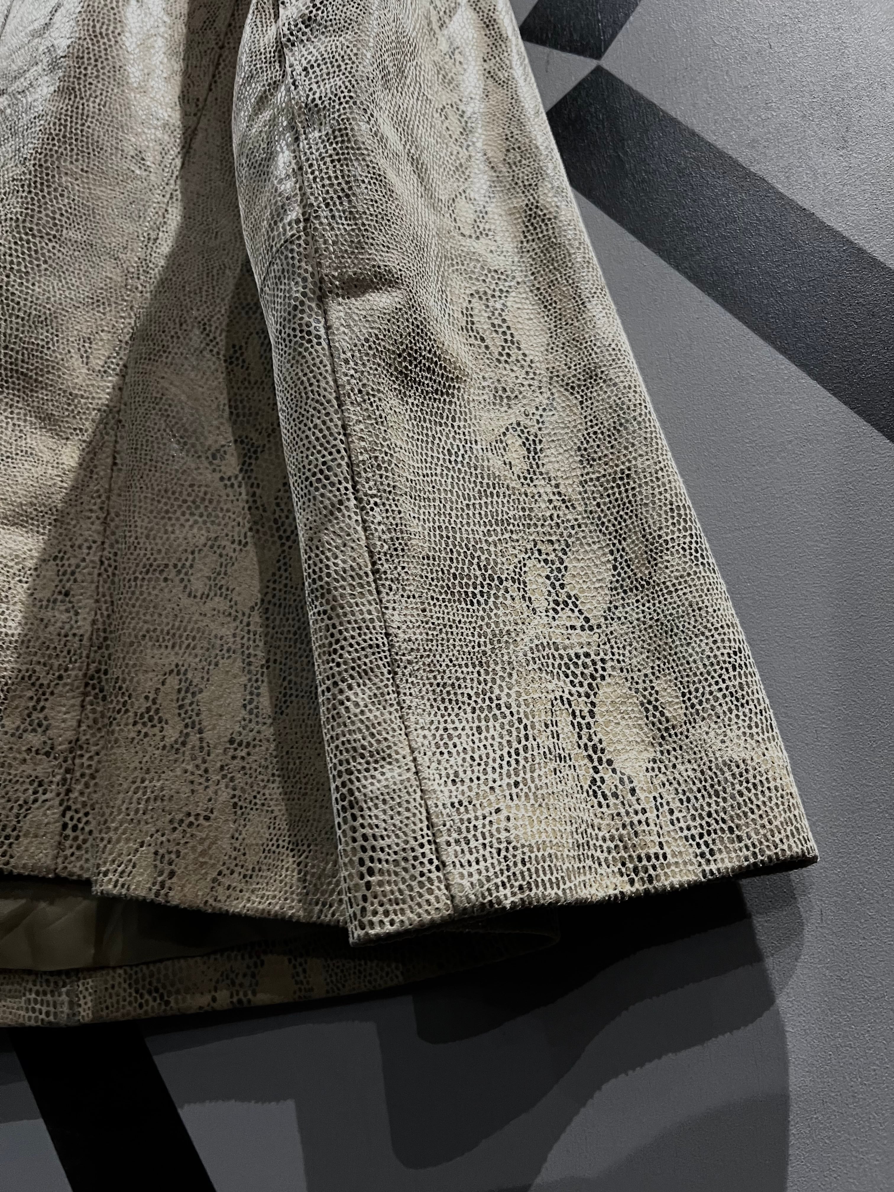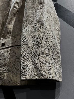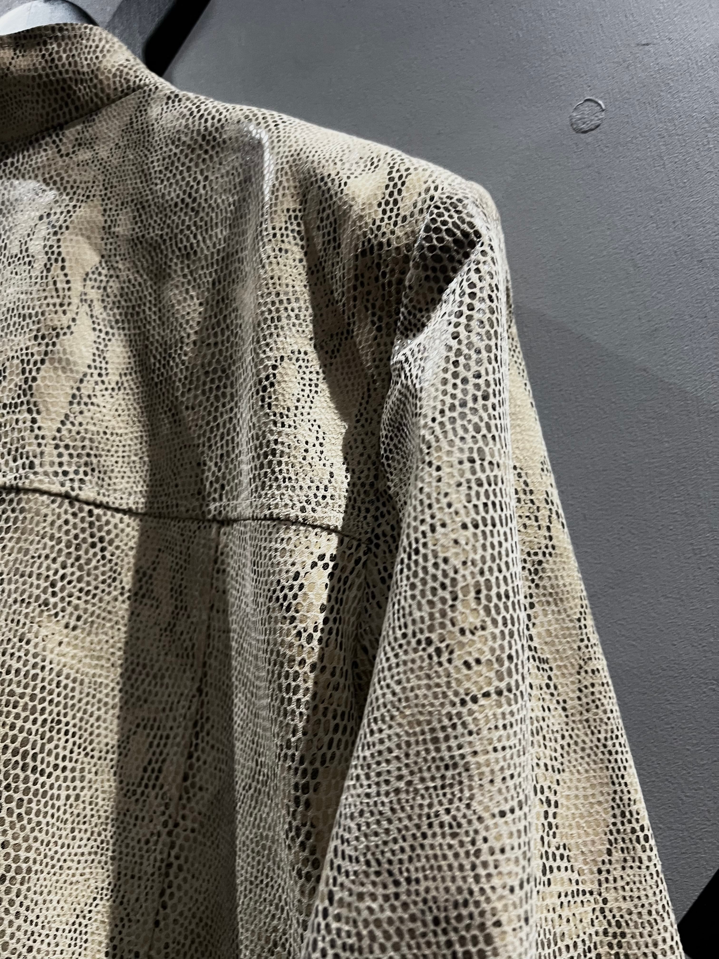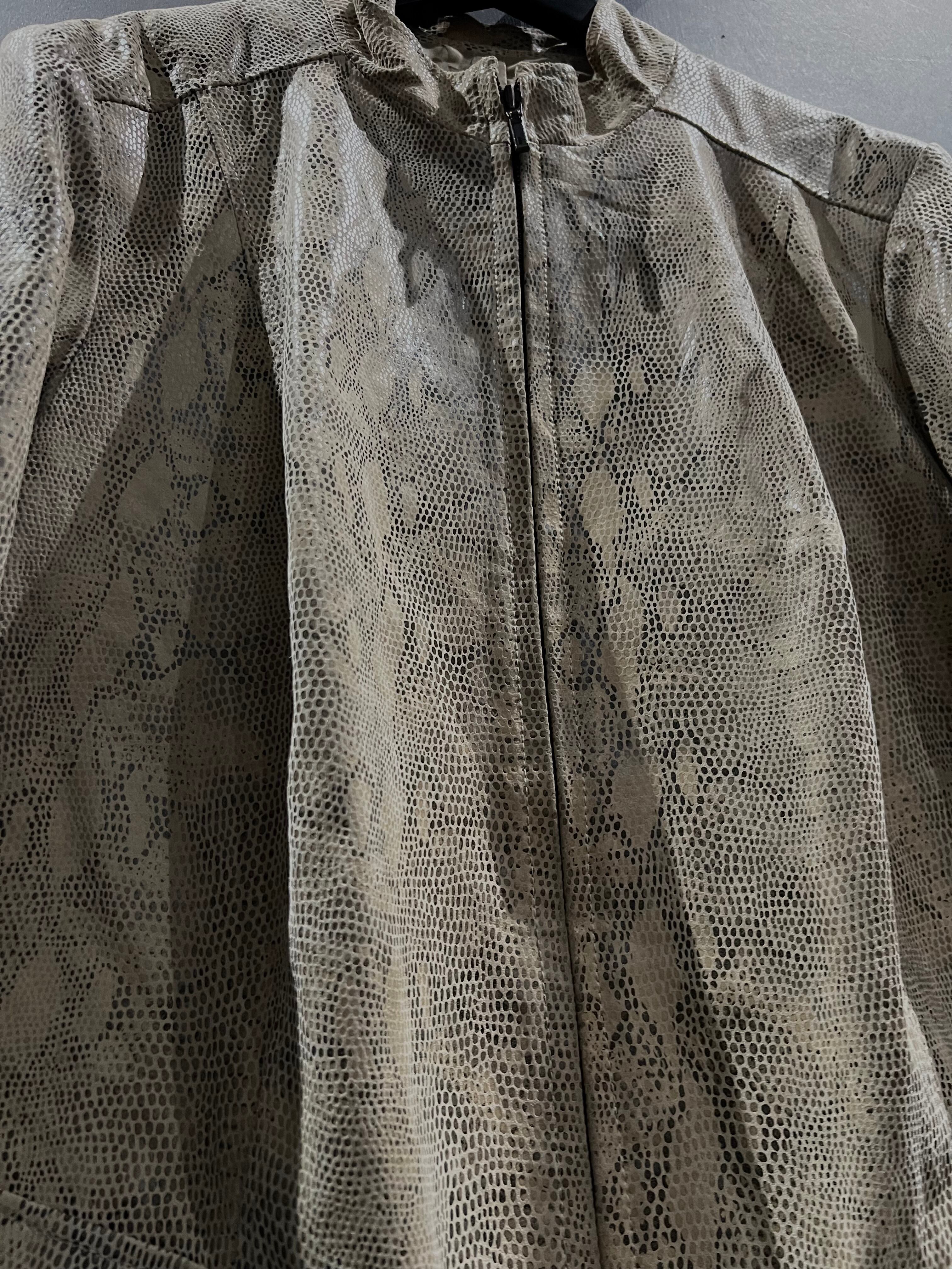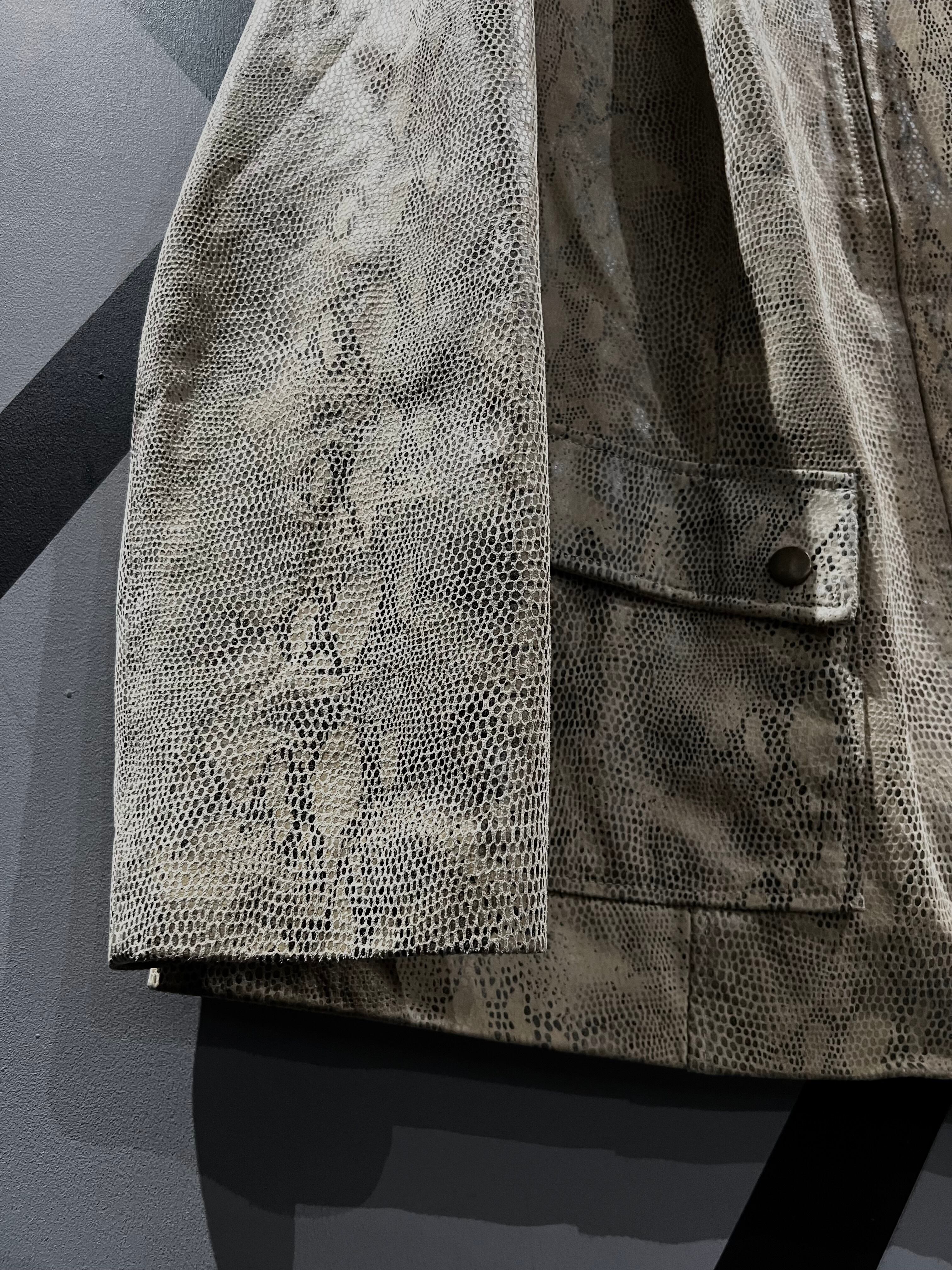 柔らかく薄手のリアルレザーに、コーティングによってパイソン柄を載せたジップアップジャケット。