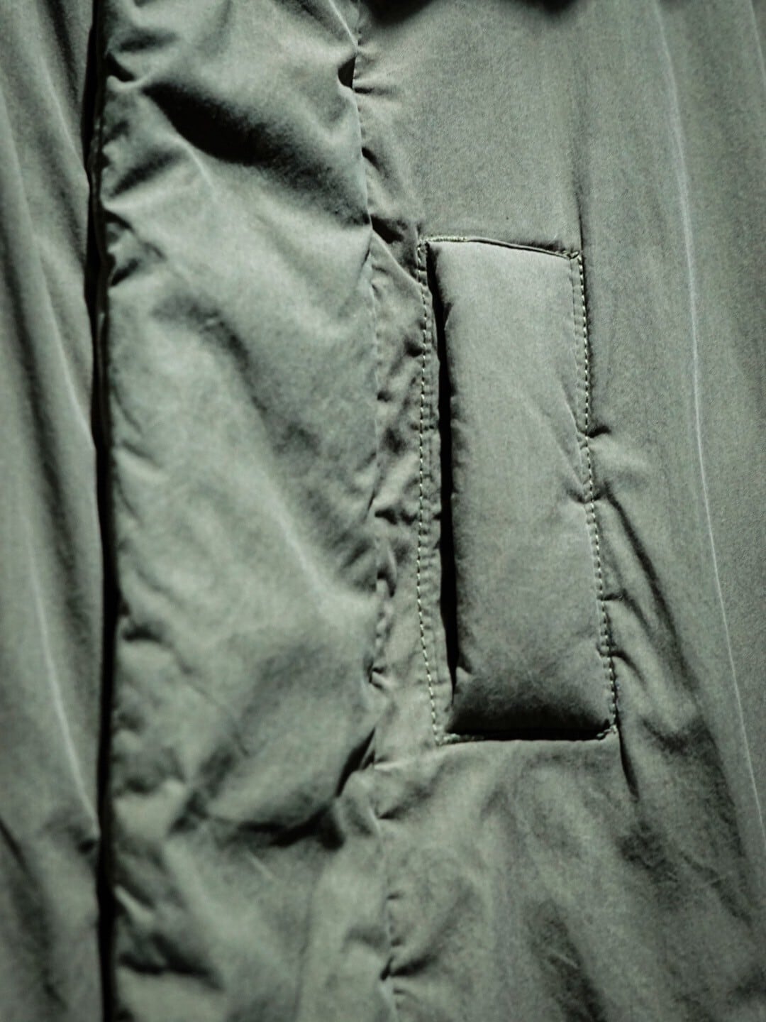 渋みのあるセージグリーンのボディに、ミリタリーのフィールドジャケットをモチーフにしたギミックを載せたダウンジャケット。