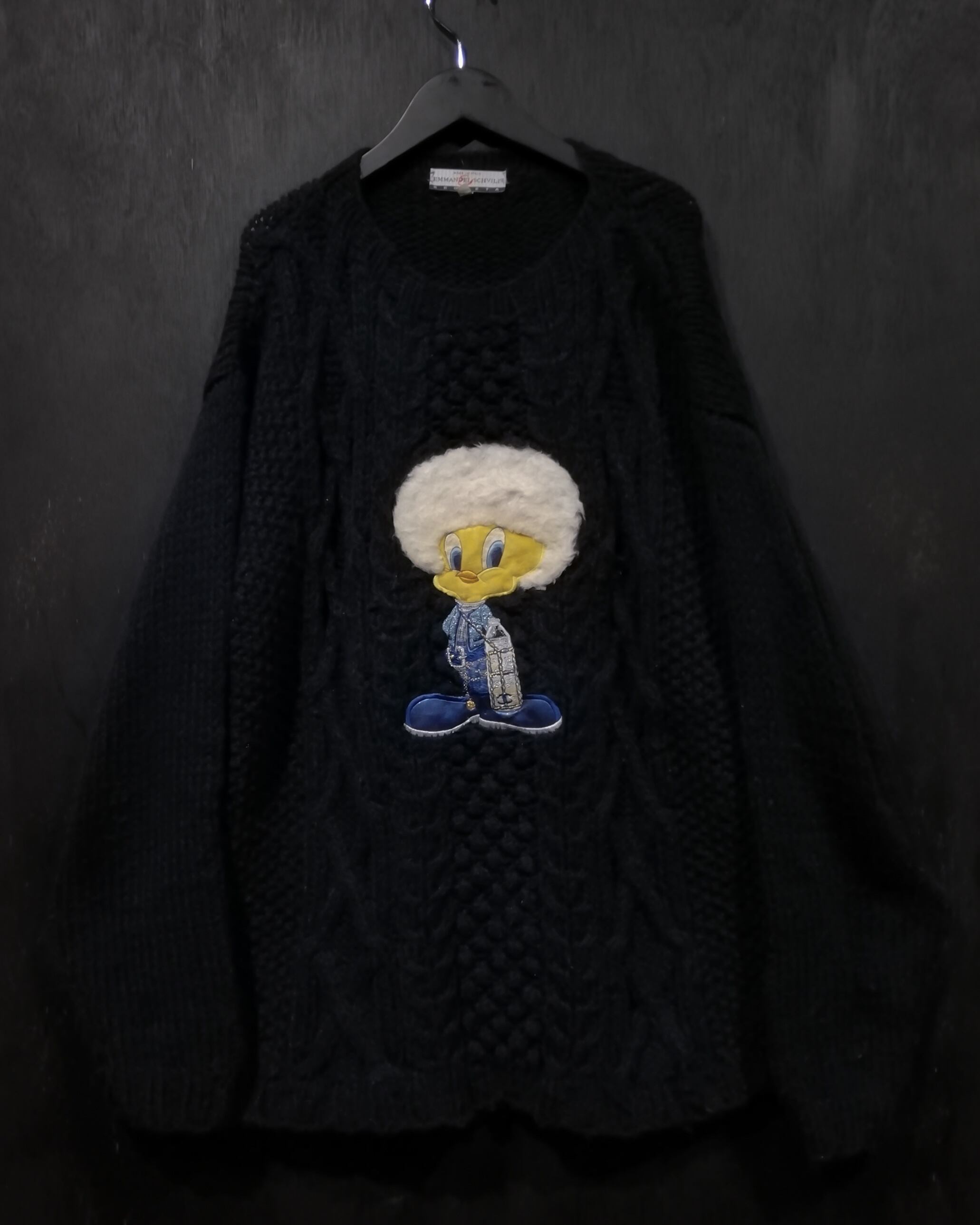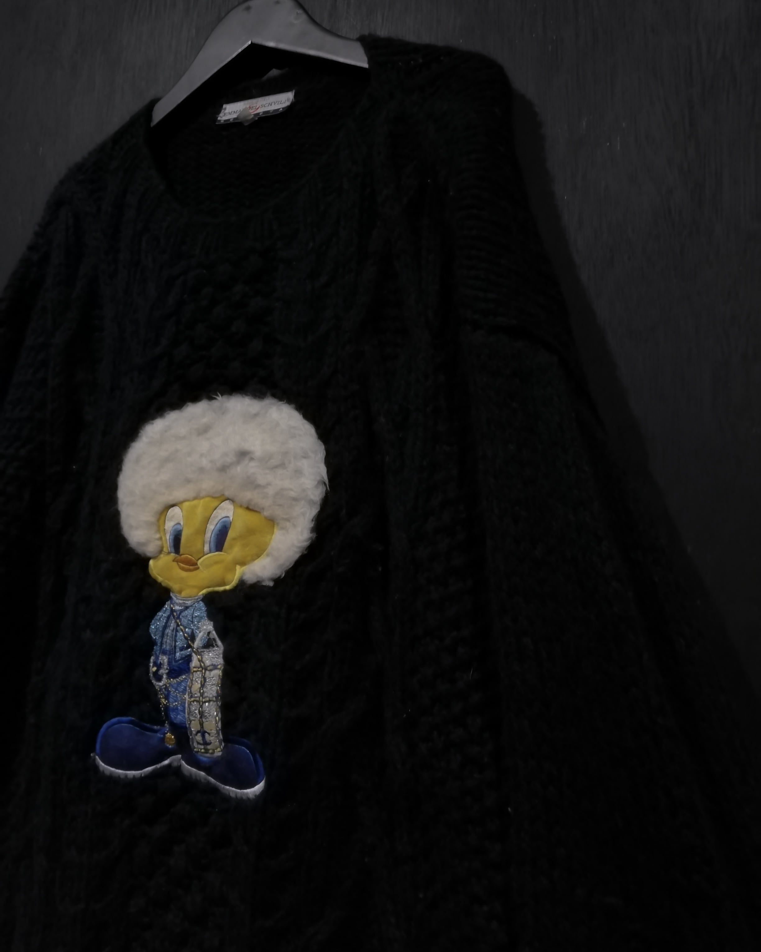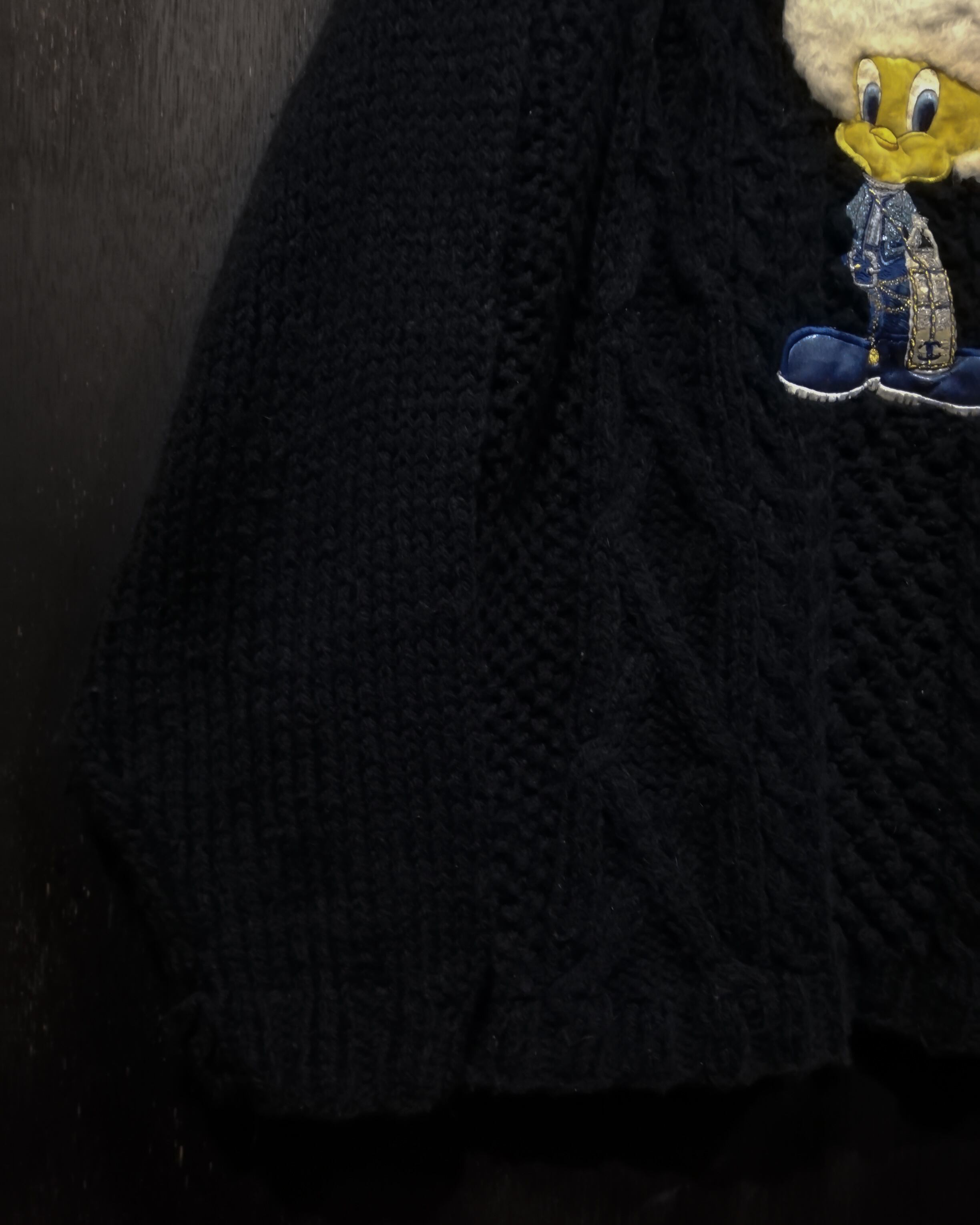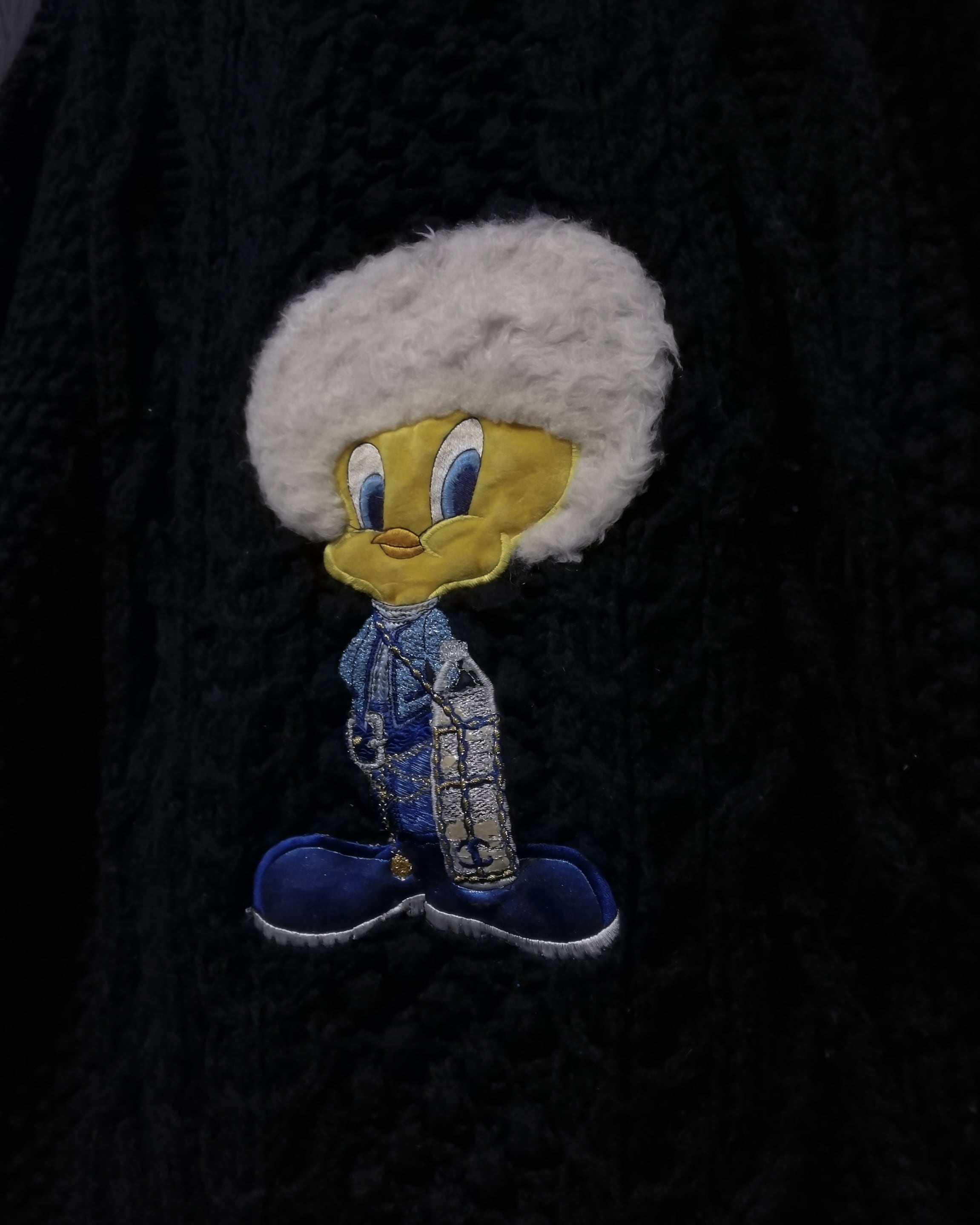 黒のケーブルニットをベースに、アメリカのワーナーブラザーズが制作するアニメシリーズ、"ルーニーテューンズ"に登場する"トゥイーティー"を載せた1着。