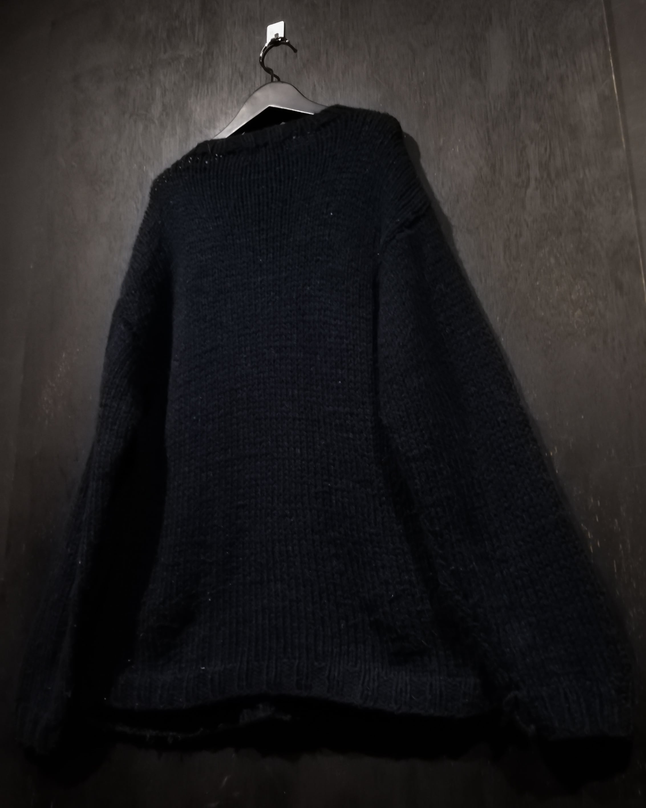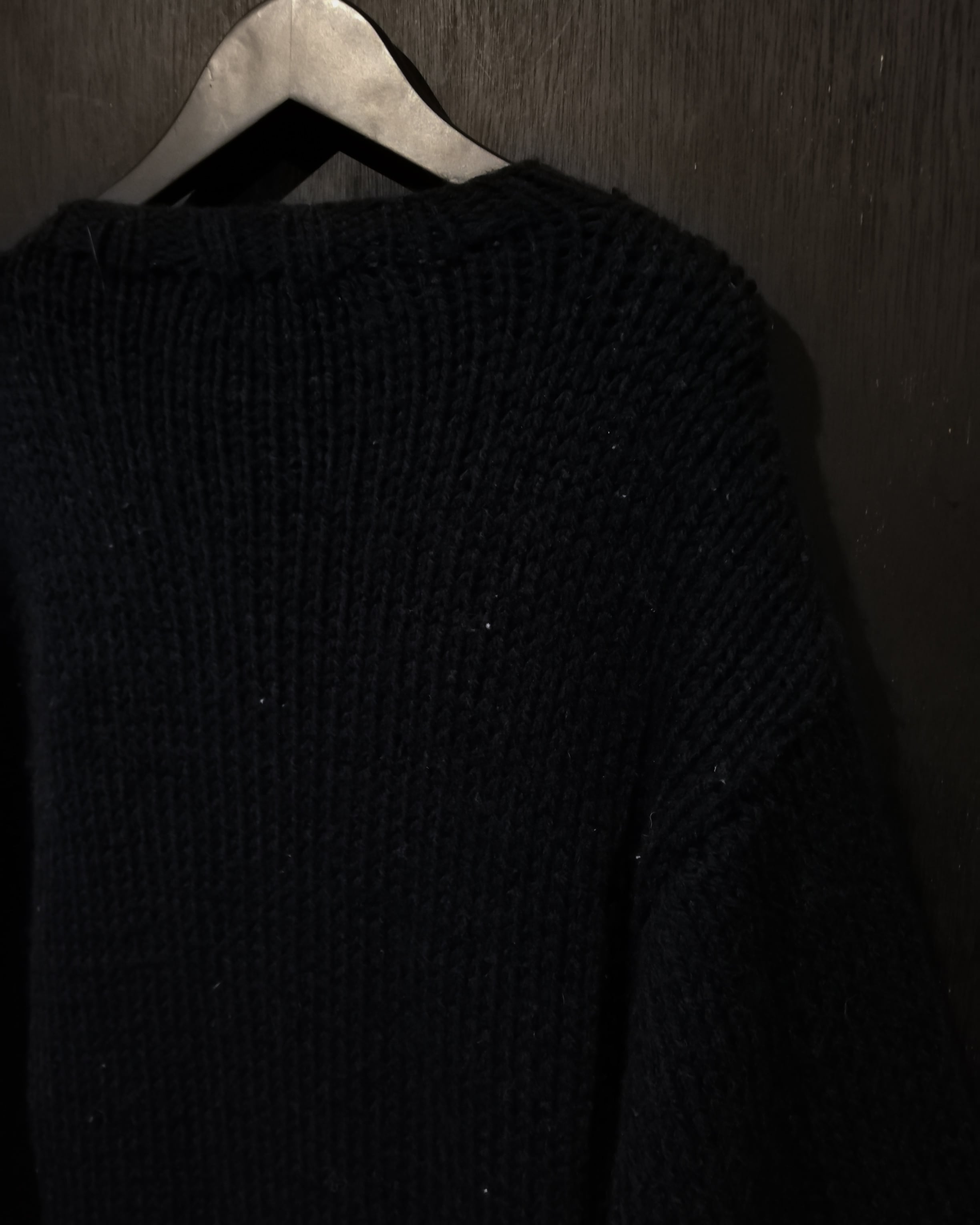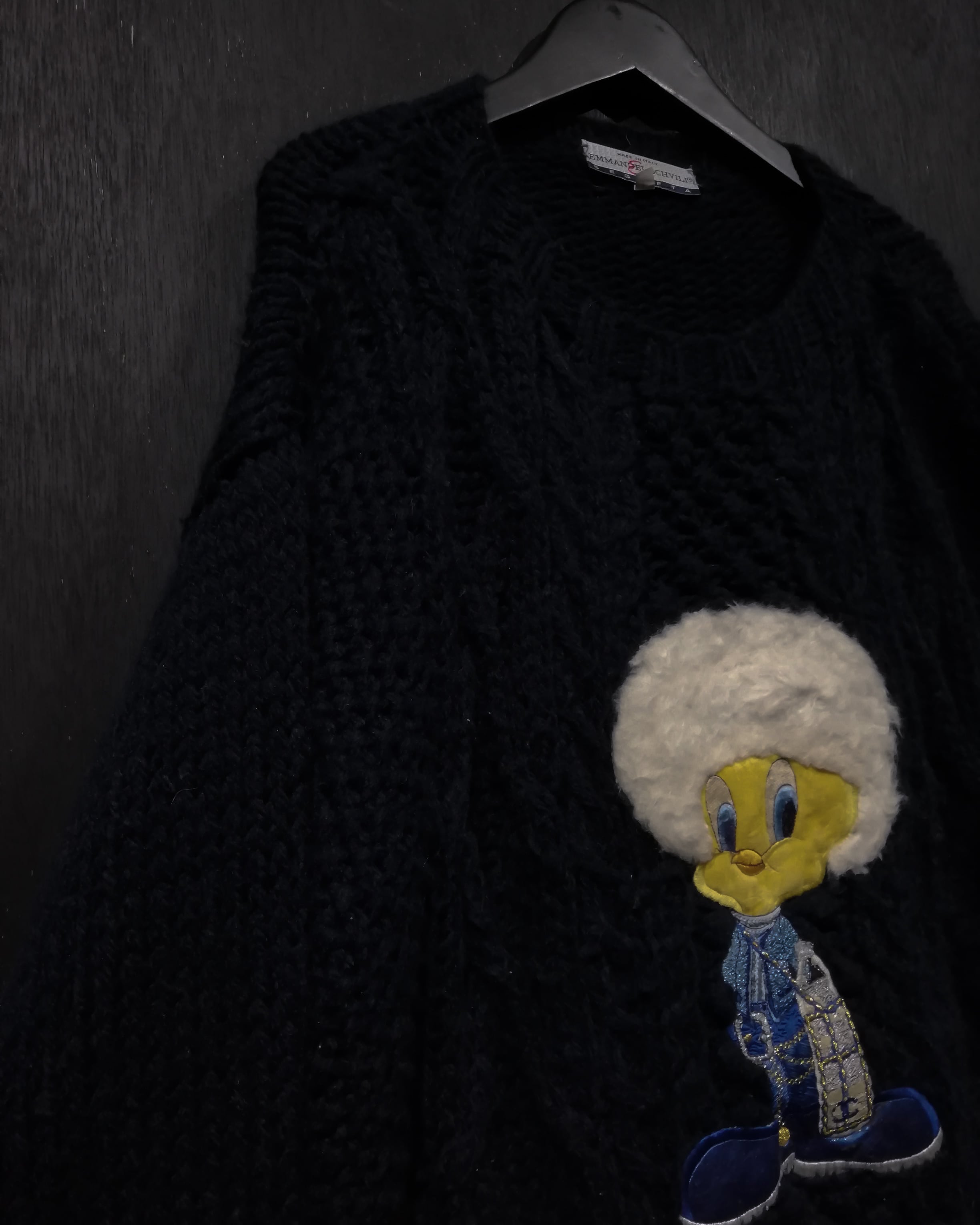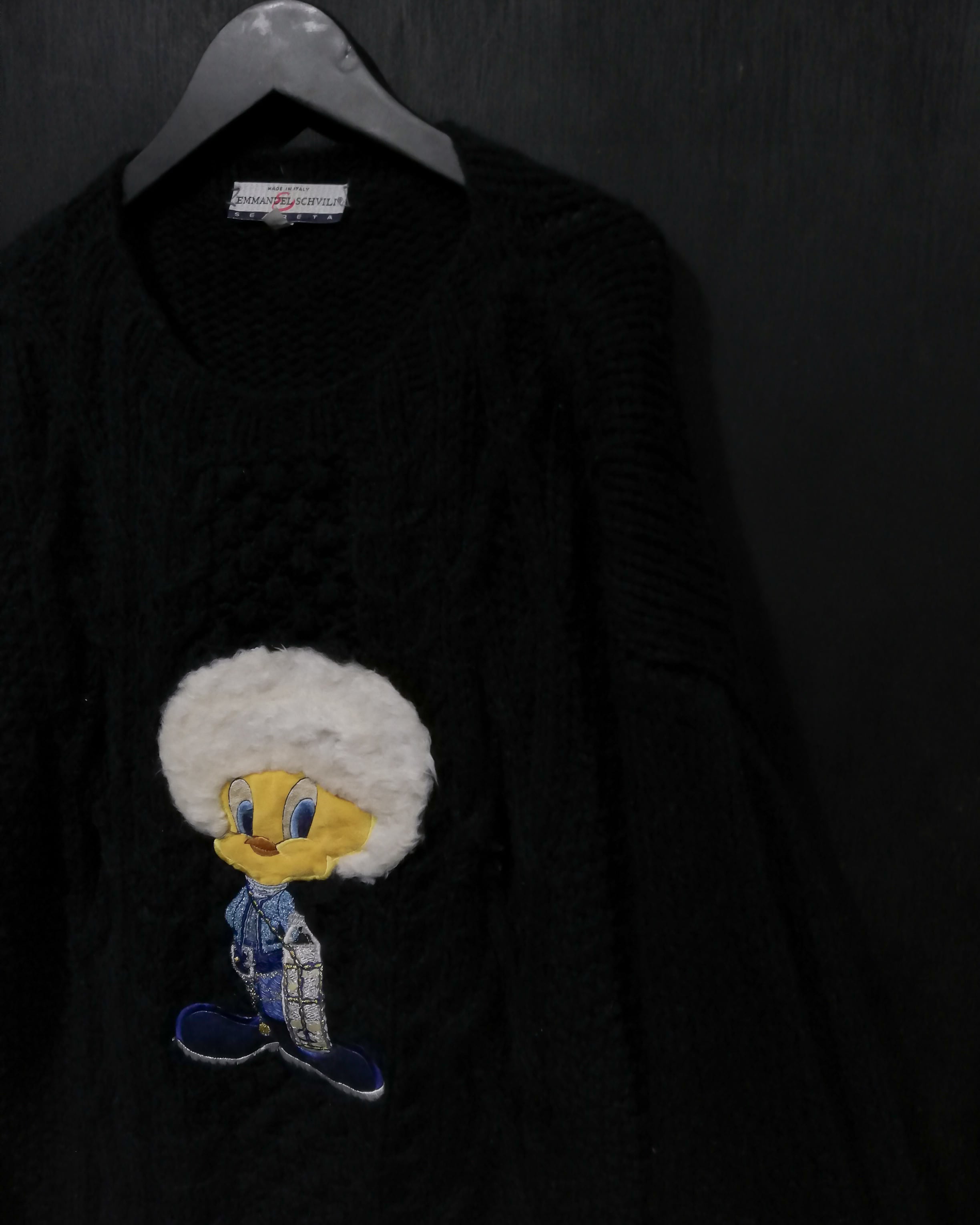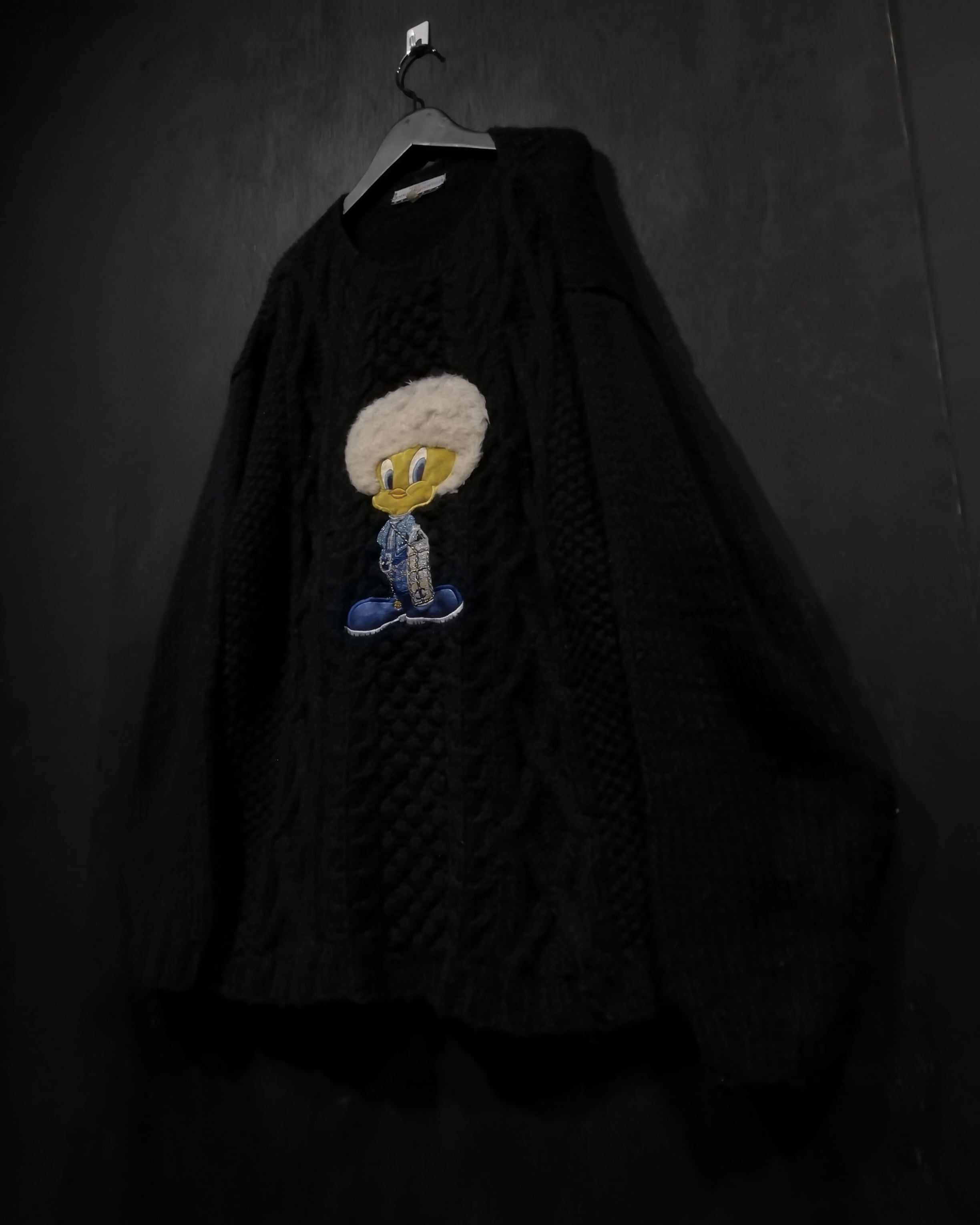 黒のケーブルニットをベースに、アメリカのワーナーブラザーズが制作するアニメシリーズ、"ルーニーテューンズ"に登場する"トゥイーティー"を載せた1着。