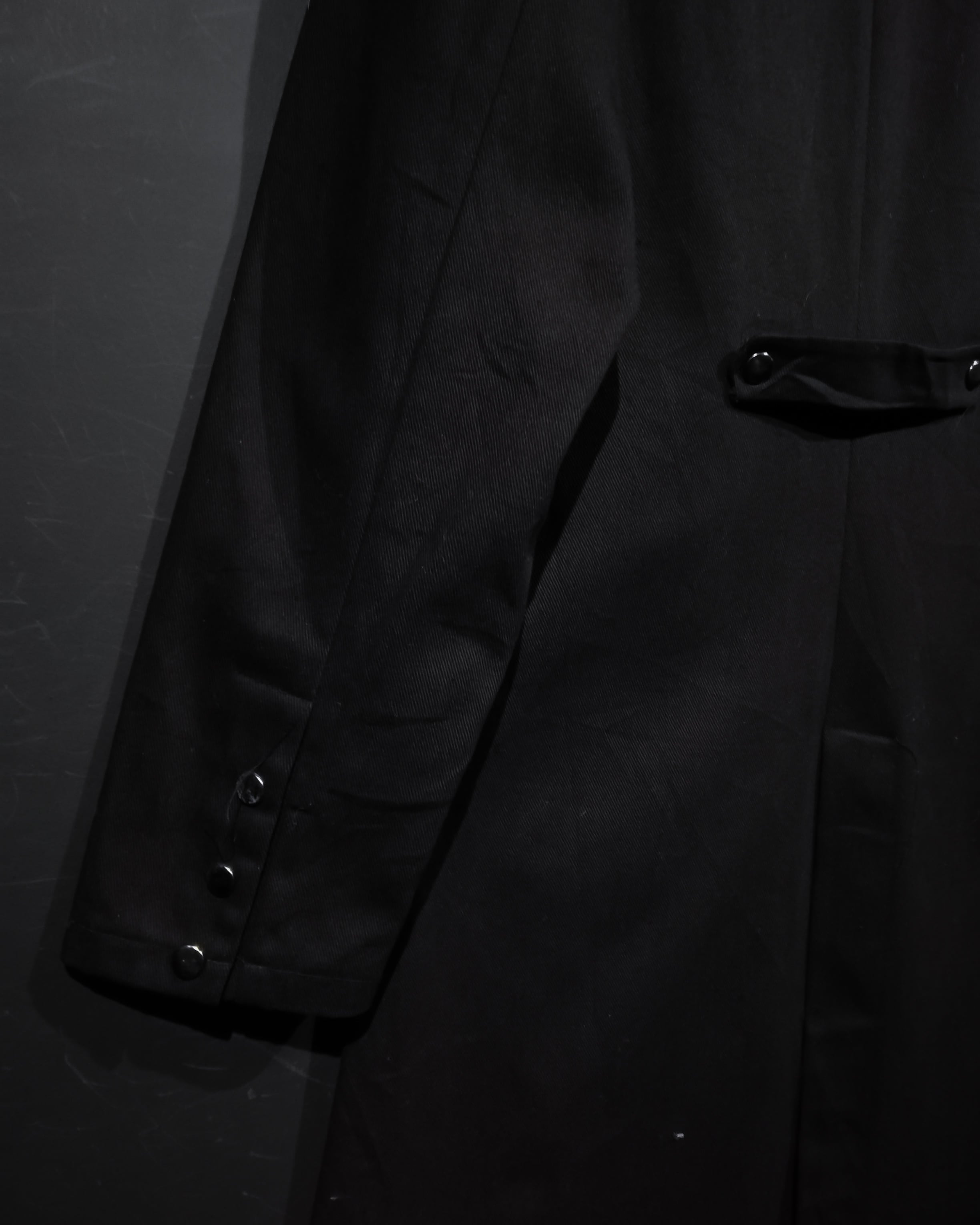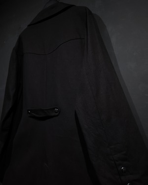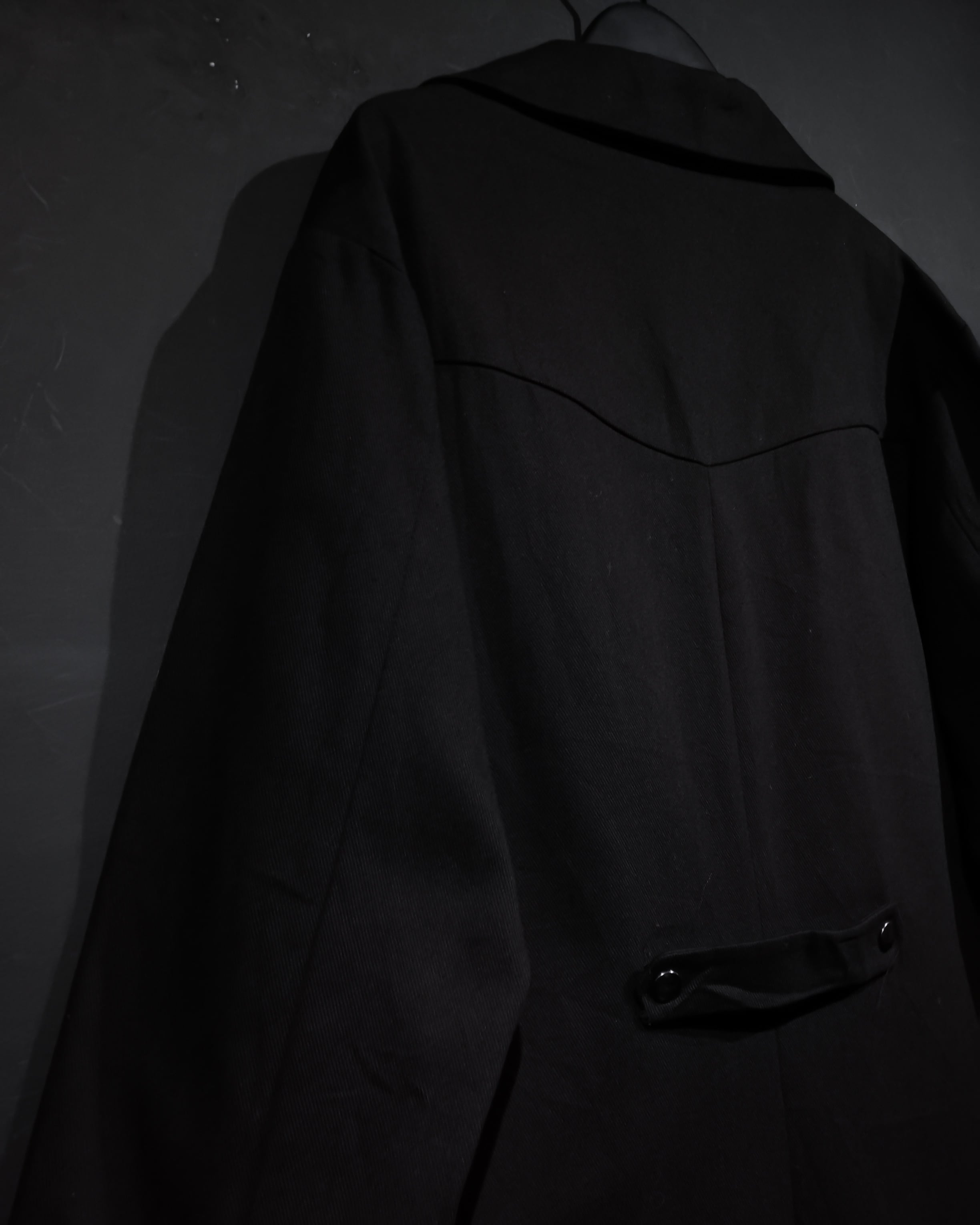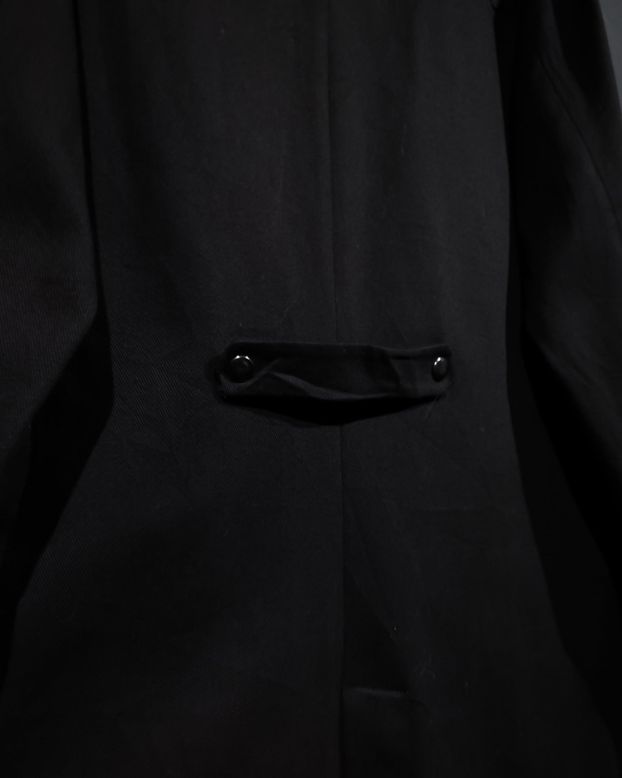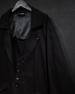 ハリのあるブラックのら生地を用いたコートに、フロントにはベストを重ねたような、レイヤード風のデザインを施した稀有なコート。