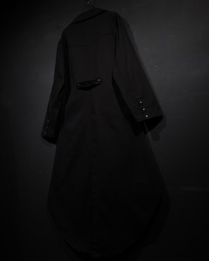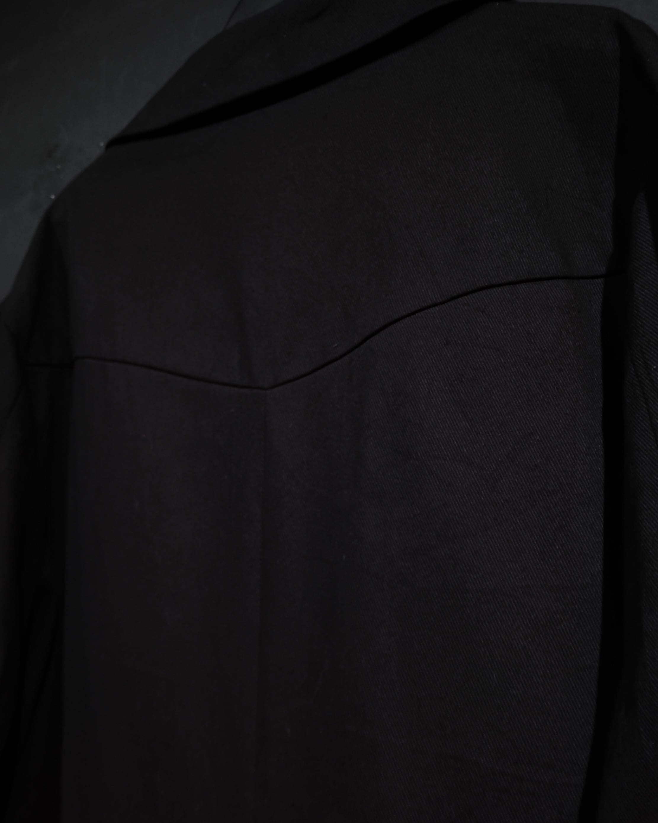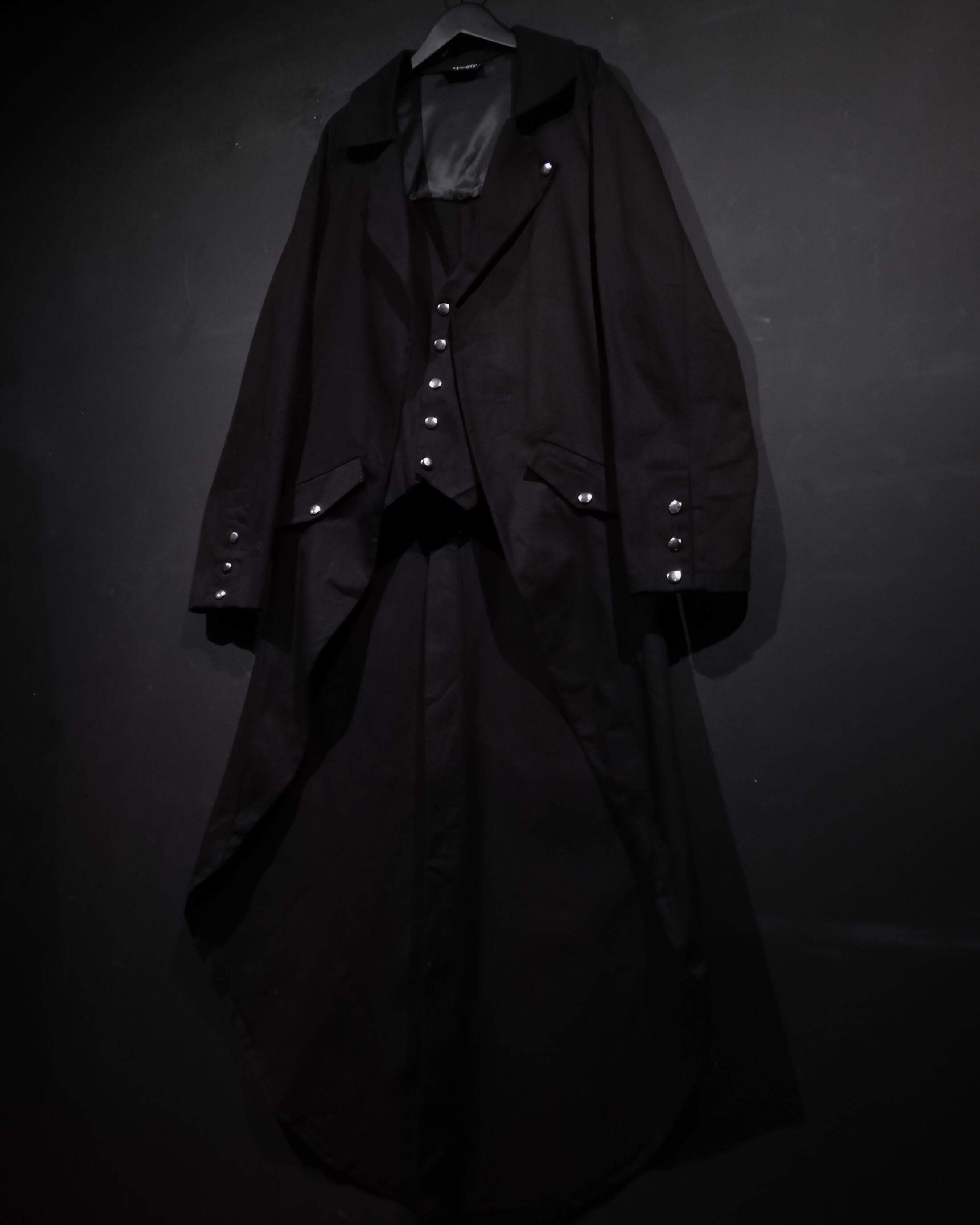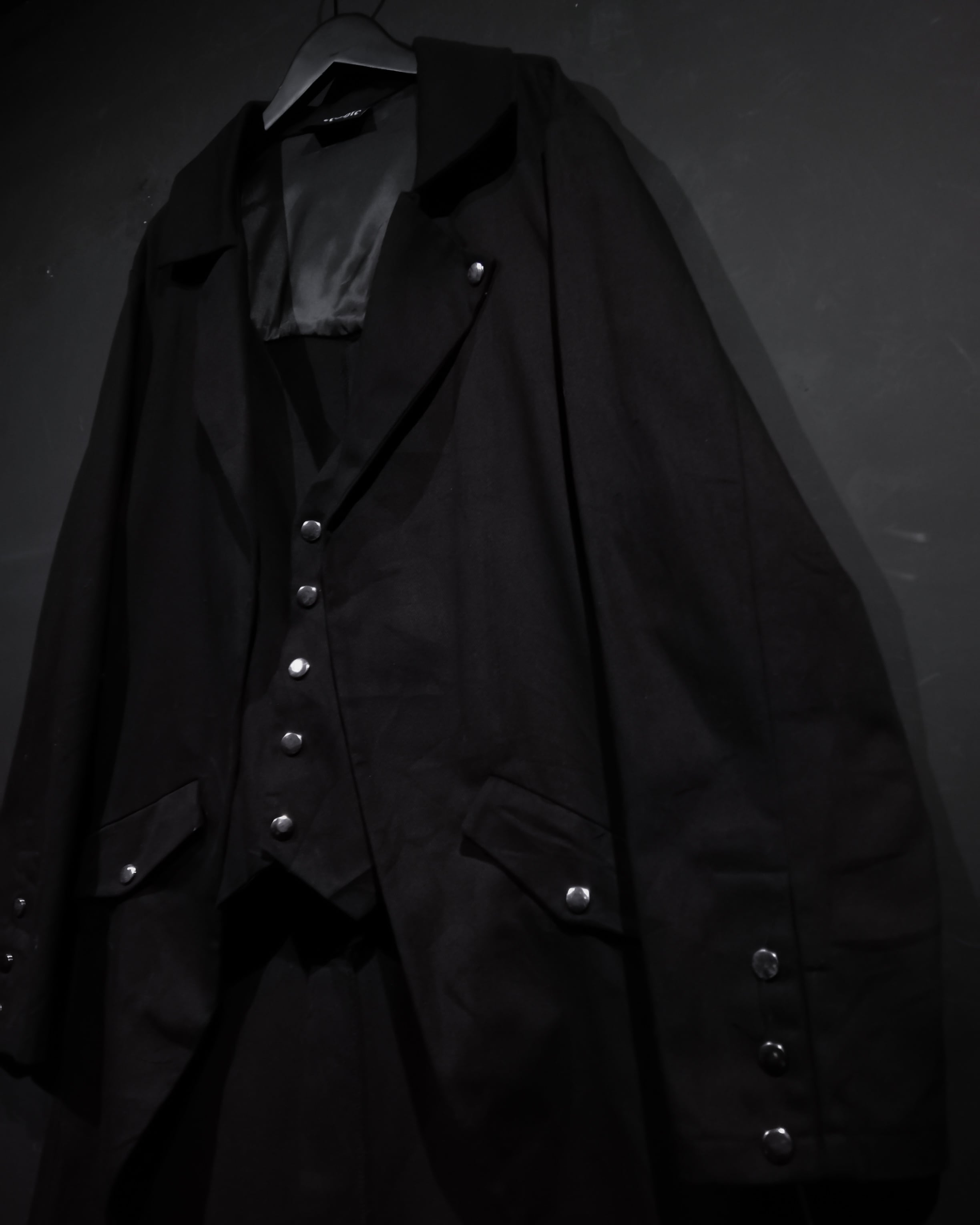 ハリのあるブラックのら生地を用いたコートに、フロントにはベストを重ねたような、レイヤード風のデザインを施した稀有なコート。